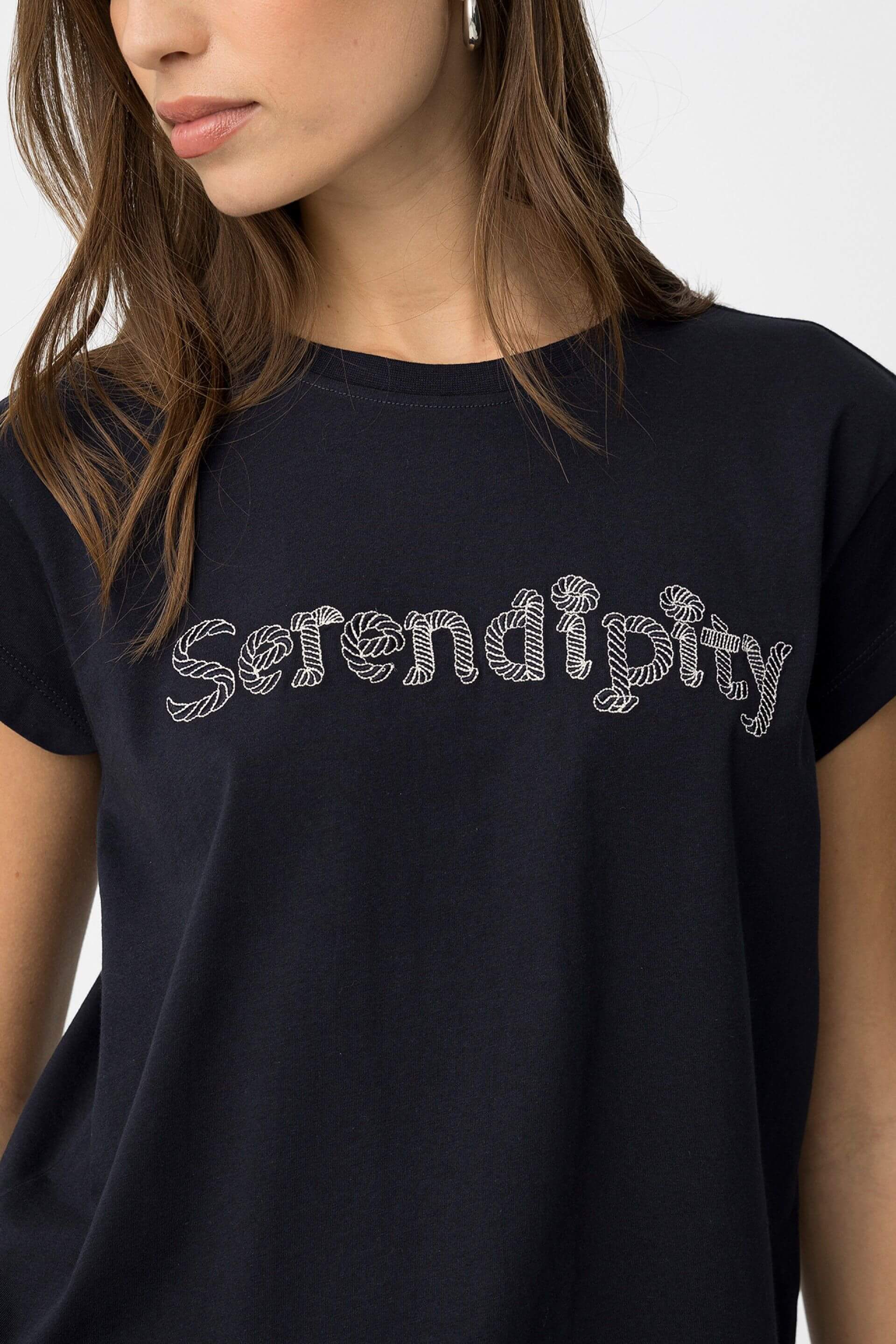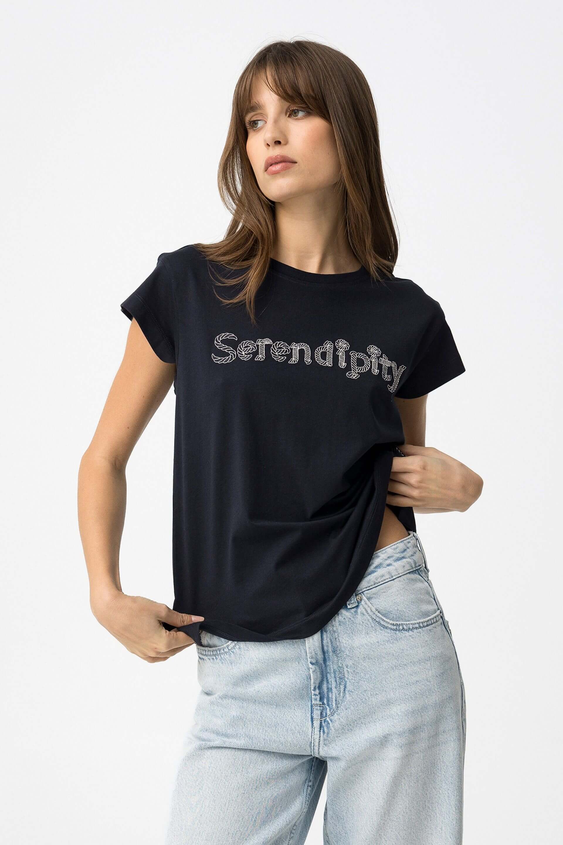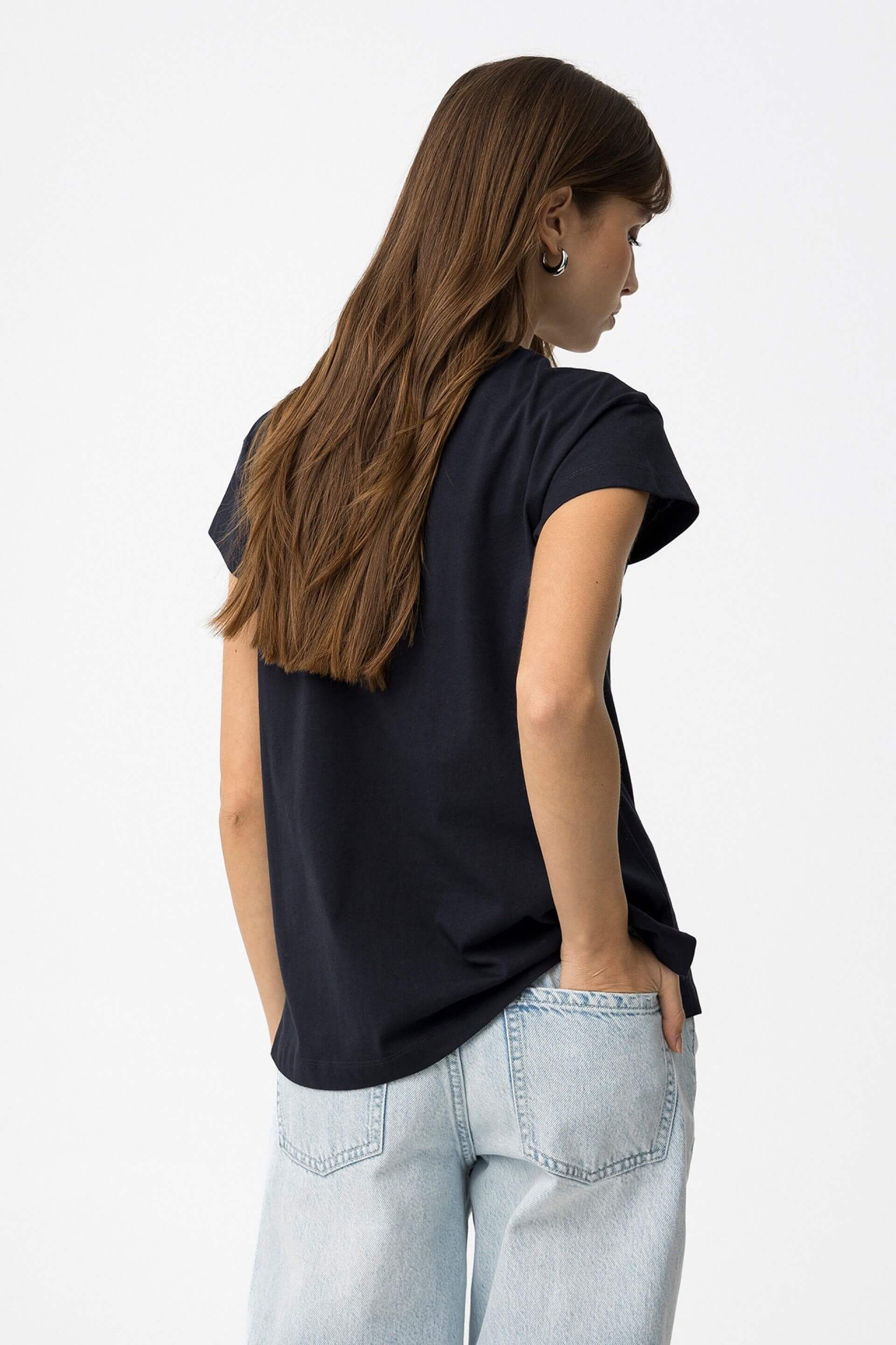 Conhecida por seu estilo urbano e design incomum, a Tiffosi incorpora detalhes inovadores. Assim é esta t-shirt azul escuro c/ estampa da Tiffosi. Apresenta manga curta e decote redondo. Para parte de baixo combina na perfeição com jeans, mas dentro do mesmo estilo. A modelo está a vestir o tamanho S.
