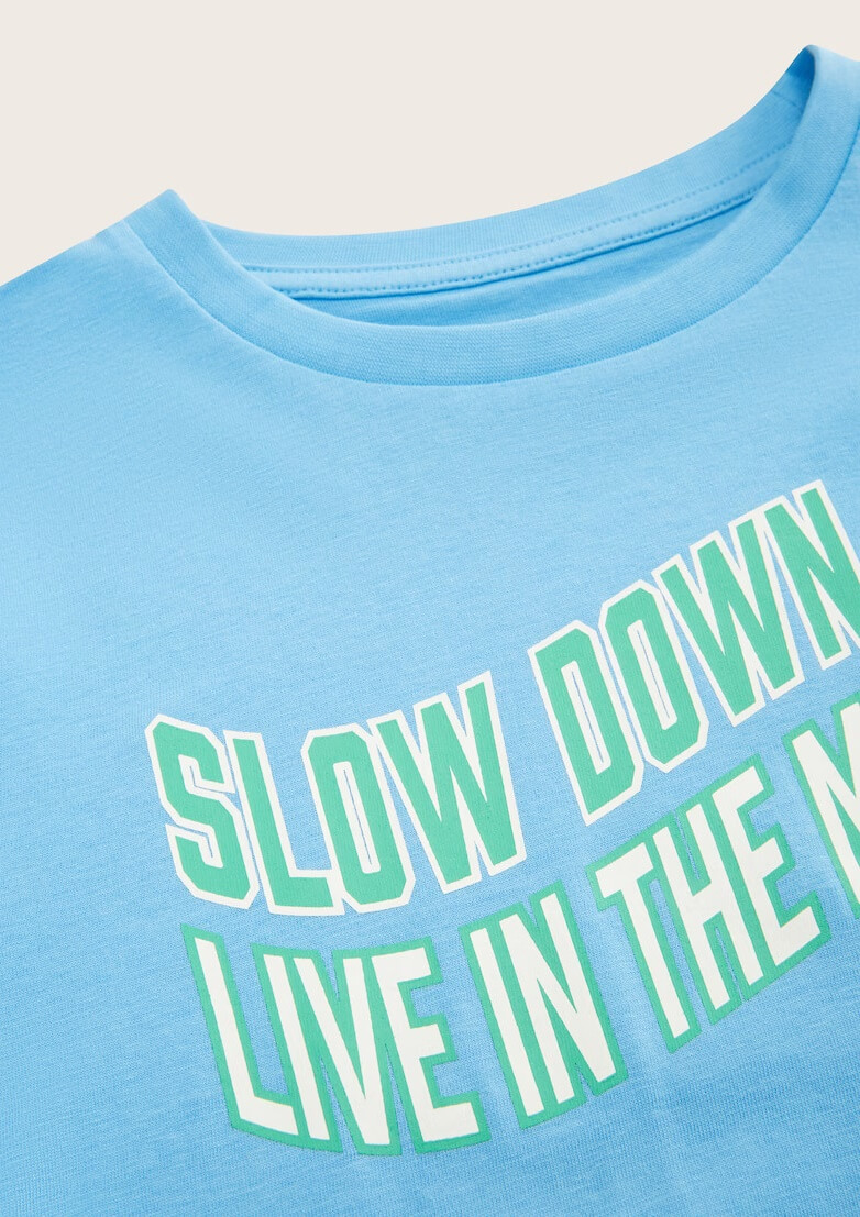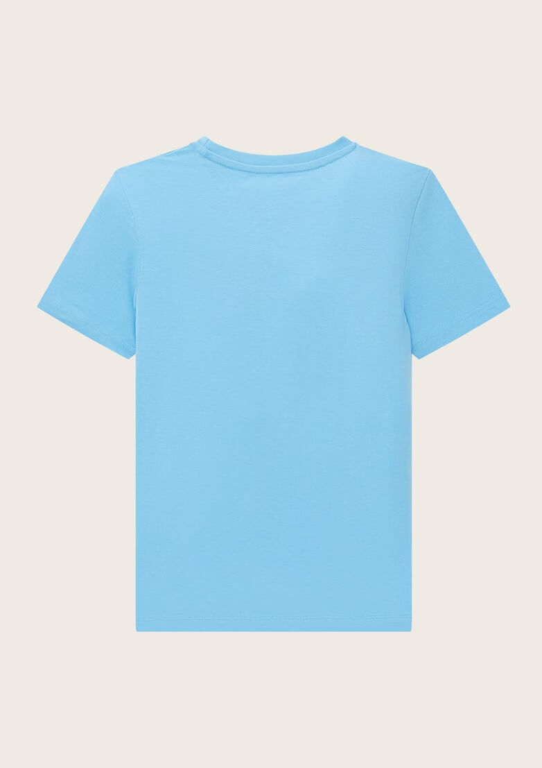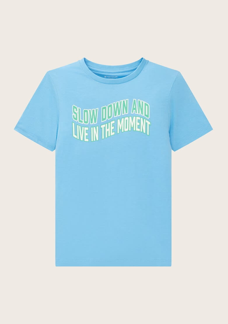 Conhecida por seu estilo urbano e design incomum, a Tom Tailor incorpora detalhes inovadores. Combinados com silhuetas inspiradas em streetwear e uma estética jovial. Assim é esta t-shirt azul slow da Tom Tailor. Tem decote redondo e manga curta. Para parte de baixo combina na perfeição com jeans, mas dentro do mesmo estilo. A imagem está no tamanho 9-10 anos / 140 cm.