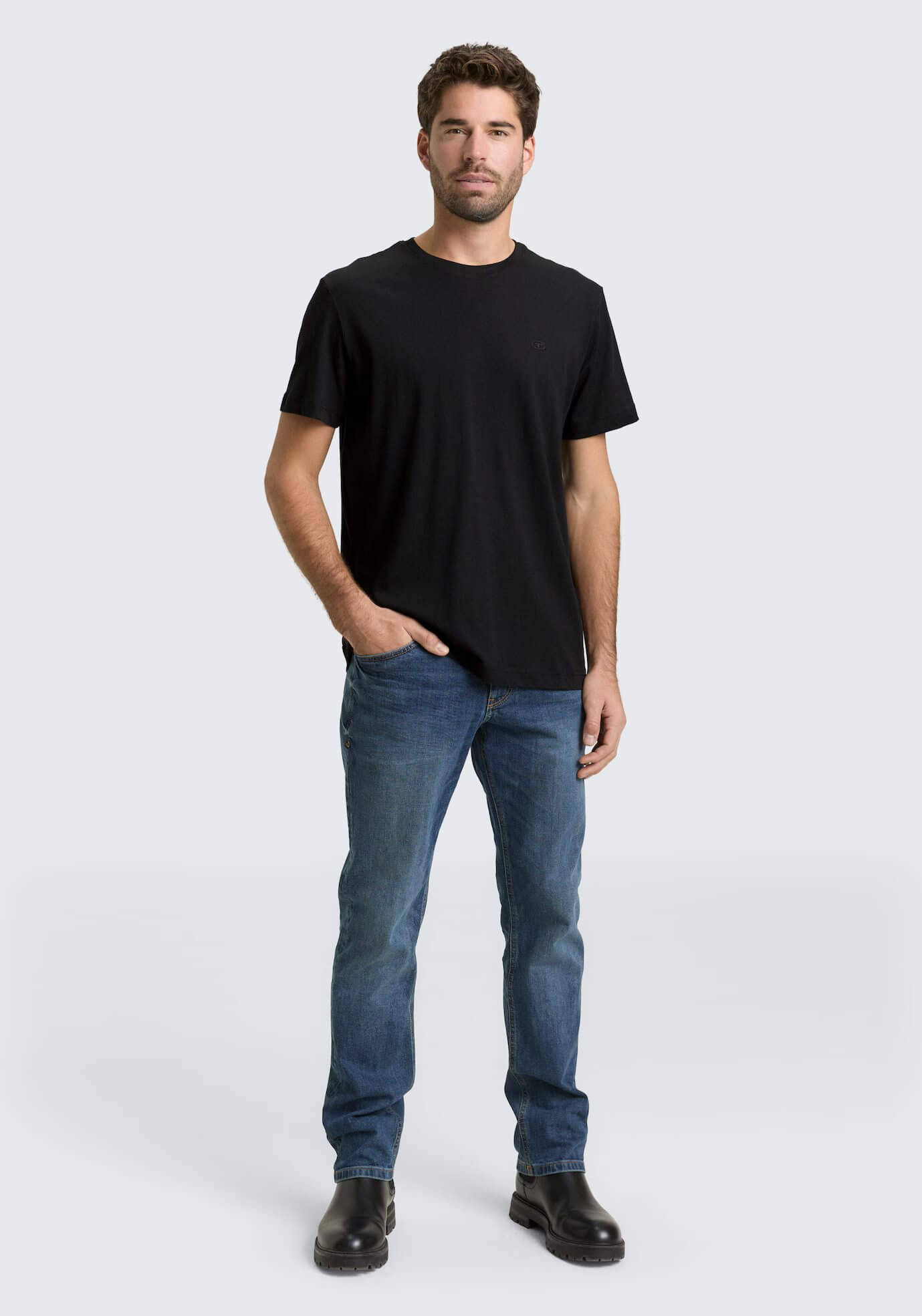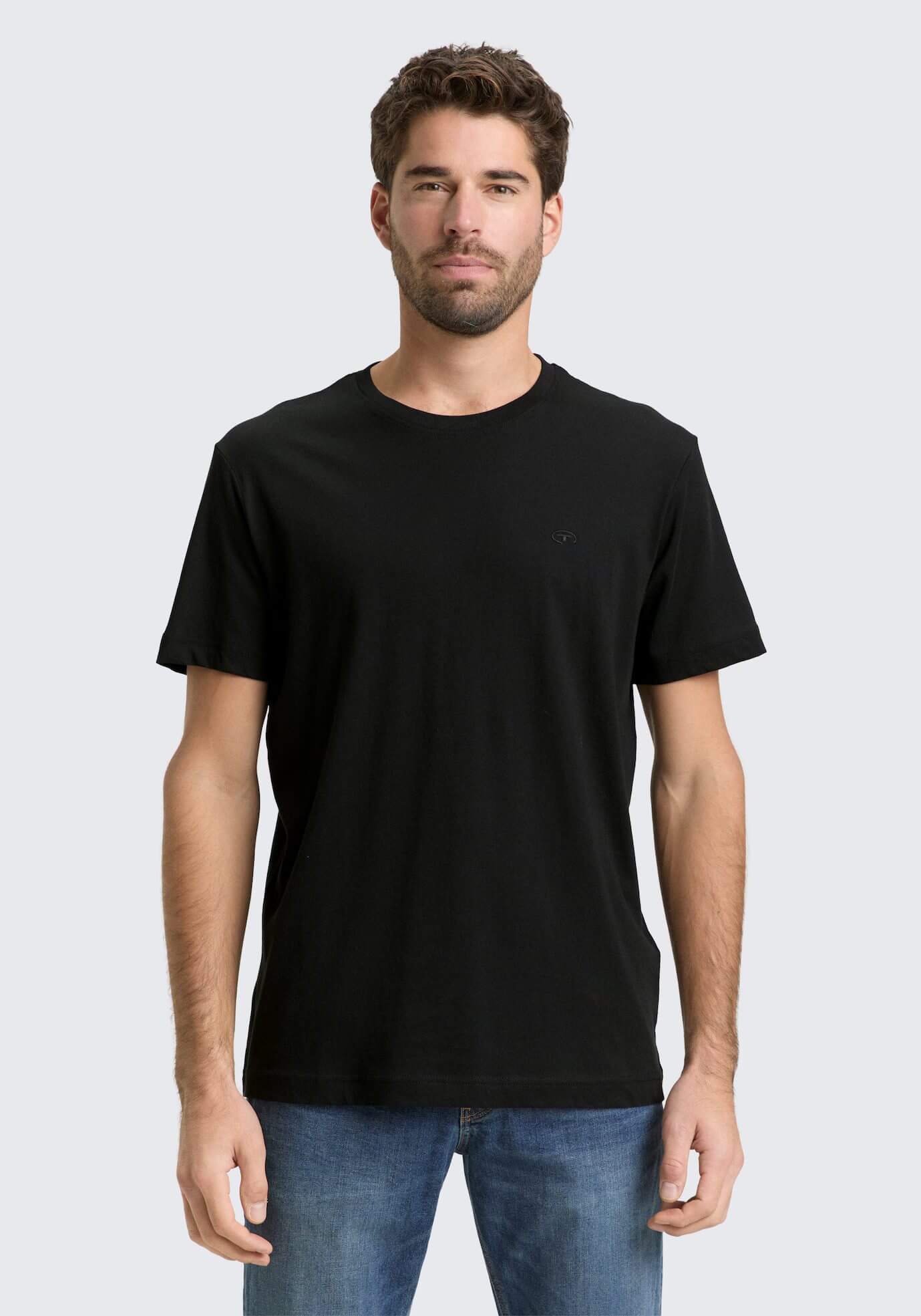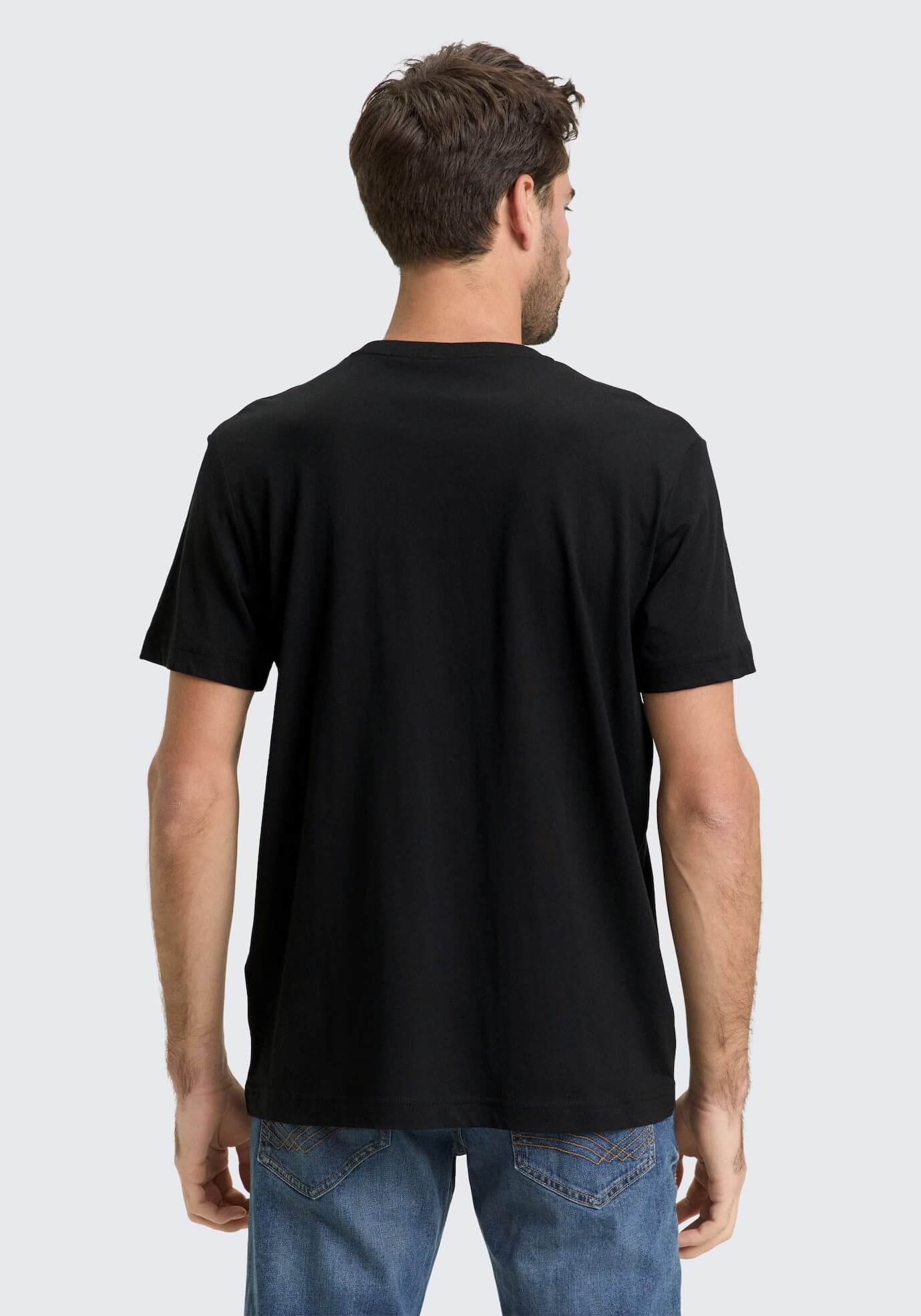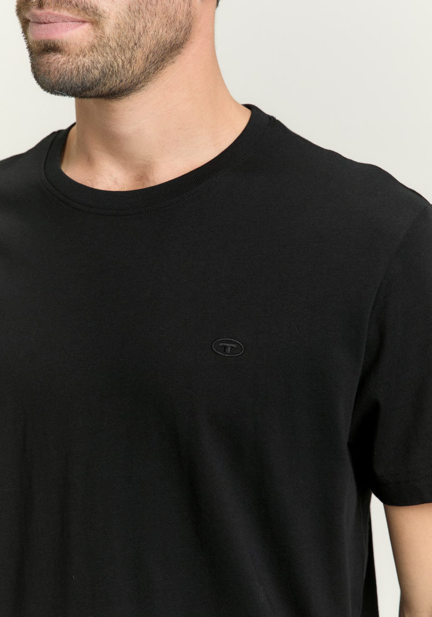 Conhecida por seu estilo urbano e design incomum, a Tom Tailor incorpora detalhes inovadores. Combinados com silhuetas inspiradas em streetwear e uma estética jovial. Assim é esta t-shirt básica preta da Tom Tailor. Apresenta manga curta e decote redondo. Para parte de baixo combina na perfeição com jeans, mas dentro do mesmo estilo. O modelo está a vestir o tamanho S.