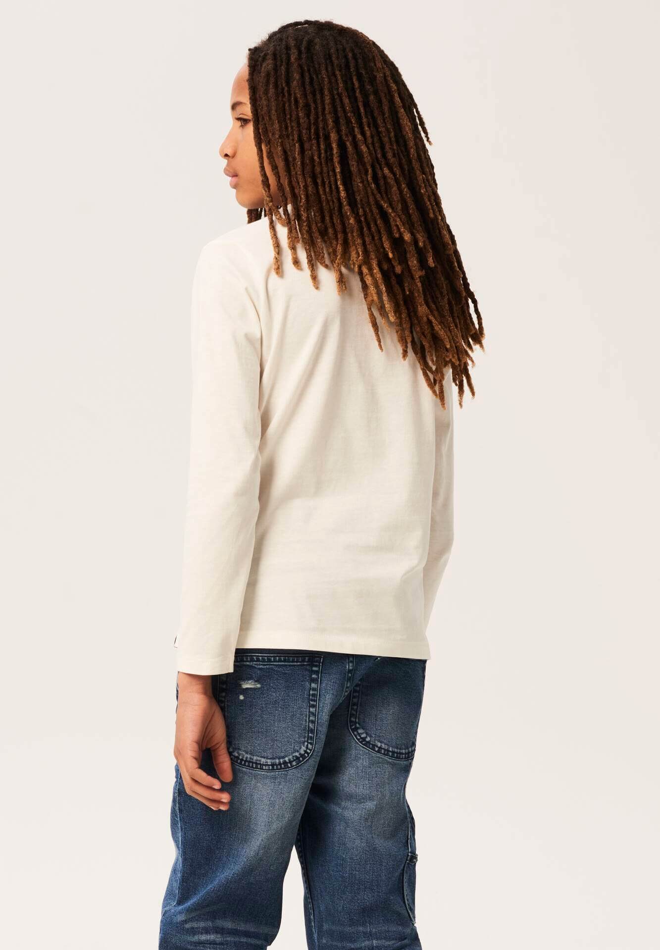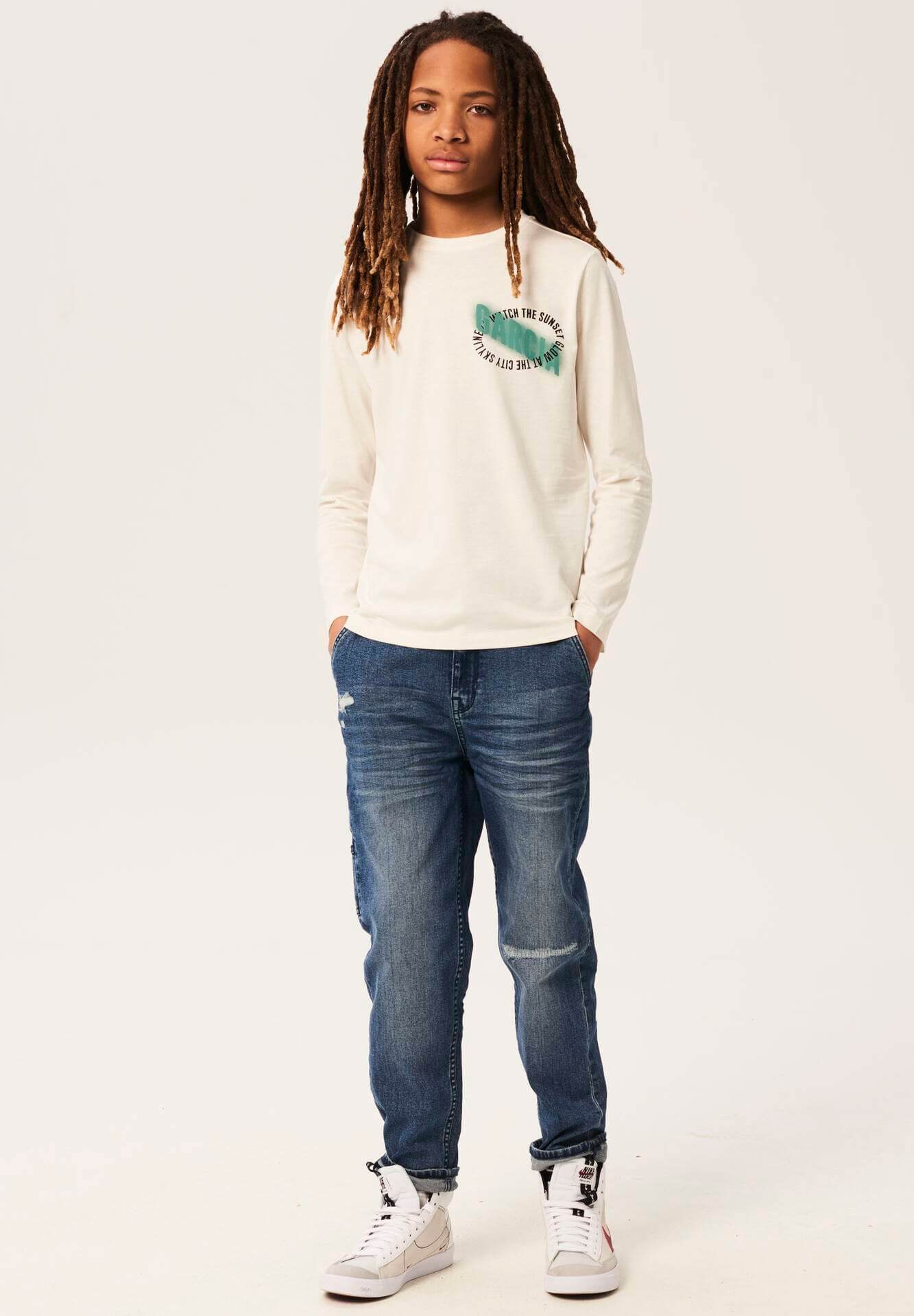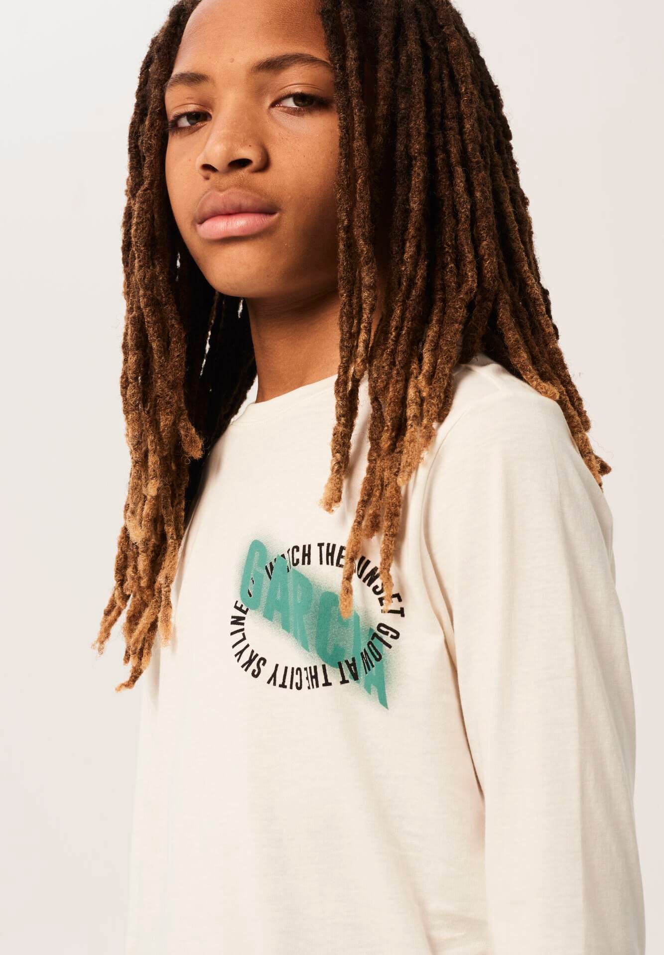 Combinando a história dos fundadores da Garcia Jeans, Maurizio e Isabella Gracia, as suas coleções produzem uma seleção forte de roupas de dia a dia que inspirou o amor do fundador de fazer com que as meninas parecessem mais bonitas no seu dia-a-dia. Assim é esta t-shirt bege c/ logo na frente da Garcia Jeans. Tem decote rdondo e manga comprida. Combina para parte de baixo com jeans mas dentro do mesmo estilo. A modelo está a vestir o 9-10 anos / 140 cm.