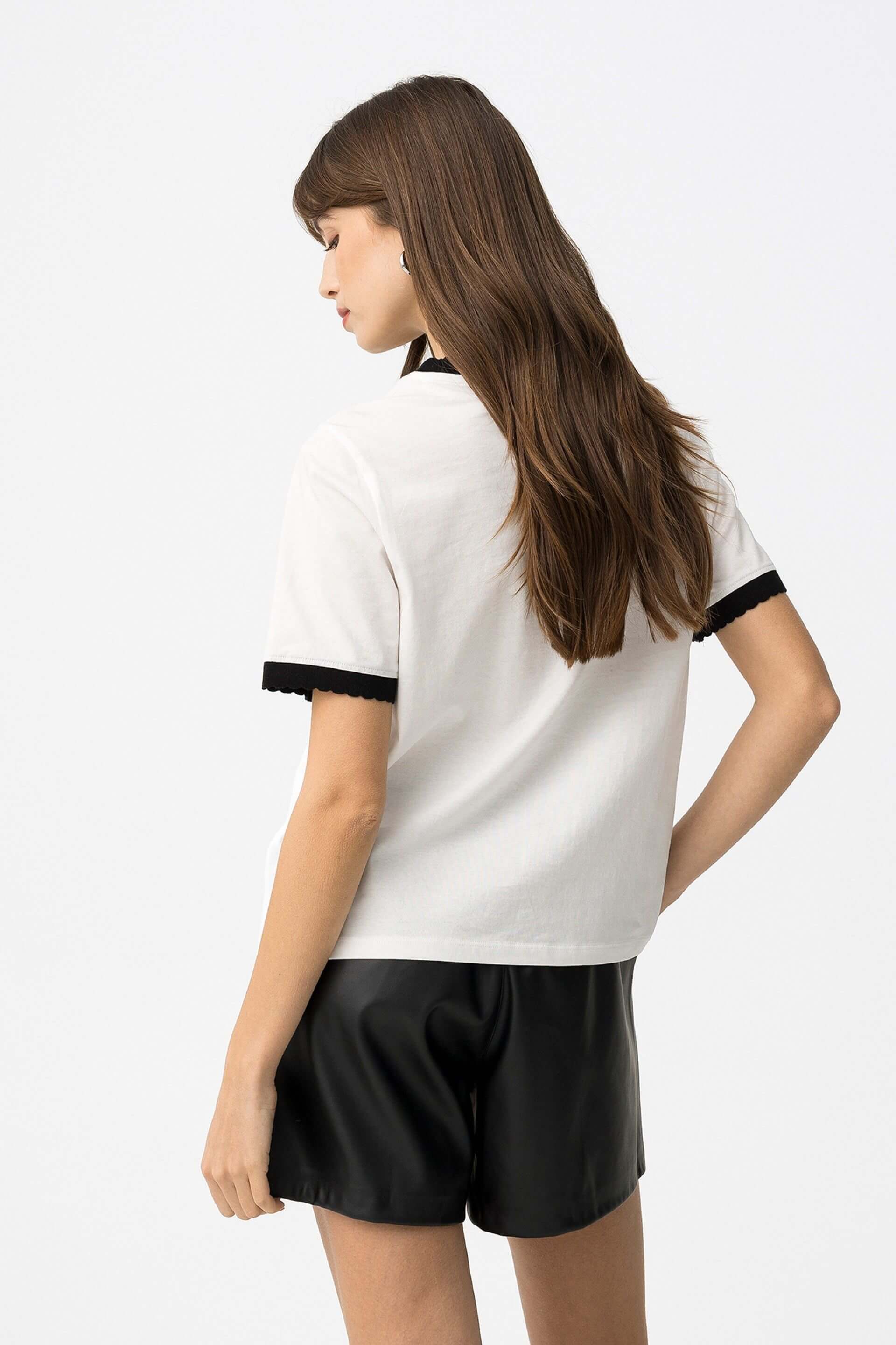 Conhecida por seu estilo urbano e design incomum, a Tiffosi incorpora detalhes inovadores. Assim é esta t-shirt branca c/ apontamentos em preto da Tiffosi. Apresenta manga curta e decote redondo. Para parte de baixo combina na perfeição com jeans, mas dentro do mesmo estilo. A modelo está a vestir o tamanho S.