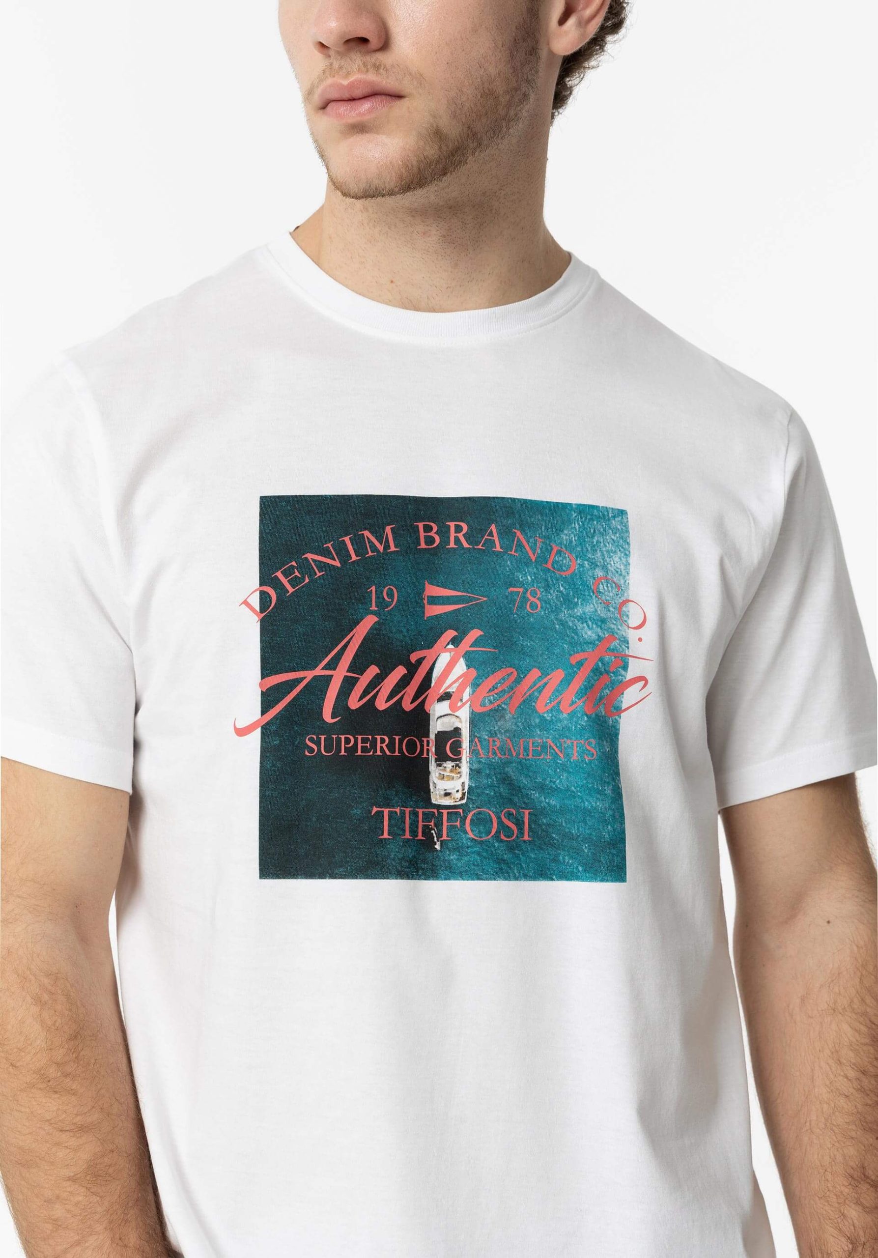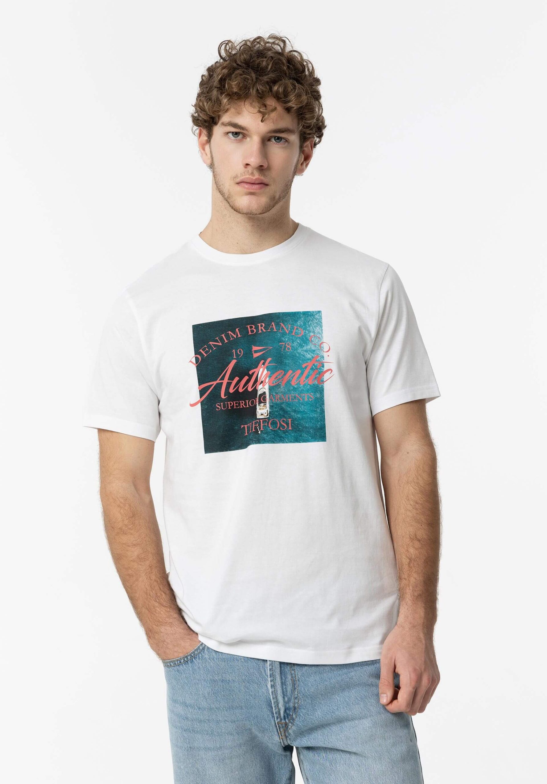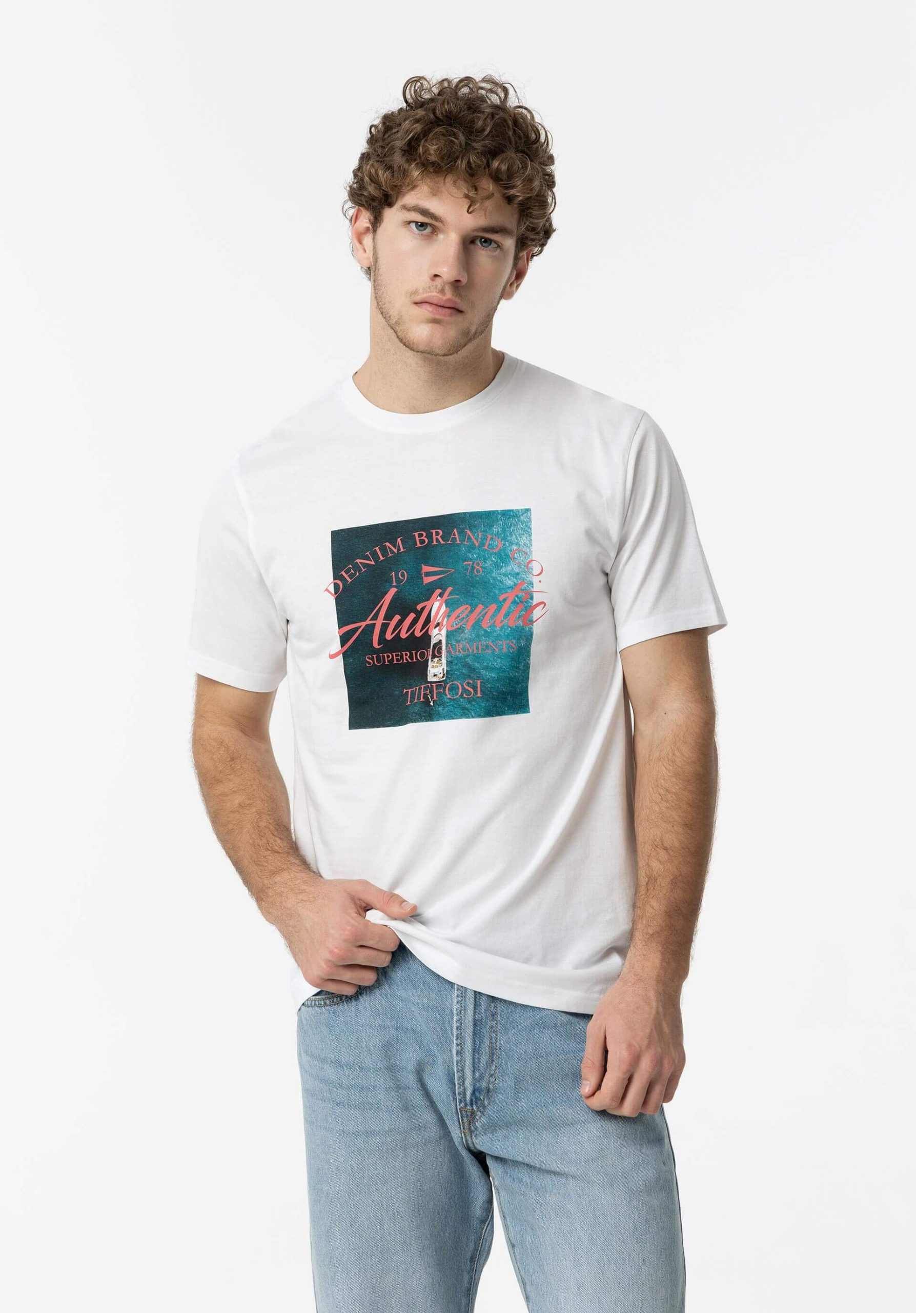 Conhecida por seu estilo urbano e design incomum, a Tiffosi incorpora detalhes inovadores. Combinados com silhuetas inspiradas em streetwear e uma estética jovial. Assim é esta t-shirt branca c/ estampa da Tiffosi. Tem manga curta e decote redondo. Para parte de baixo combina na perfeição com jeans, mas dentro do mesmo estilo. O modelo está a vestir o M.