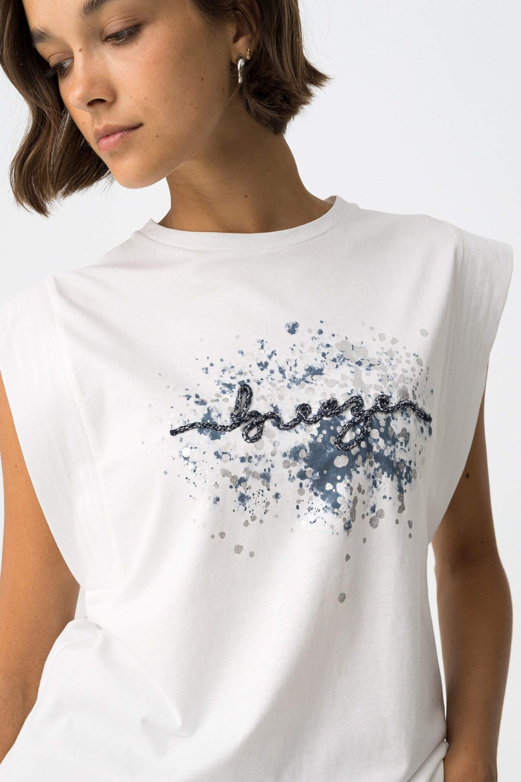 Pense em silhuetas dos anos 80, painéis pesados, denim super skinny e estampas de bandana. Pois bem essa era voltou aos dias de hoje. Assim é esta t-shirt branca c/ estampa da Tiffosi. Apresenta decote redondo e manga curta. Para parte de baixo combina na perfeição com jeans mas a dar com o tom. A manequim está a vestir o tamanho S.