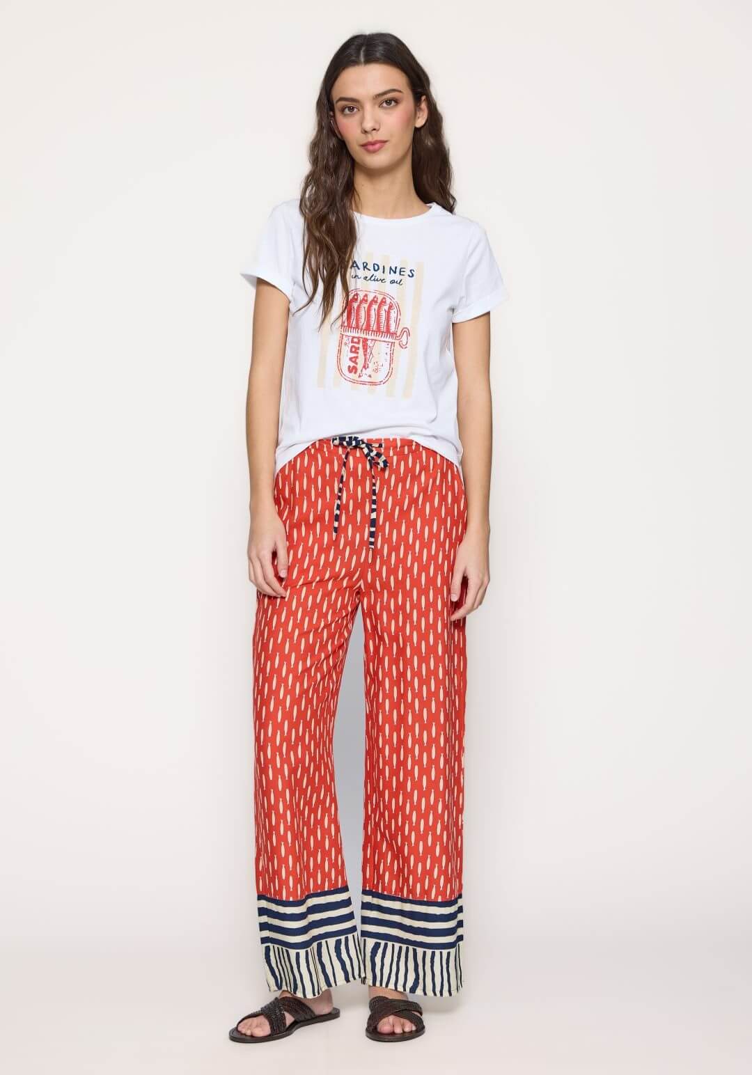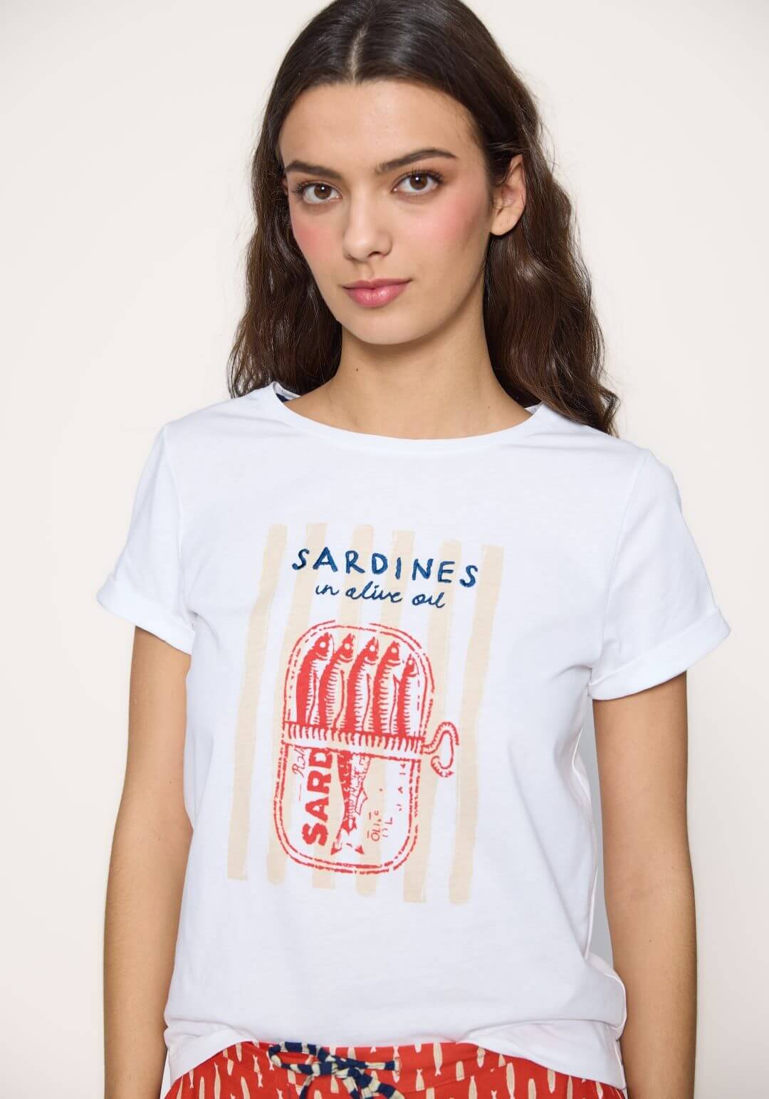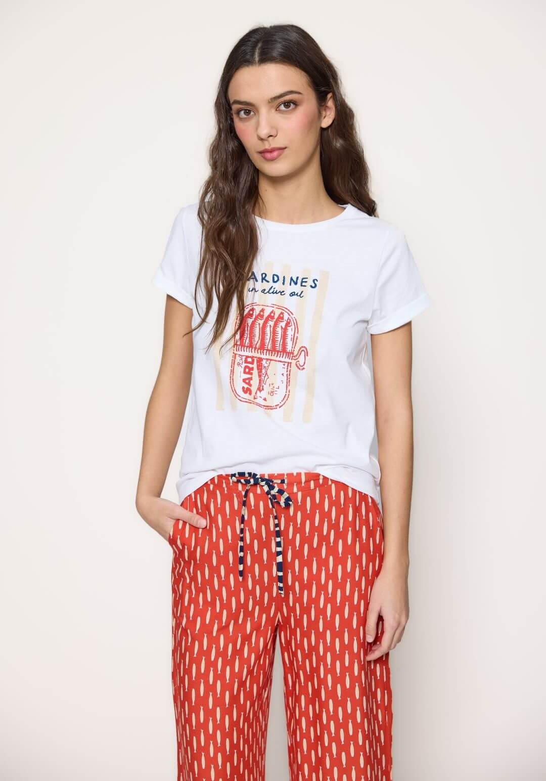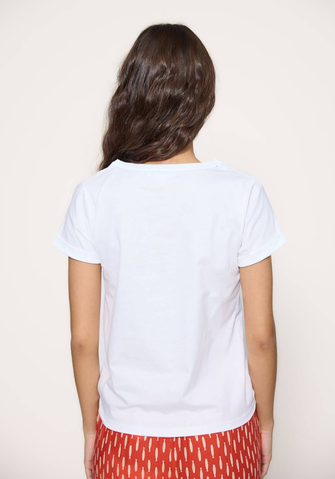Projetado pela Md`m para mulheres decididas e atraentes, inspira-se nesta coleção em viagens ao redor do mundo. Pense em roupas brilhantes e bonitas, com prints únicos. Bordados inconfundíveis, que a levarão bela até ao final da jornada de trabalho. Assim é esta t-shirt branca c/ estampa da Md`m. Apresenta decote redondo e manga curta. Pode ser usado com calça para baixo, além disso, pode combinar com sapato alto. A modelo está a vestir o tamanho S.
