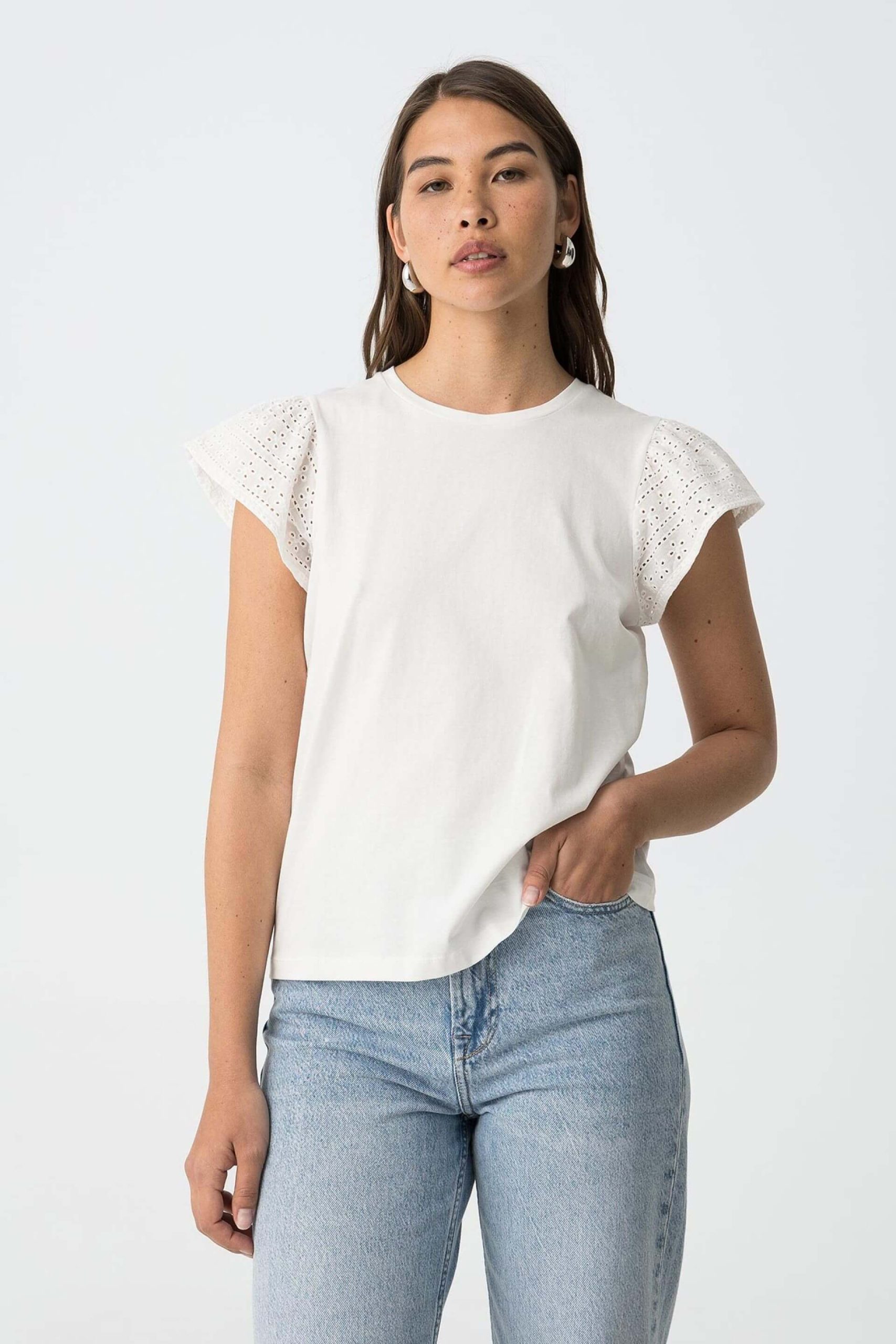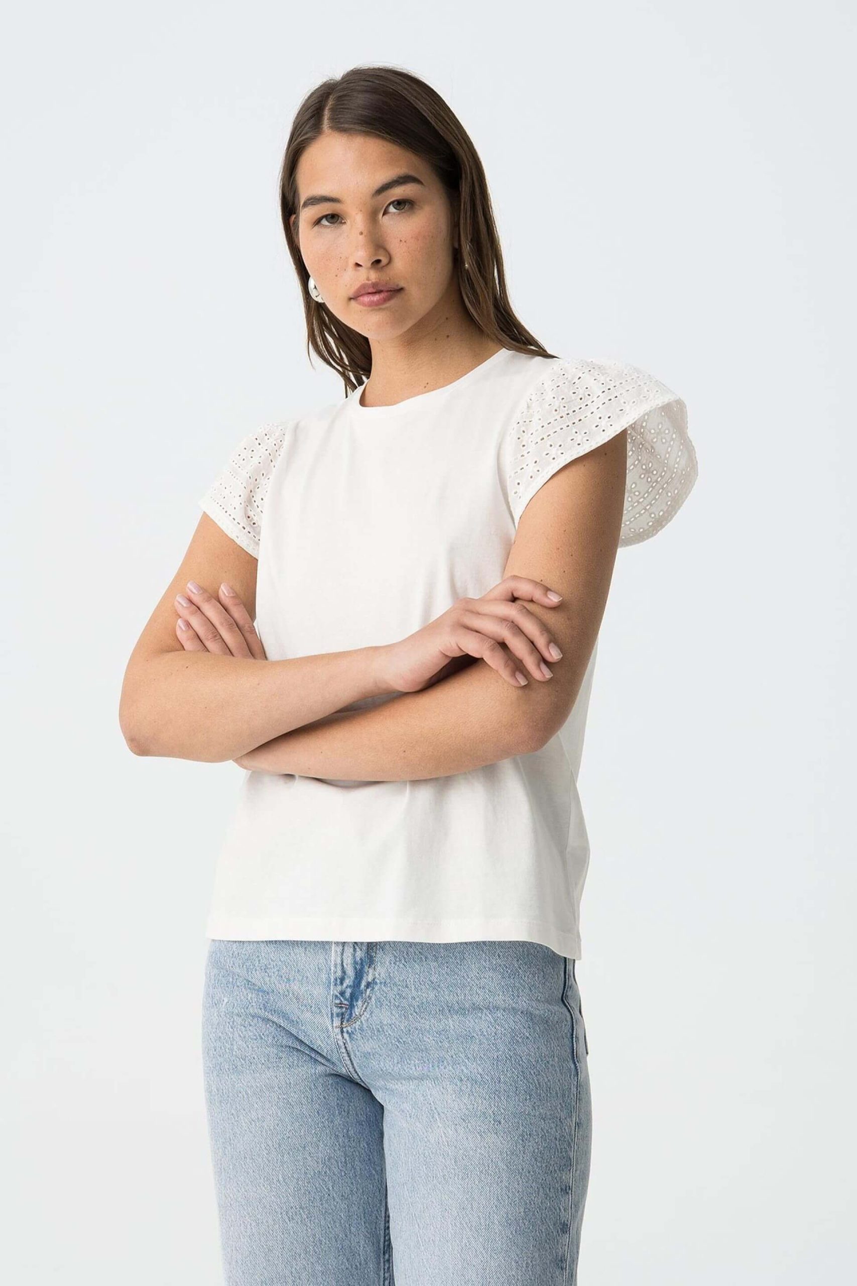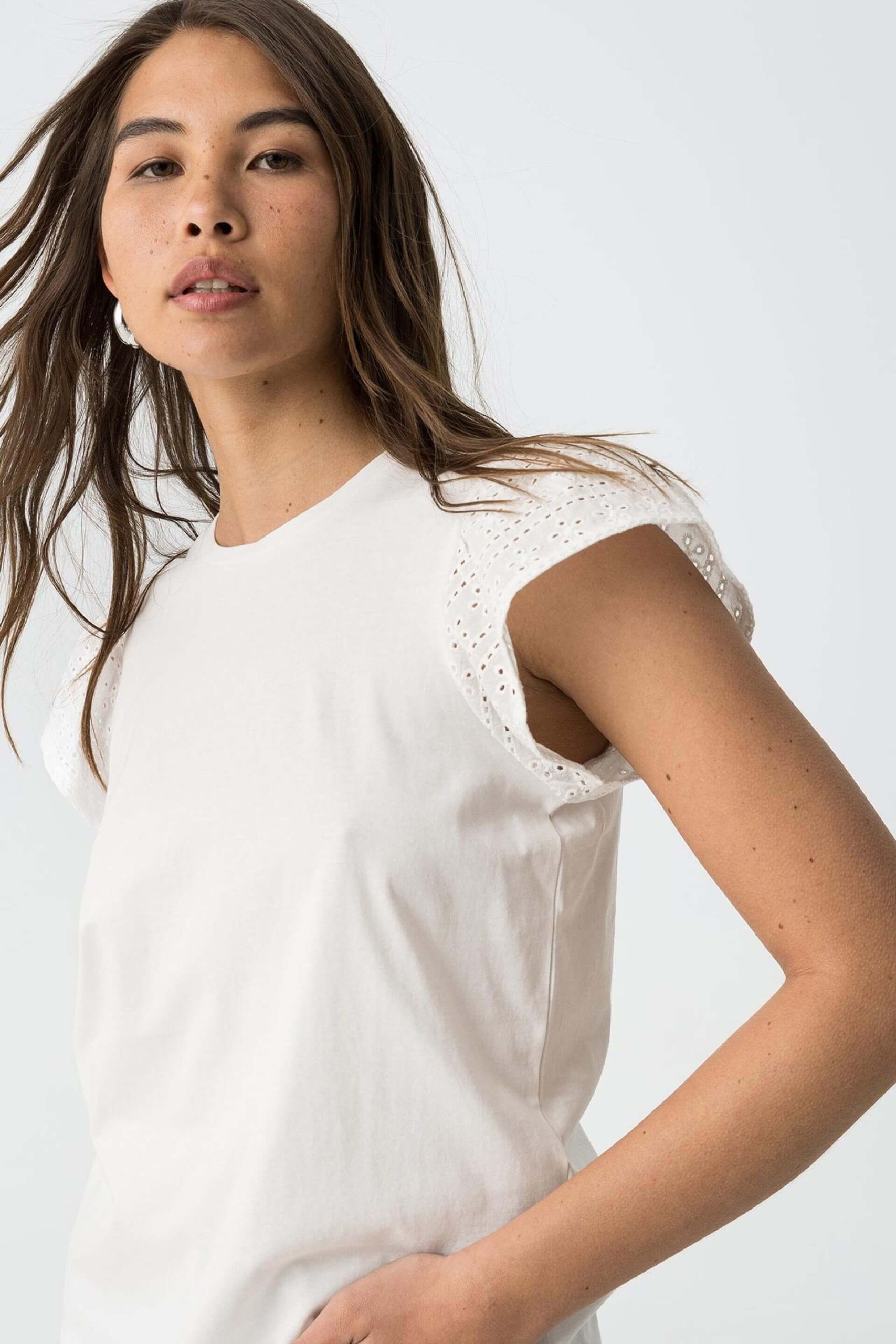 Conhecida por seu estilo urbano e design incomum, a Tiffosi incorpora detalhes inovadores. Combinados com silhuetas inspiradas em streetwear e uma estética jovial. Como esta t-shirt branca c/ manga estufada da Tiffosi. Apresenta manga curta e decote redondo. Para parte de baixo combina na perfeição com jeans, mas dentro do mesmo estilo. A modelo está a vestir o tamanho S.