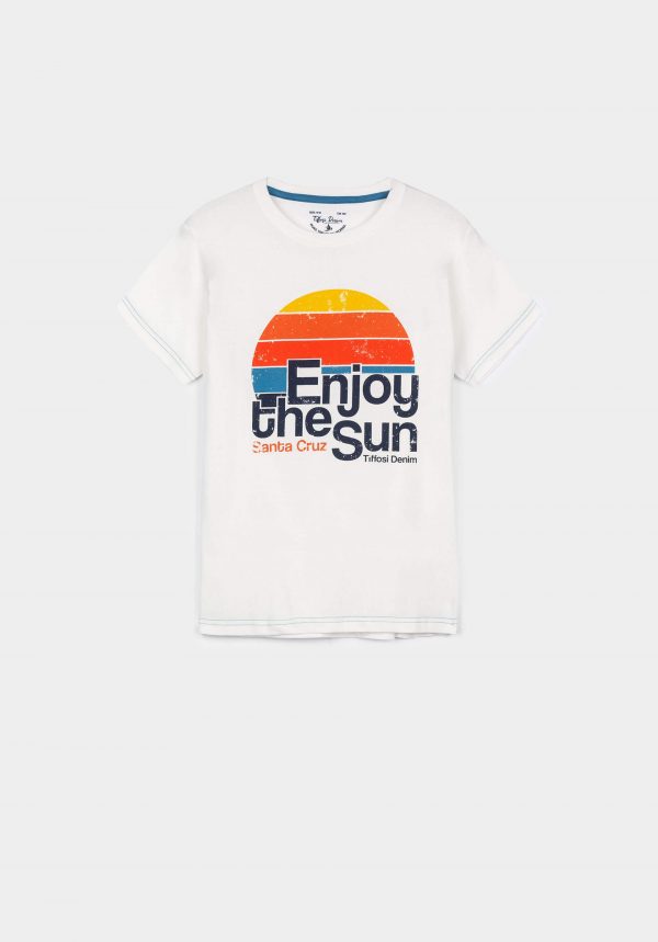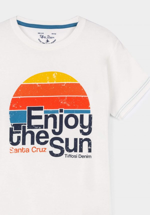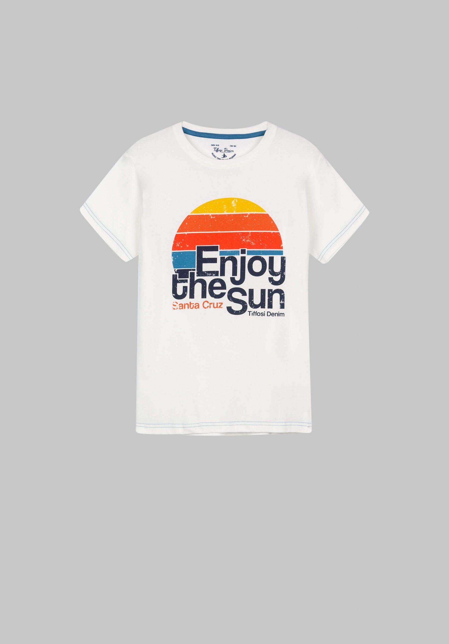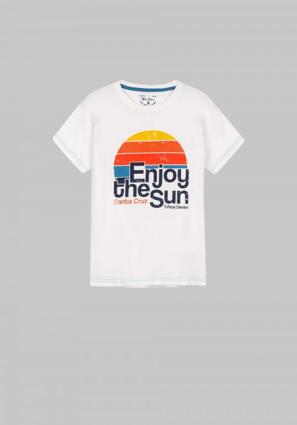 Pense em silhuetas dos anos 80, painéis pesados, denim super skinny e estampas de bandana. Pois bem essa era voltou aos dias de hoje. Conhecida por seu estilo urbano e design incomum, a Tiffosi incorpora detalhes nativos portugueses. Assim é esta t-shirt branca c/ print sol da Tiffosi. Tem decote redondo e manga curta. Para parte de baixo combina na perfeição com jeans mas a dar com o tom. A imagem está no tamanho 9-10 anos /140 cm.