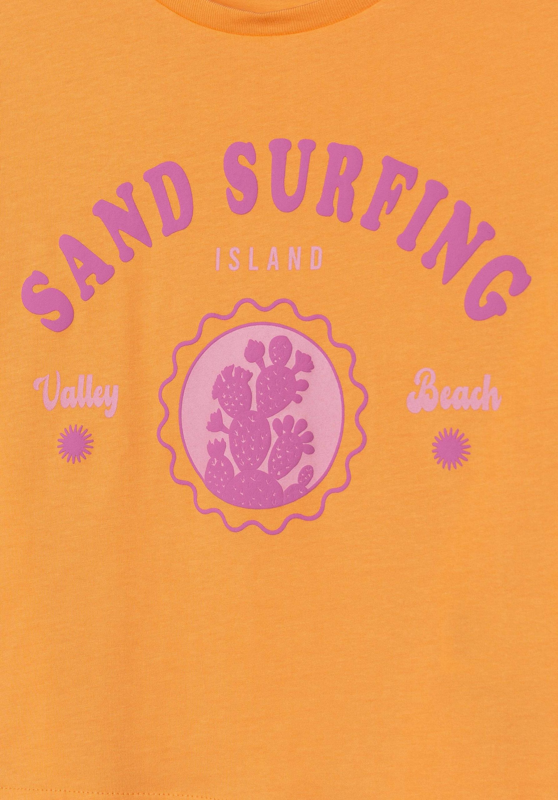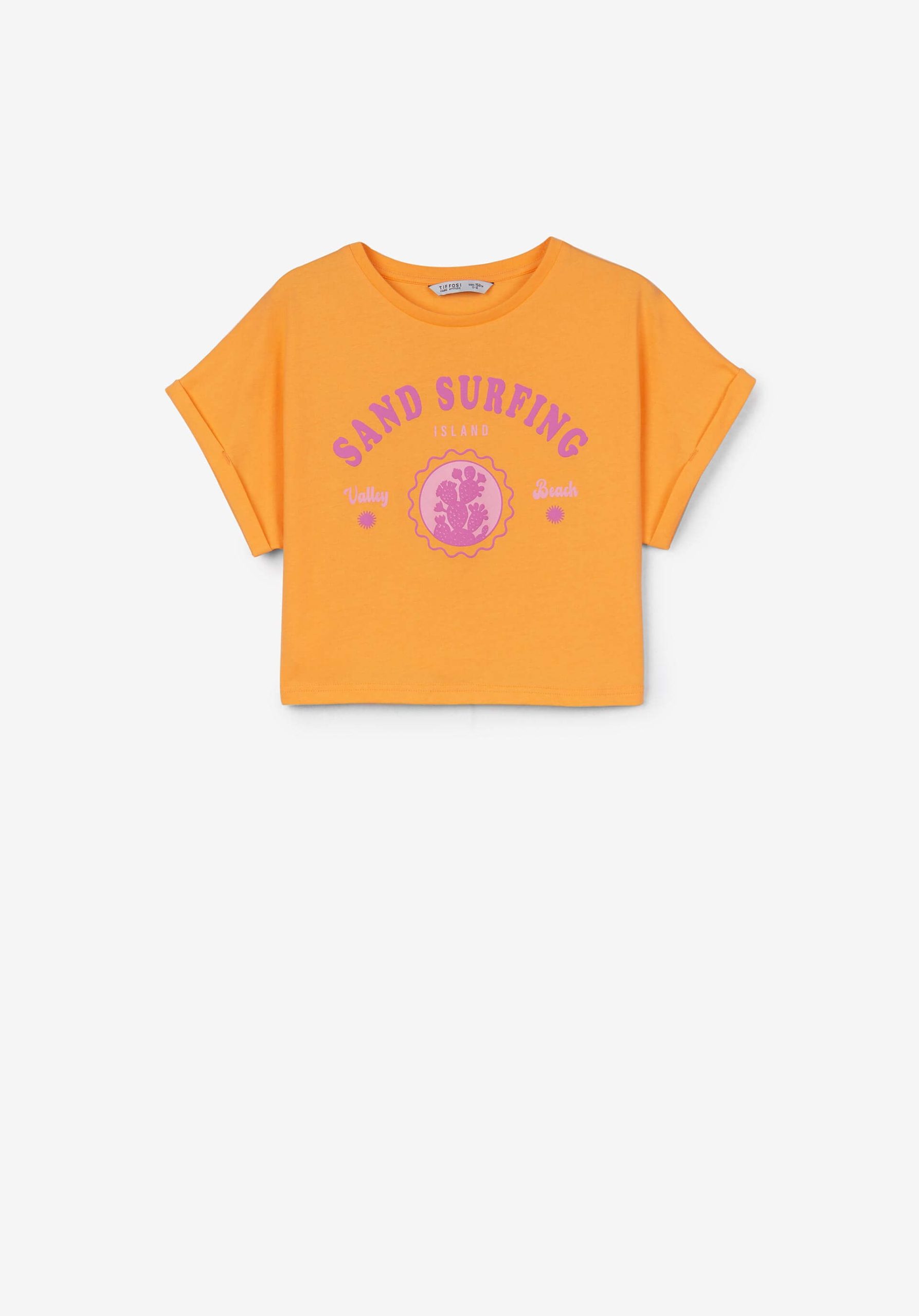 Pense em silhuetas dos anos 80, denim super skinny e estampas de bandana. Pois bem essa era voltou aos dias de hoje. Assim é esta t-shirt laranja beach da Tiffosi. Tem manga a curta e decote redondo. Para parte de baixo combina na perfeição com jeans mas a dar com o tom. A imagem está no tamanho 9-10 anos /140 cm.