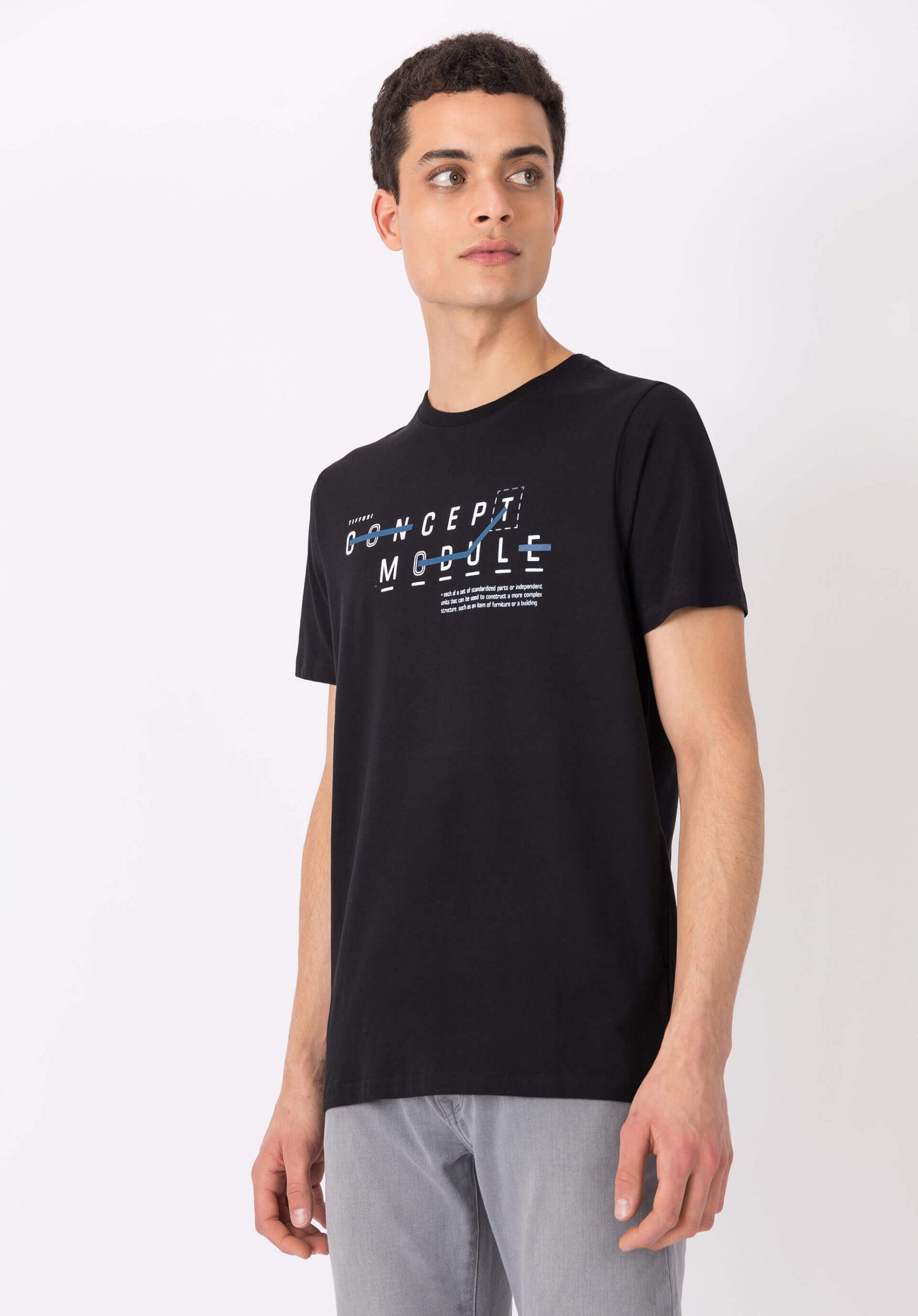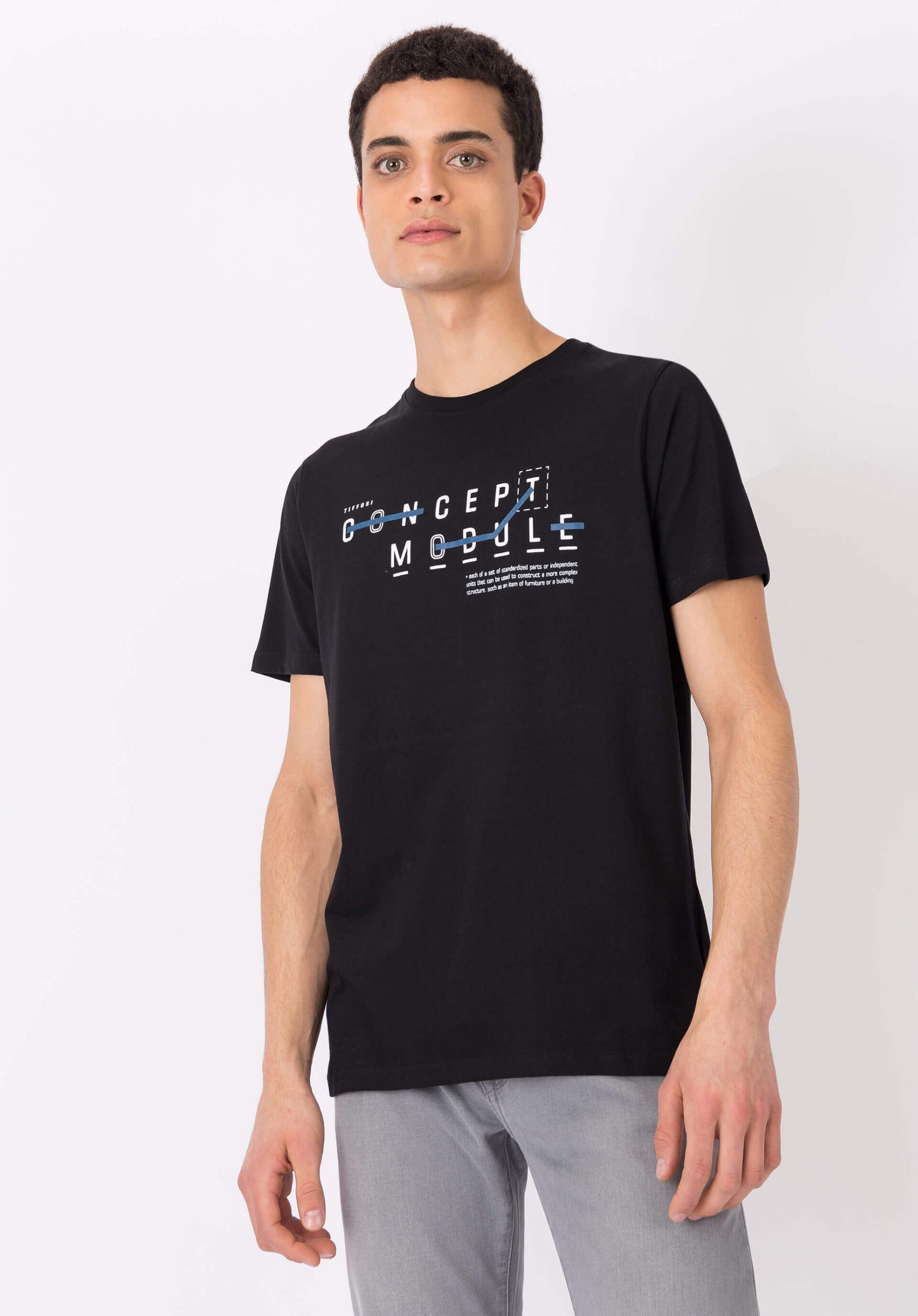 Pense em silhuetas dos anos 80, painéis pesados, denim super skinny e estampas de bandana. Pois bem essa era voltou aos dias de hoje. Conhecida por seu estilo urbano e design incomum, a Tiffosi incorpora detalhes nativos portugueses. Assim é esta t-shirt preta c/ decote redondo da Tiffosi. Com decote redondo e manga curta. Para parte de cima combina na perfeição com casaco mas a dar com o tom. O manequim está a vestir o tamanho M.