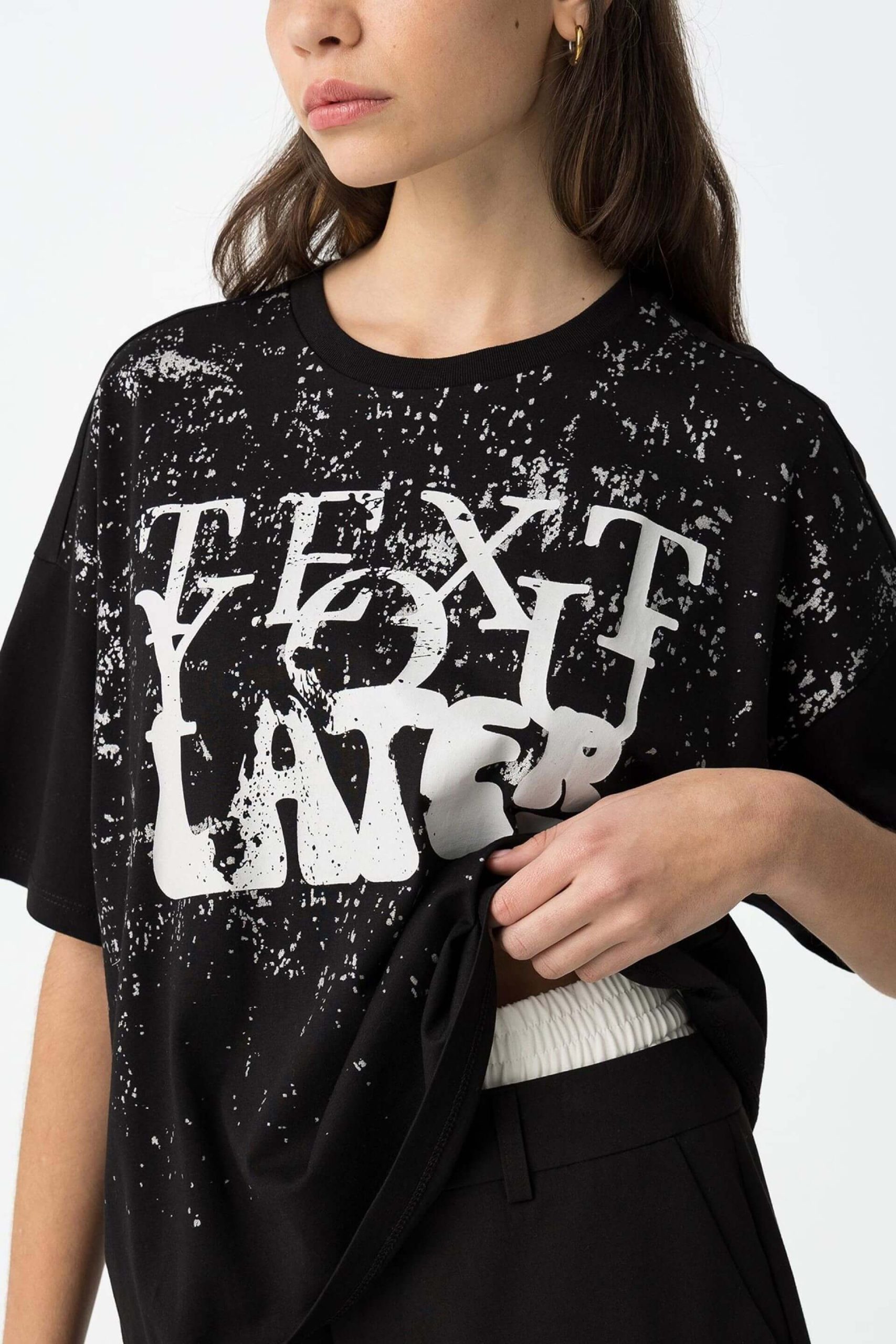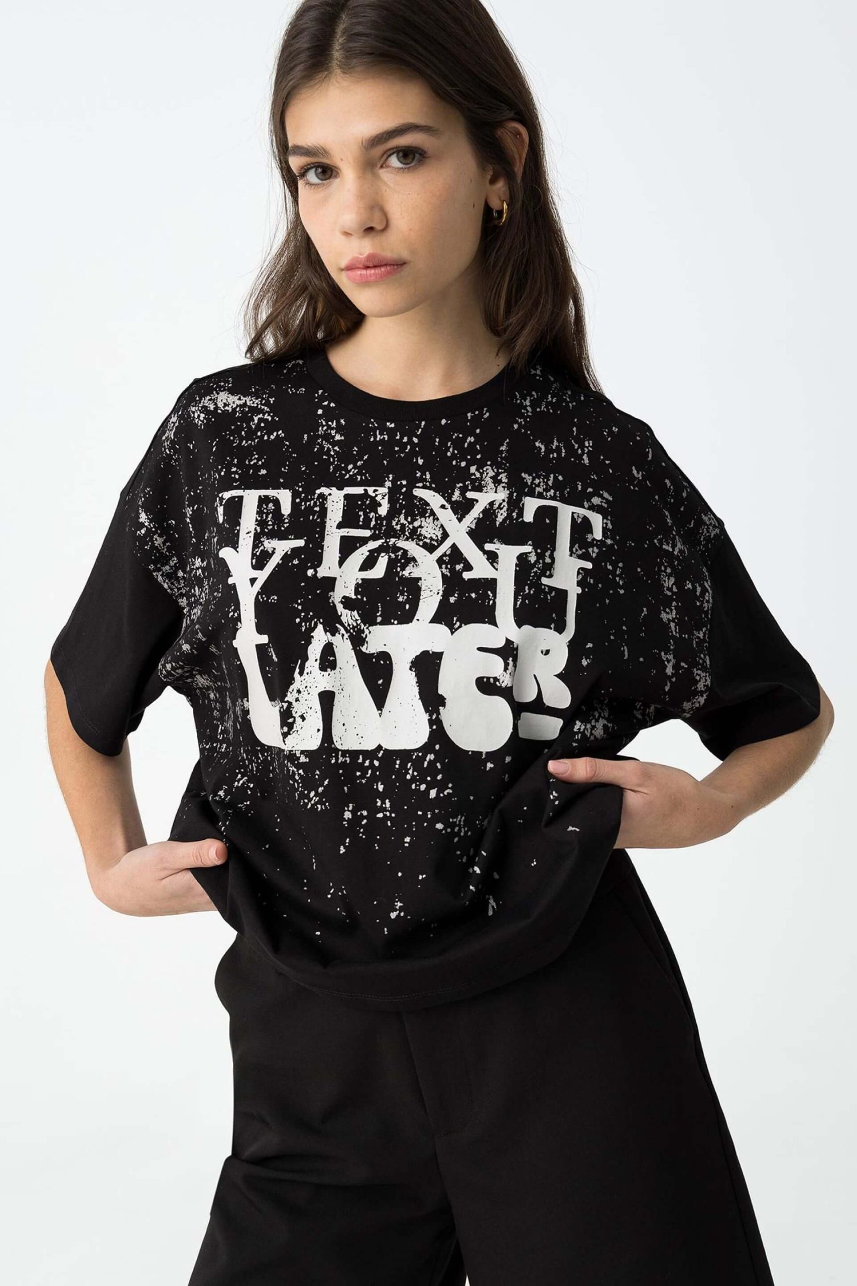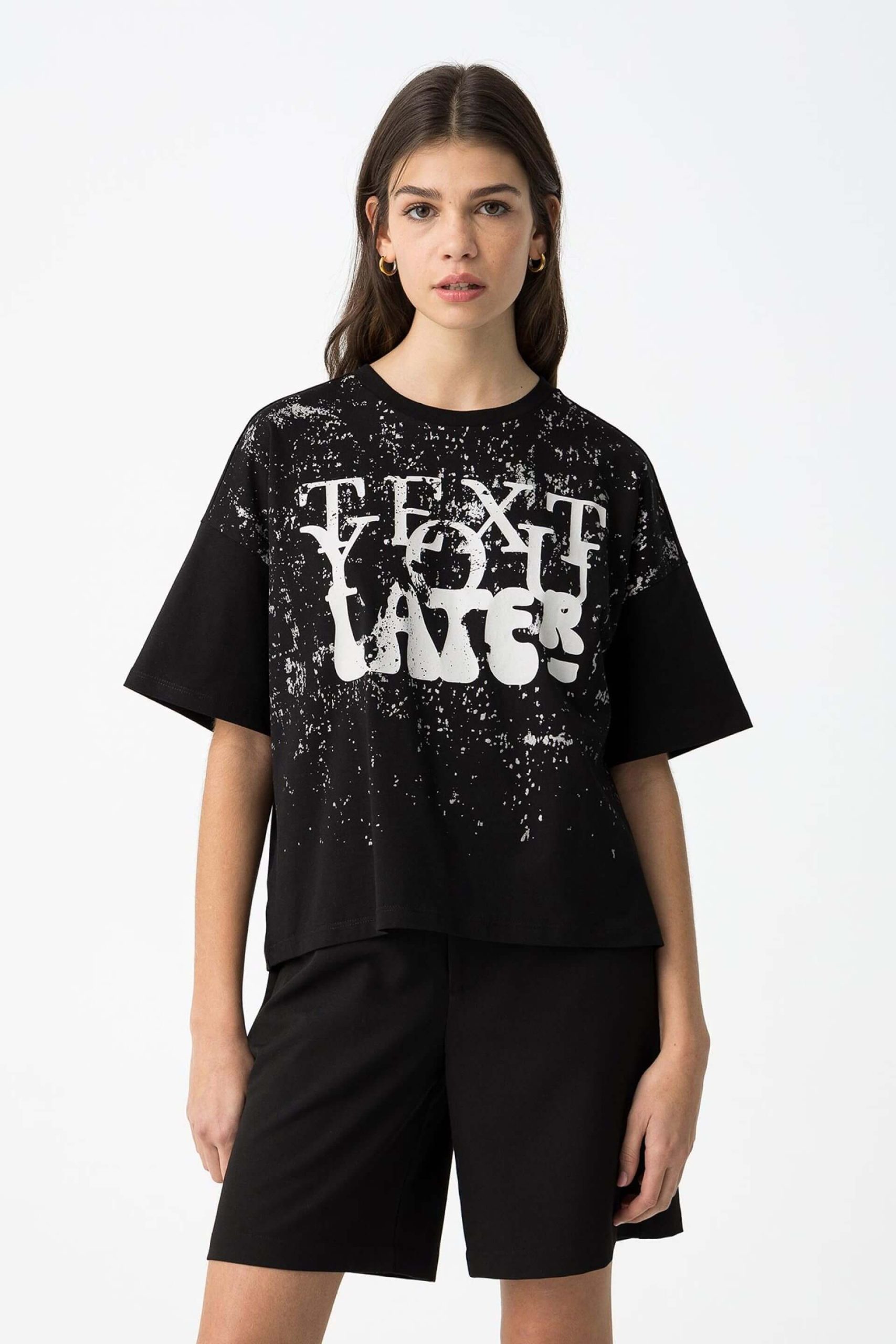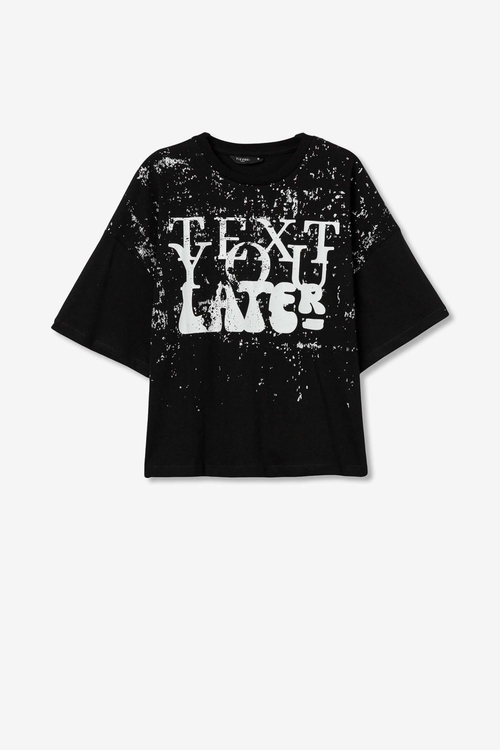 Pense em silhuetas dos anos 80, painéis pesados, denim super skinny e estampas de bandana. Pois bem essa era voltou aos dias de hoje. Assim é esta t-shirt preta c/ estampa da Tiffosi. Tem decote redondo e manga curta. Para parte de baixo combina na perfeição com jeans mas a dar com o tom. A imagem está no tamanho 13-14 anos /164 cm.