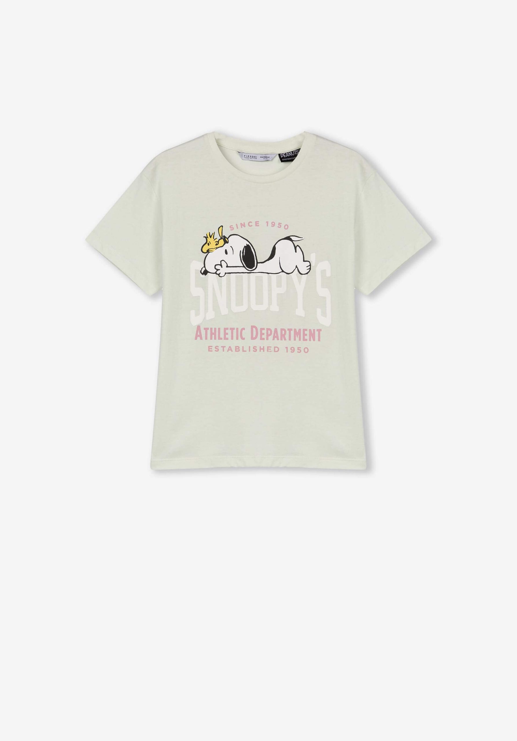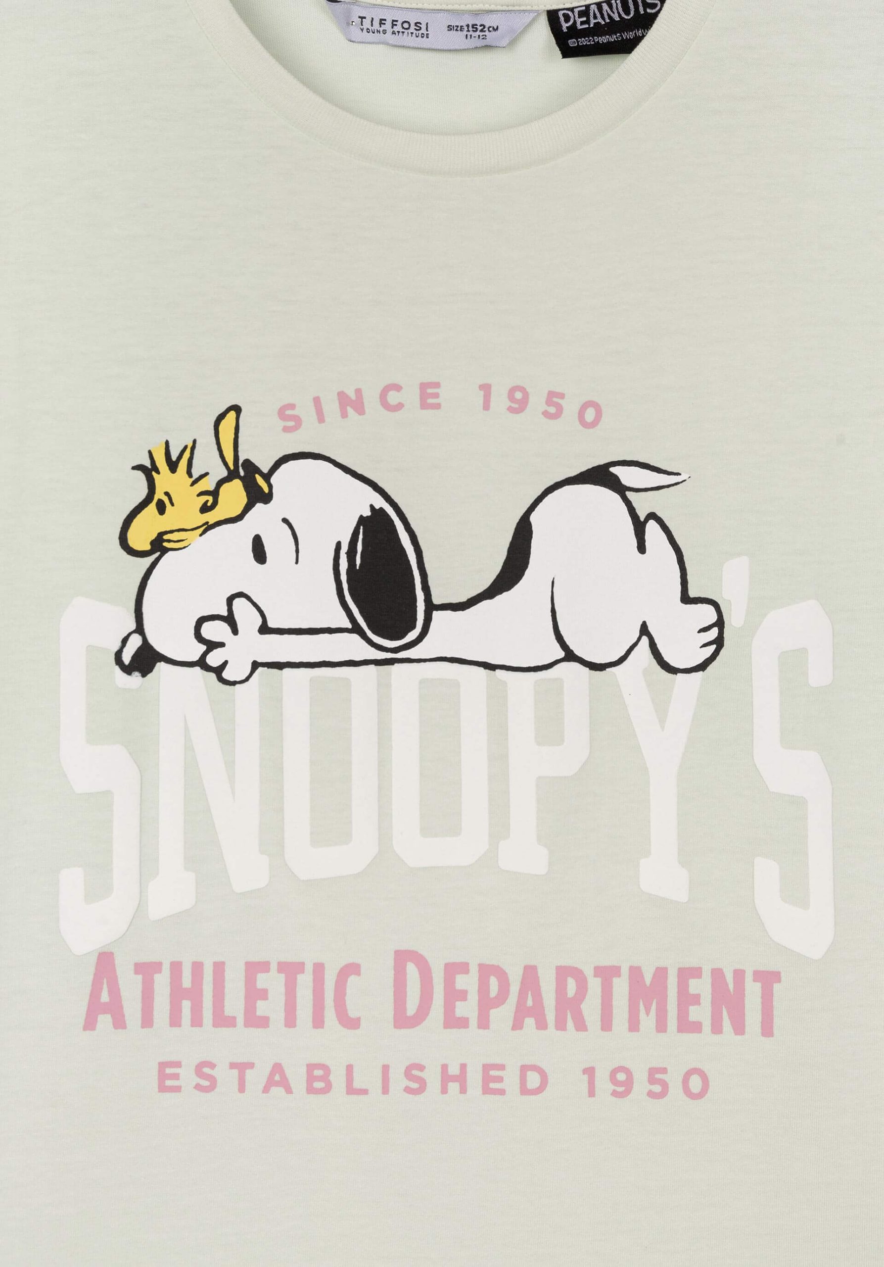 Pense em silhuetas dos anos 80, painéis pesados, denim super skinny e estampas de bandana. Pois bem essa era voltou aos dias de hoje. Conhecida por seu estilo urbano e design incomum, a Tiffosi incorpora detalhes nativos portugueses. Assim é esta t-shirt verde c/ estampa peanuts da Tiffosi. Tem decote redondo e manga curta. Para parte de baixo combina na perfeição com jeans mas a dar com o tom. A imagem está no tamanho 9-10 anos /140 cm.