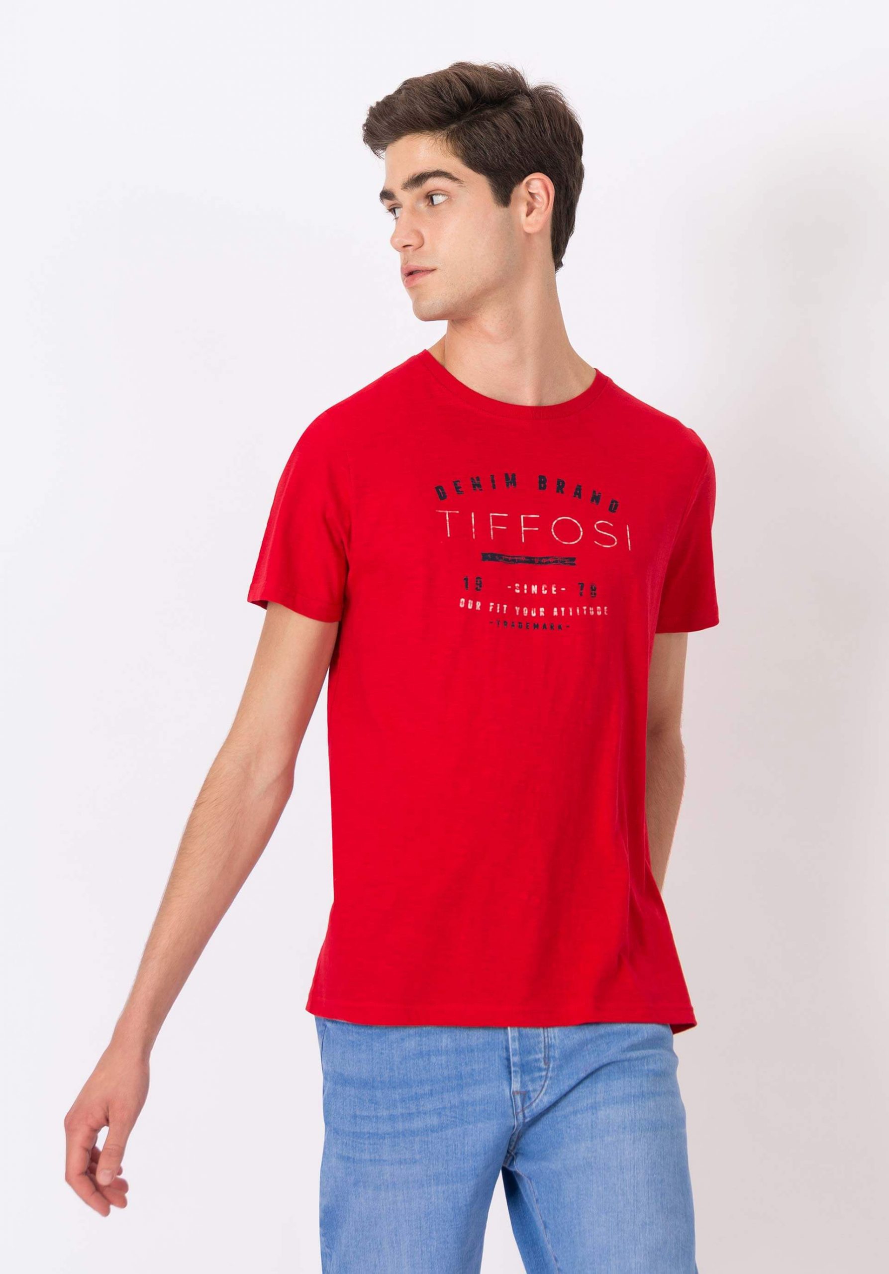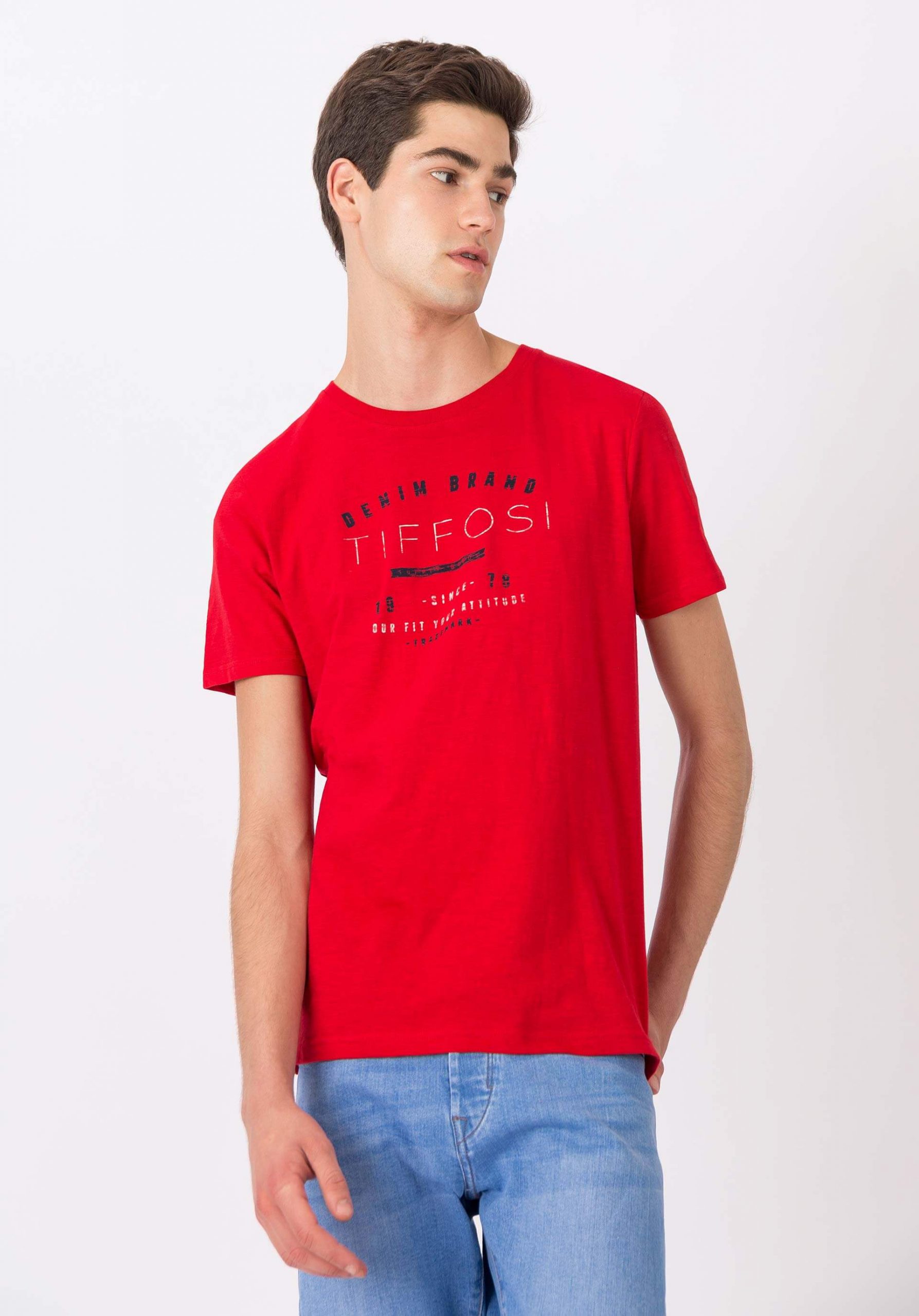 Pense em silhuetas dos anos 80, painéis pesados, denim super skinny e estampas de bandana. Pois bem essa era voltou aos dias de hoje. Conhecida por seu estilo urbano e design incomum, a Tiffosi incorpora detalhes nativos portugueses. Assim é esta t-shirt vermelha com estampa da Tiffosi. Com decote redondo e manga curta. Para parte de cima combina na perfeição com casaco mas a dar com o tom. O manequim está a vestir o tamanho M.