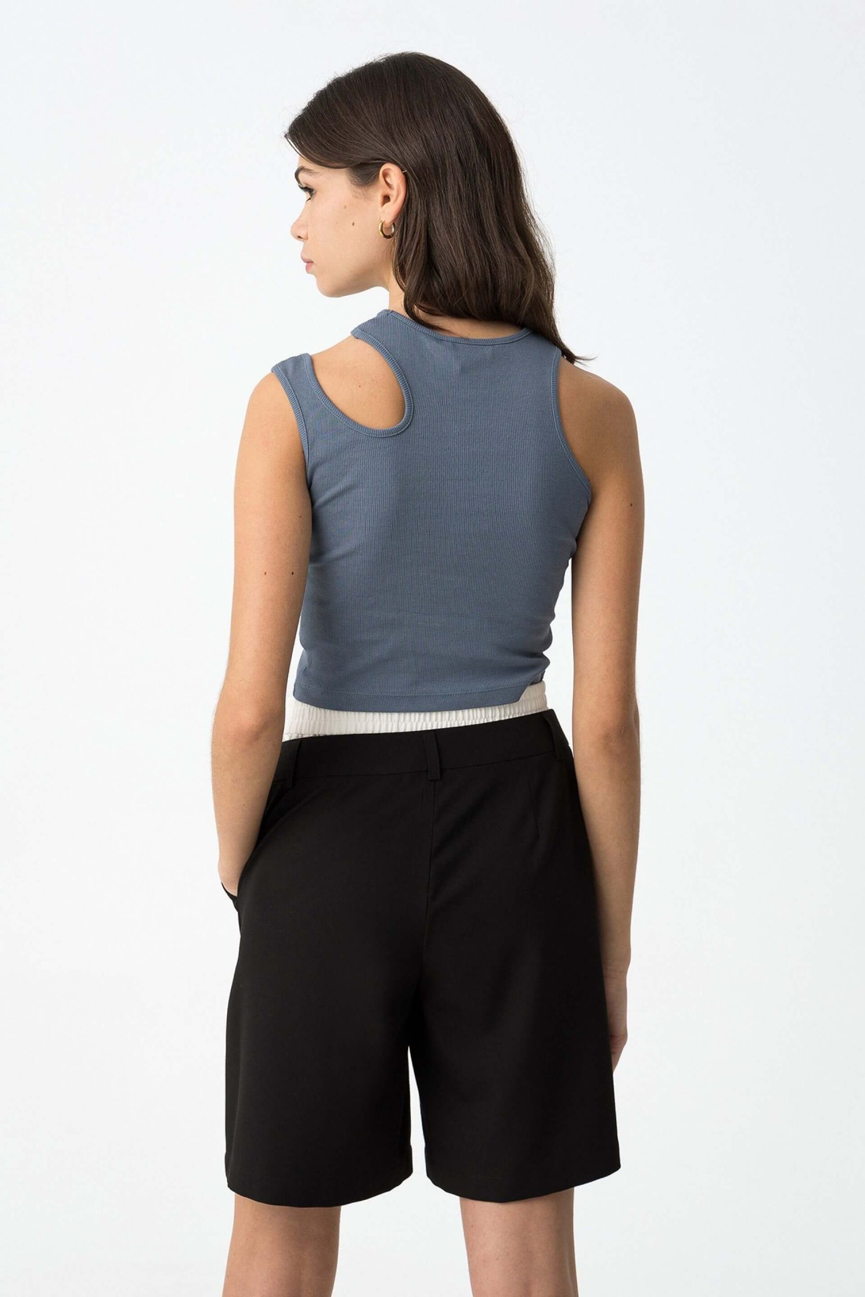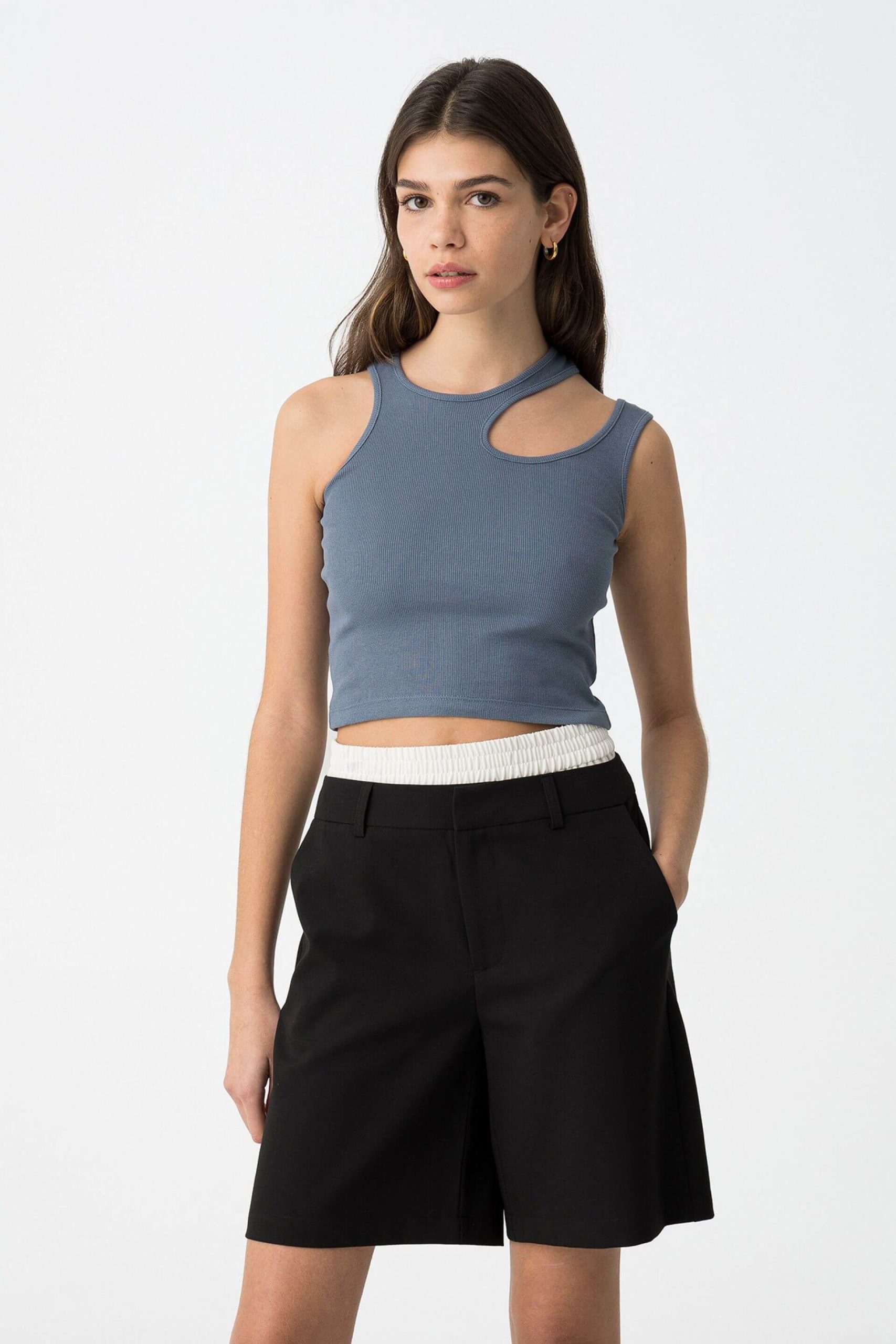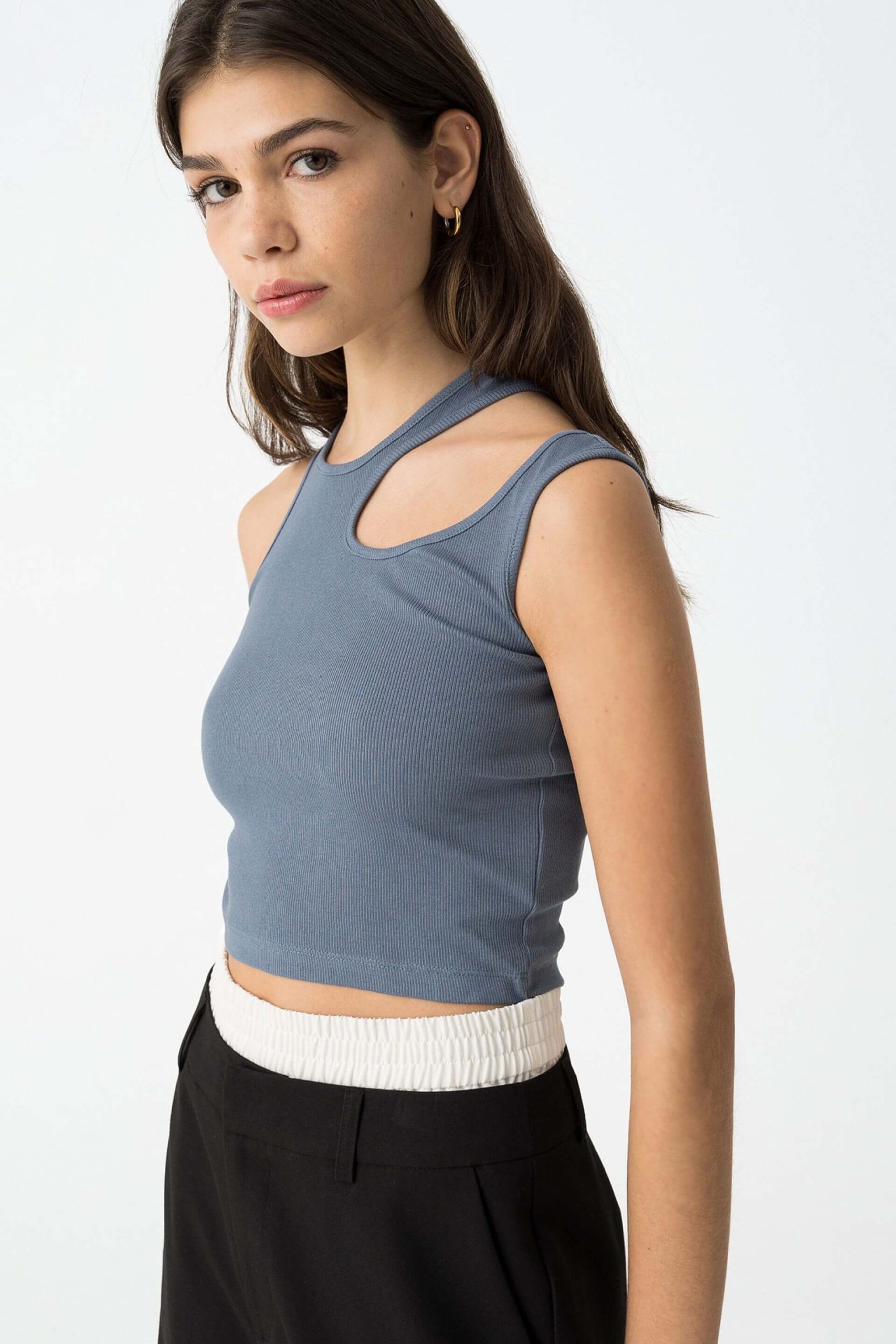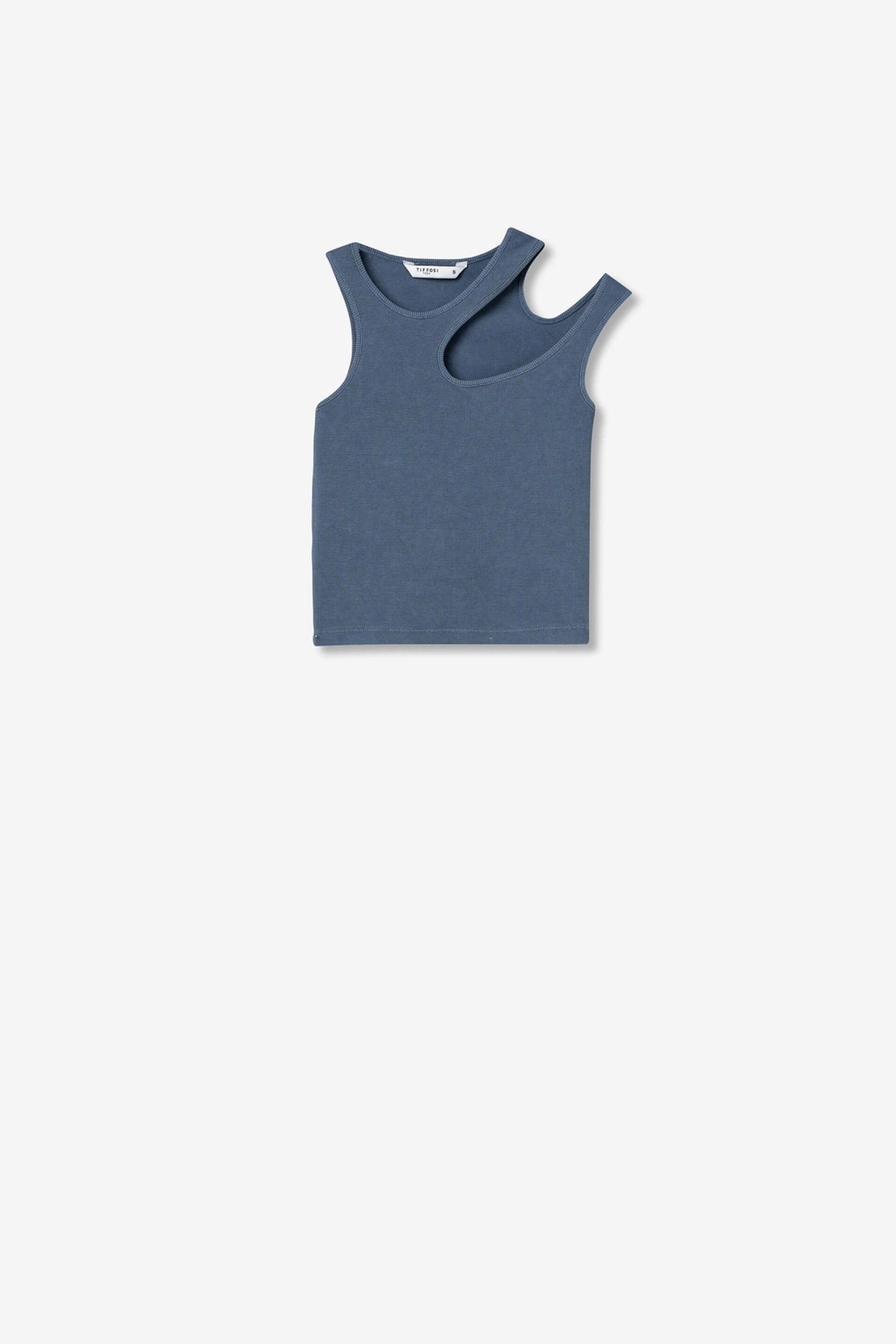Pense em silhuetas dos anos 80, painéis pesados, denim super skinny e estampas de bandana. Pois bem essa era voltou aos dias de hoje. Assim é este tope azulado c/ dupla alça da Tiffosi. Tem decote redondo e manga cava. Para parte de baixo combina na perfeição com jeans mas a dar com o tom. A imagem está no tamanho 13-14 anos /164 cm.