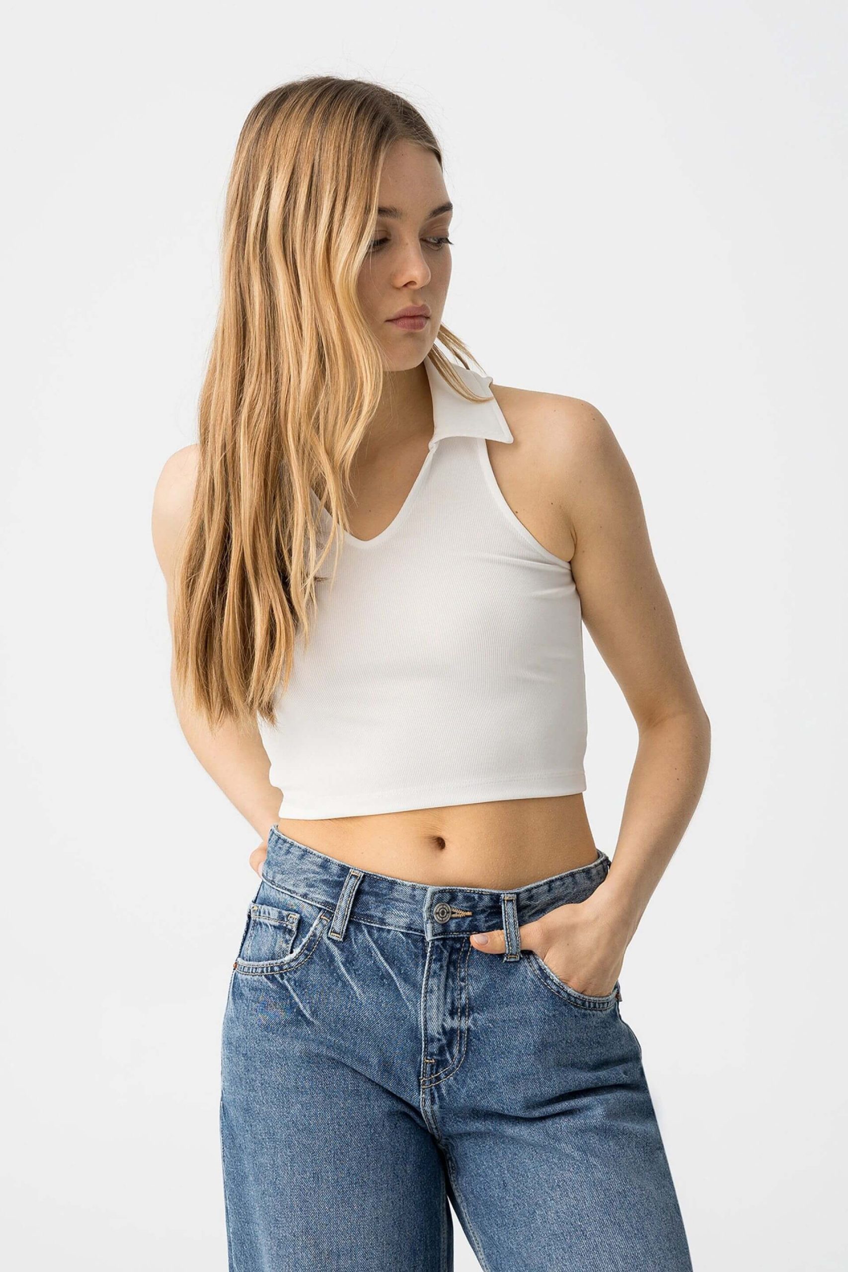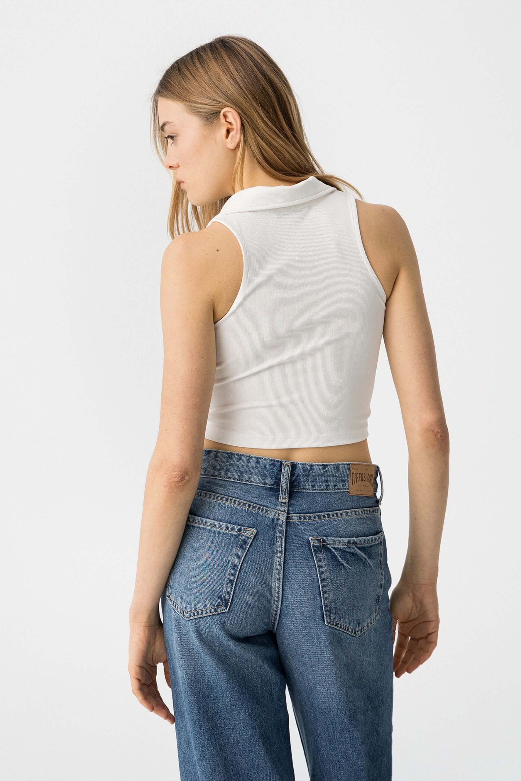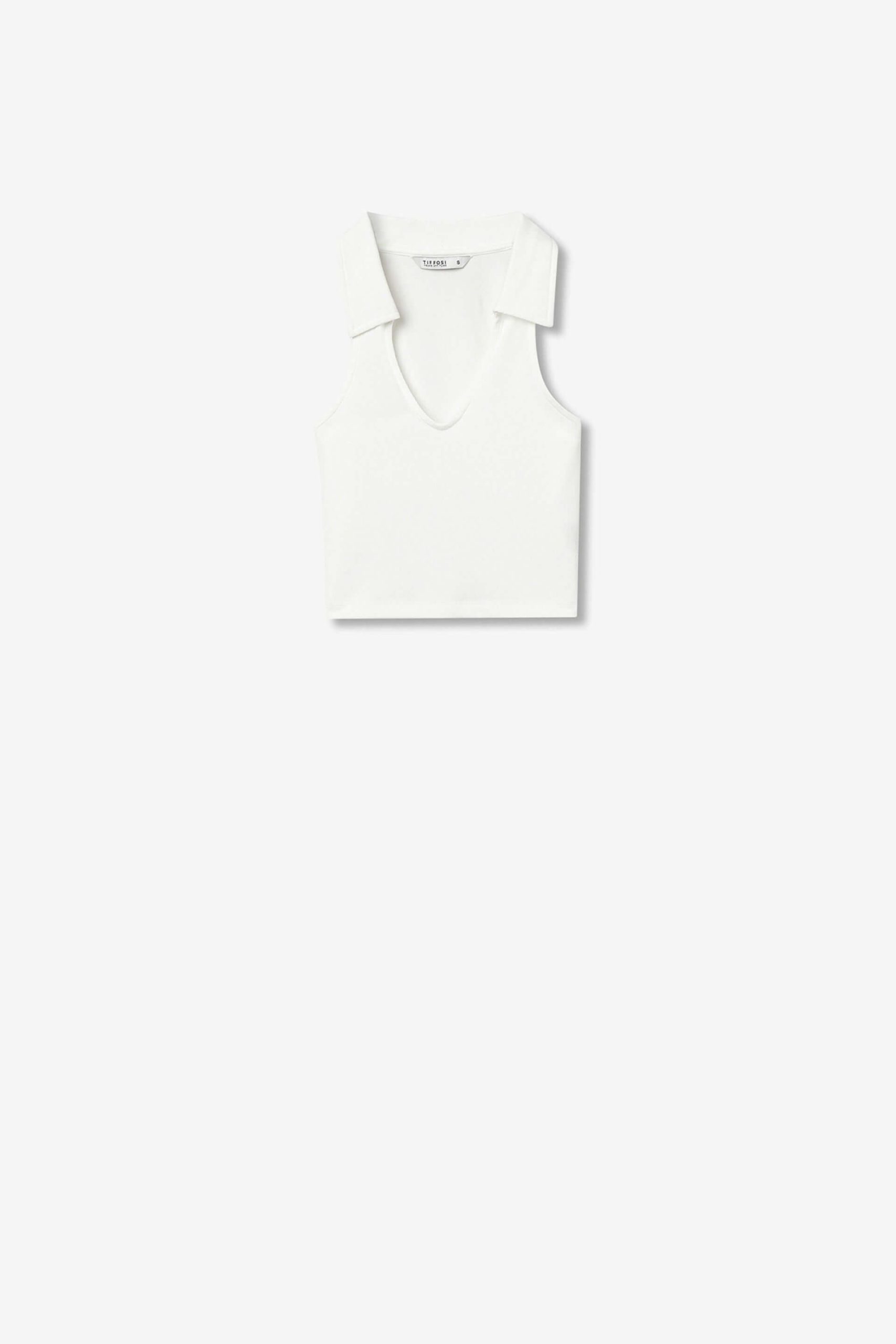 Pense em silhuetas dos anos 80, painéis pesados, denim super skinny e estampas de bandana. Pois bem essa era voltou aos dias de hoje. Assim é este tope branco c/ gola da Tiffosi. Tem decote em bico e manga cava. Para parte de baixo combina na perfeição com jeans mas a dar com o tom. A imagem está no tamanho 13-14 anos /164 cm.