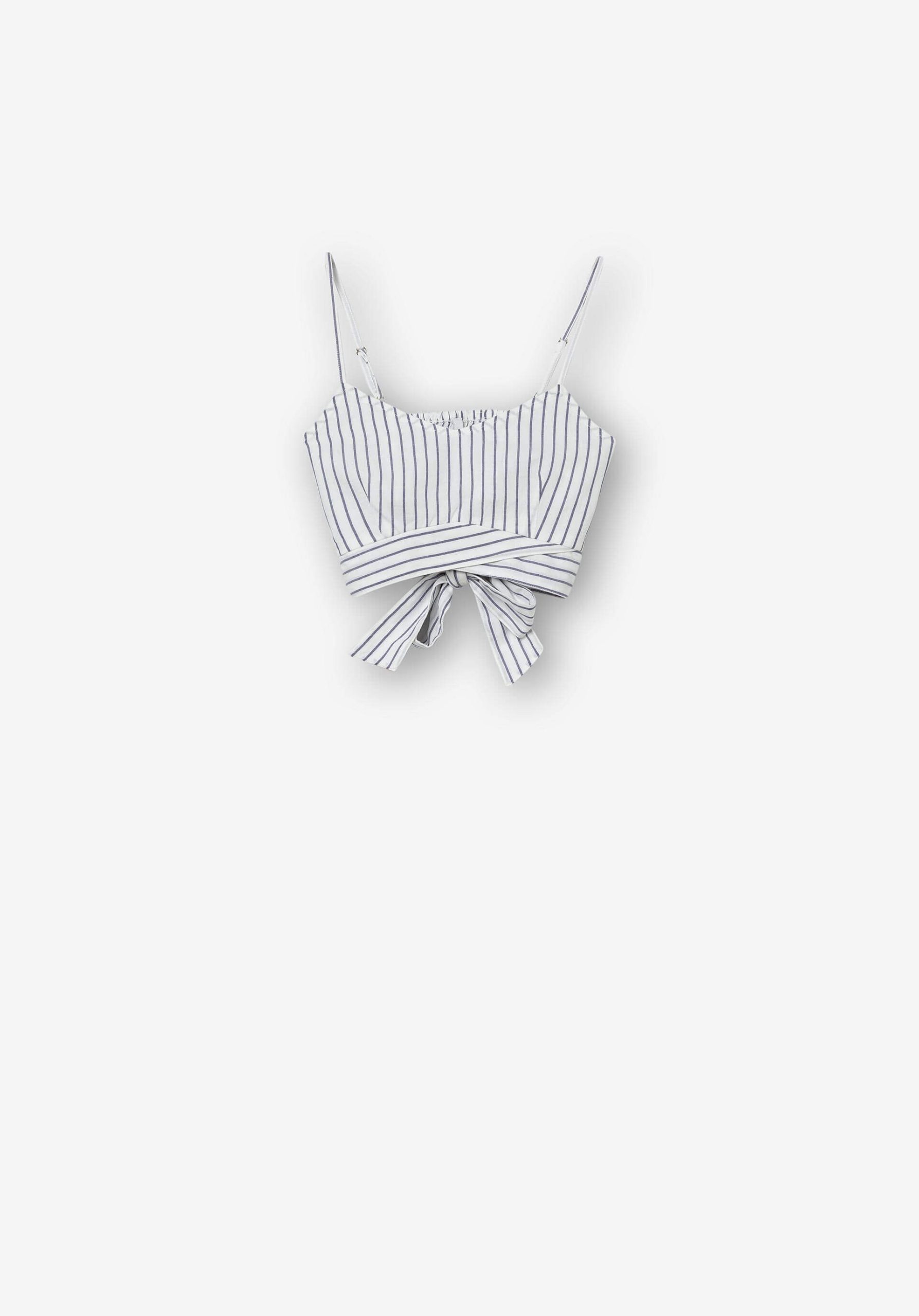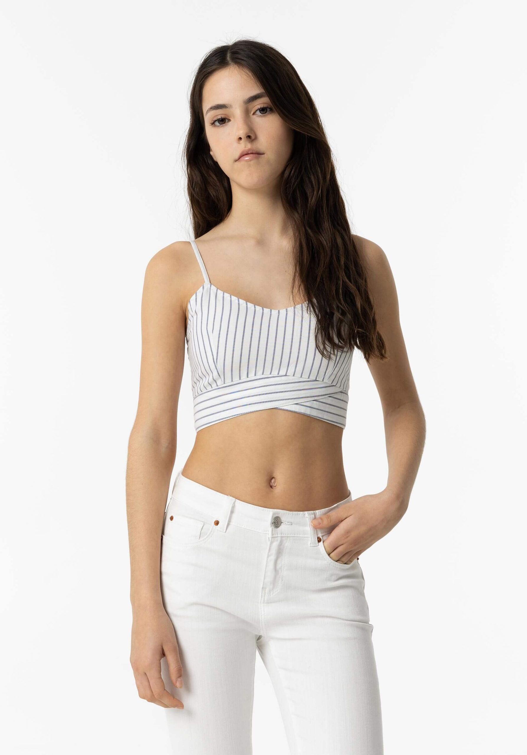 Pense em silhuetas dos anos 80, denim super skinny e estampas de bandana. Pois bem essa era voltou aos dias de hoje. Assim é este tope branco c/ riscas de alças da Tiffosi. Tem decote em bico  e tira a atar nas costas. Para parte de baixo combina na perfeição com jeans mas a dar com o tom. A imagem está no tamanho XS /152 cm.