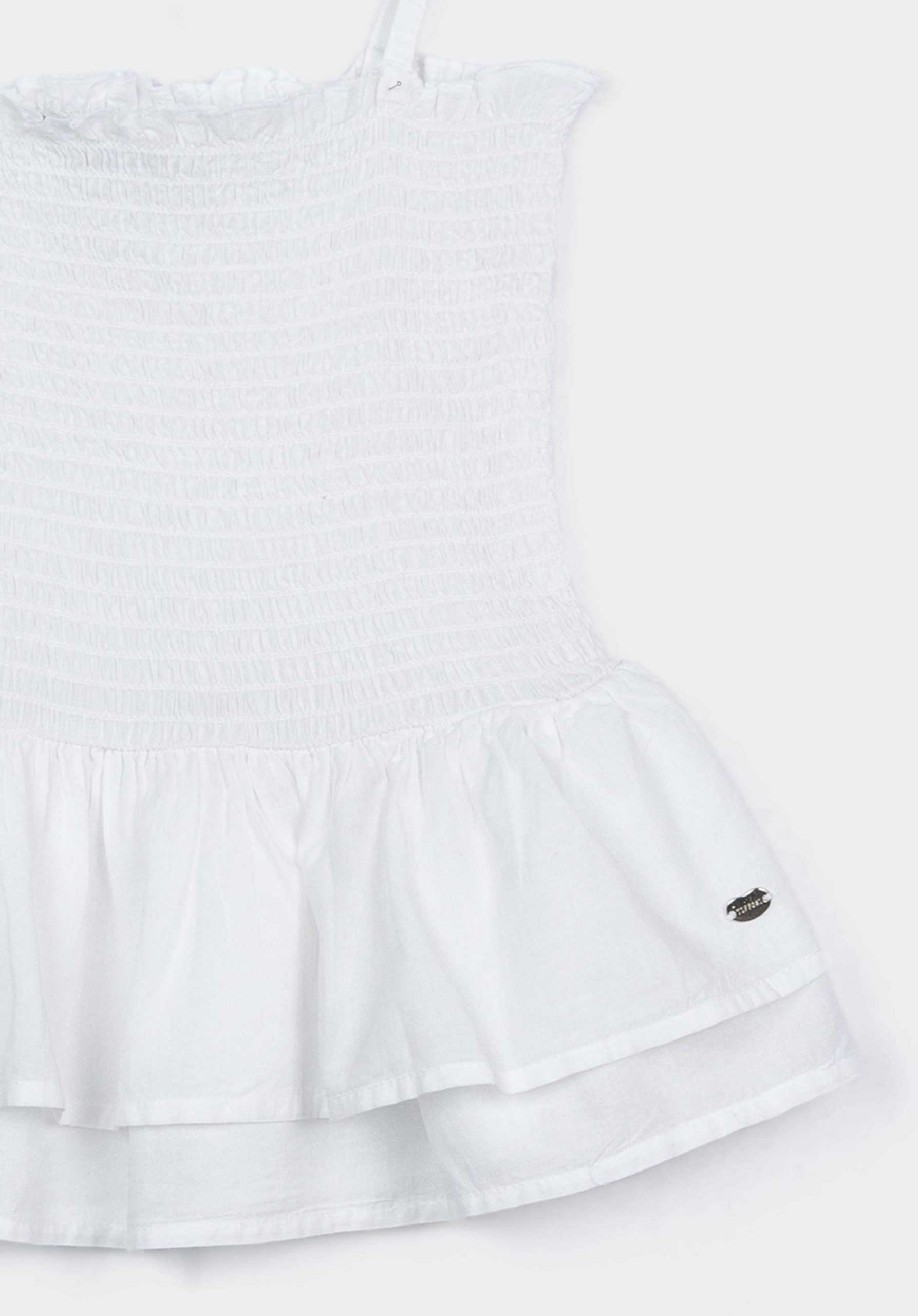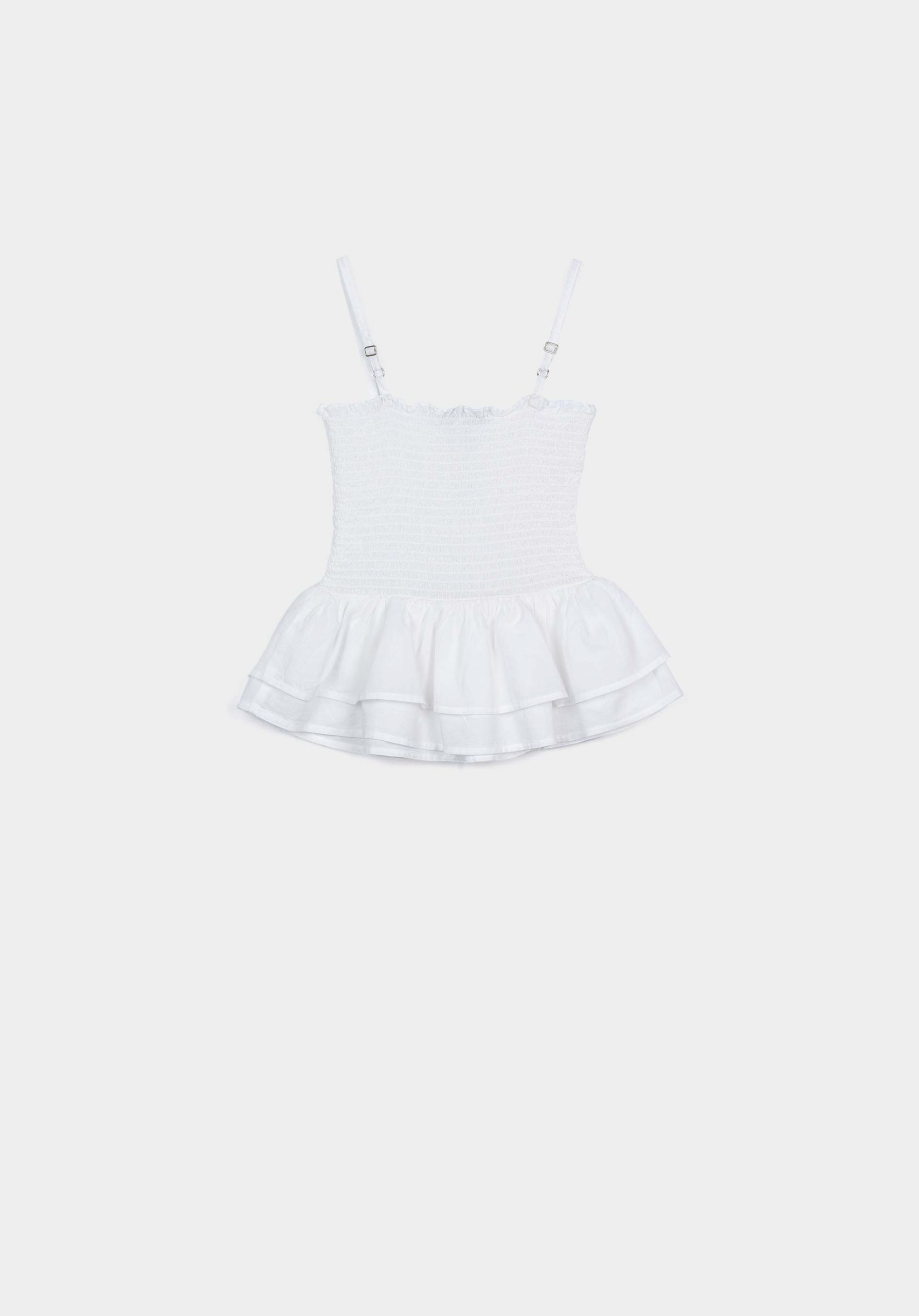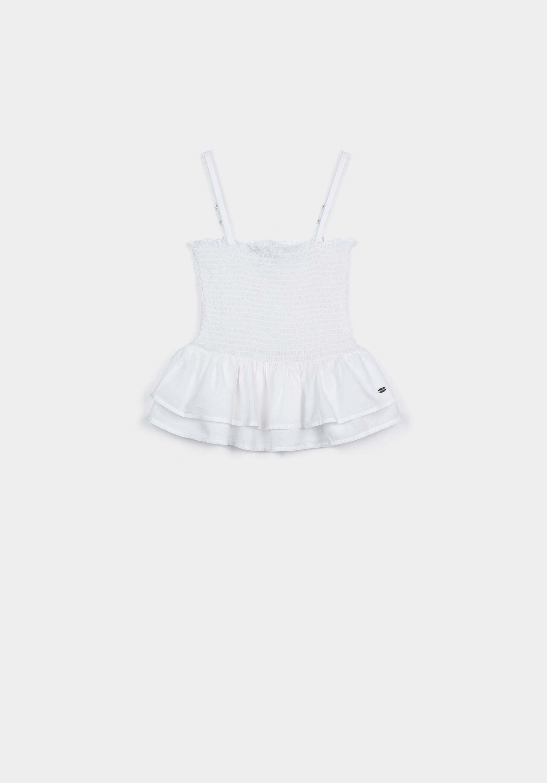Conhecida por seu estilo urbano e design incomum, a Tiffosi incorpora detalhes inovadores. Combinados com silhuetas inspiradas em streetwear e uma estética jovial. Assim é este tope branco de alças c/ folho da Tiffosi. Tem alça ajustável e idas de elástico de canela. Para parte de baixo combina na perfeição com jeans, mas dentro do mesmo estilo. O modelo está no tamanho 9-10 anos 140 cm.