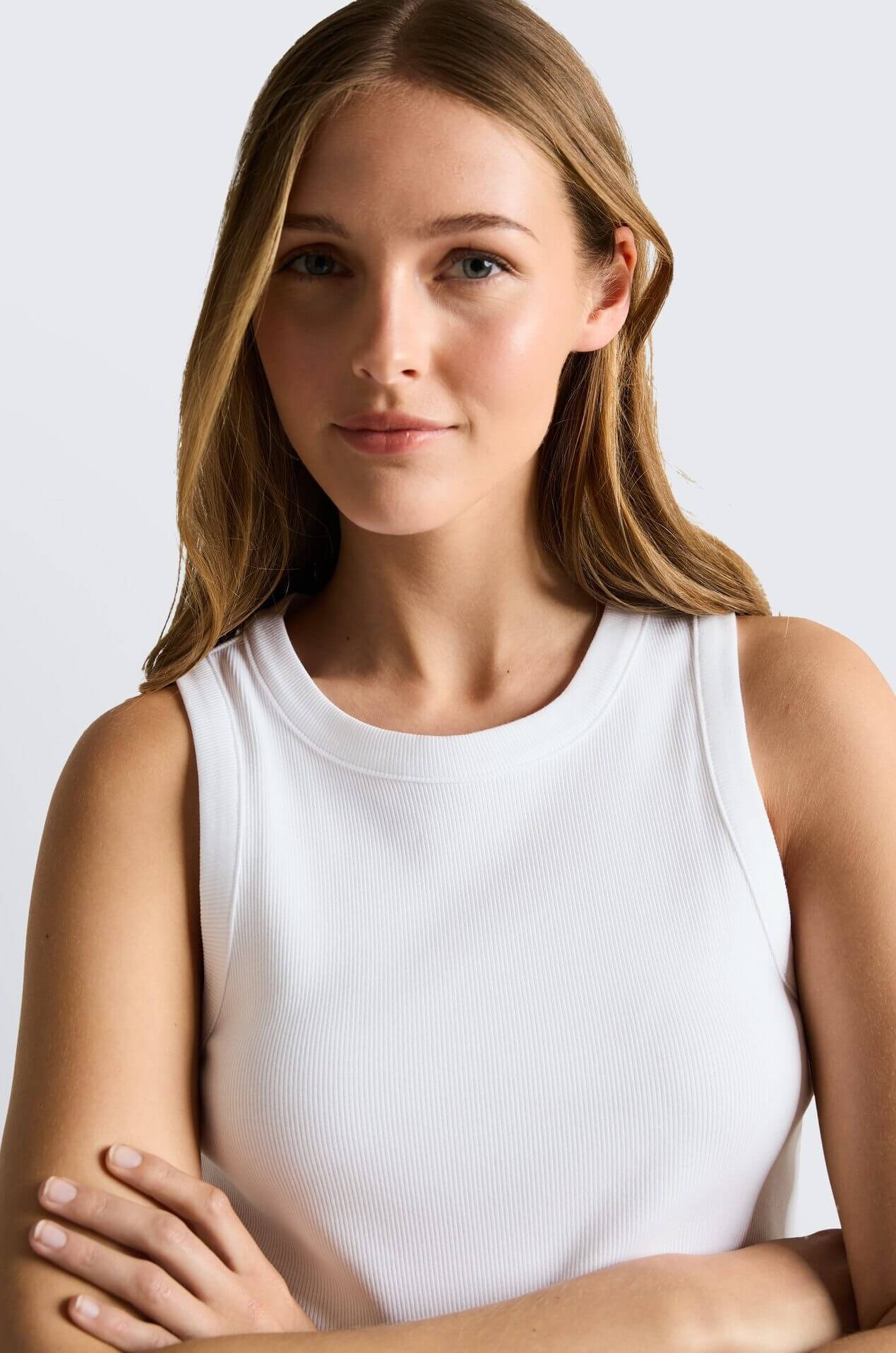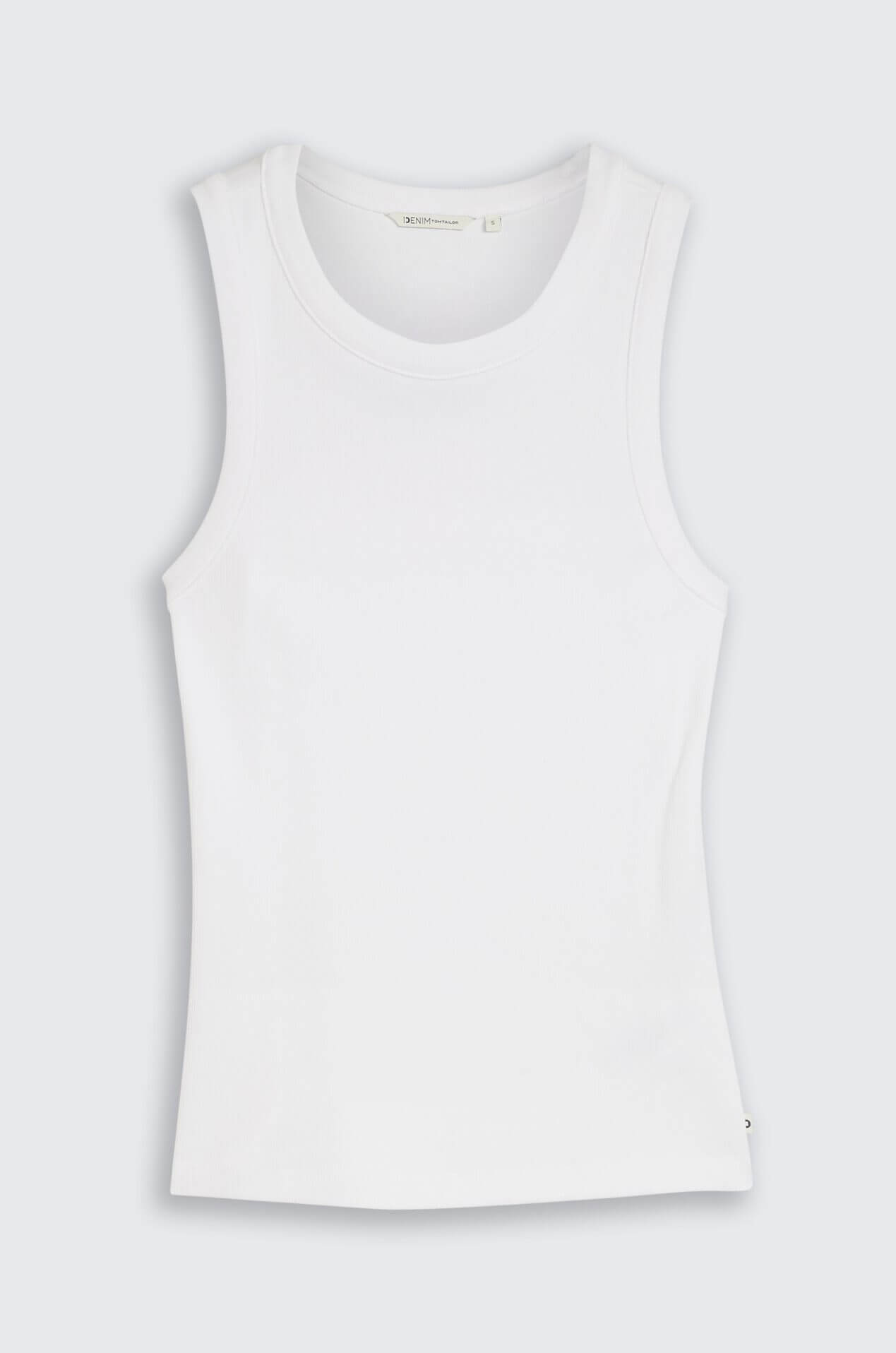 Conhecida por seu estilo urbano e design incomum, a Tom Tailor incorpora detalhes inovadores. Combinados com silhuetas inspiradas em streetwear e uma estética jovial. Assim é este tope branco de cavas da Tom Tailor. Apresenta decote redondo e manga cava. Para parte de baixo combina na perfeição com calça, mas dentro do mesmo estilo. A modelo está a vestir o tamanho S.