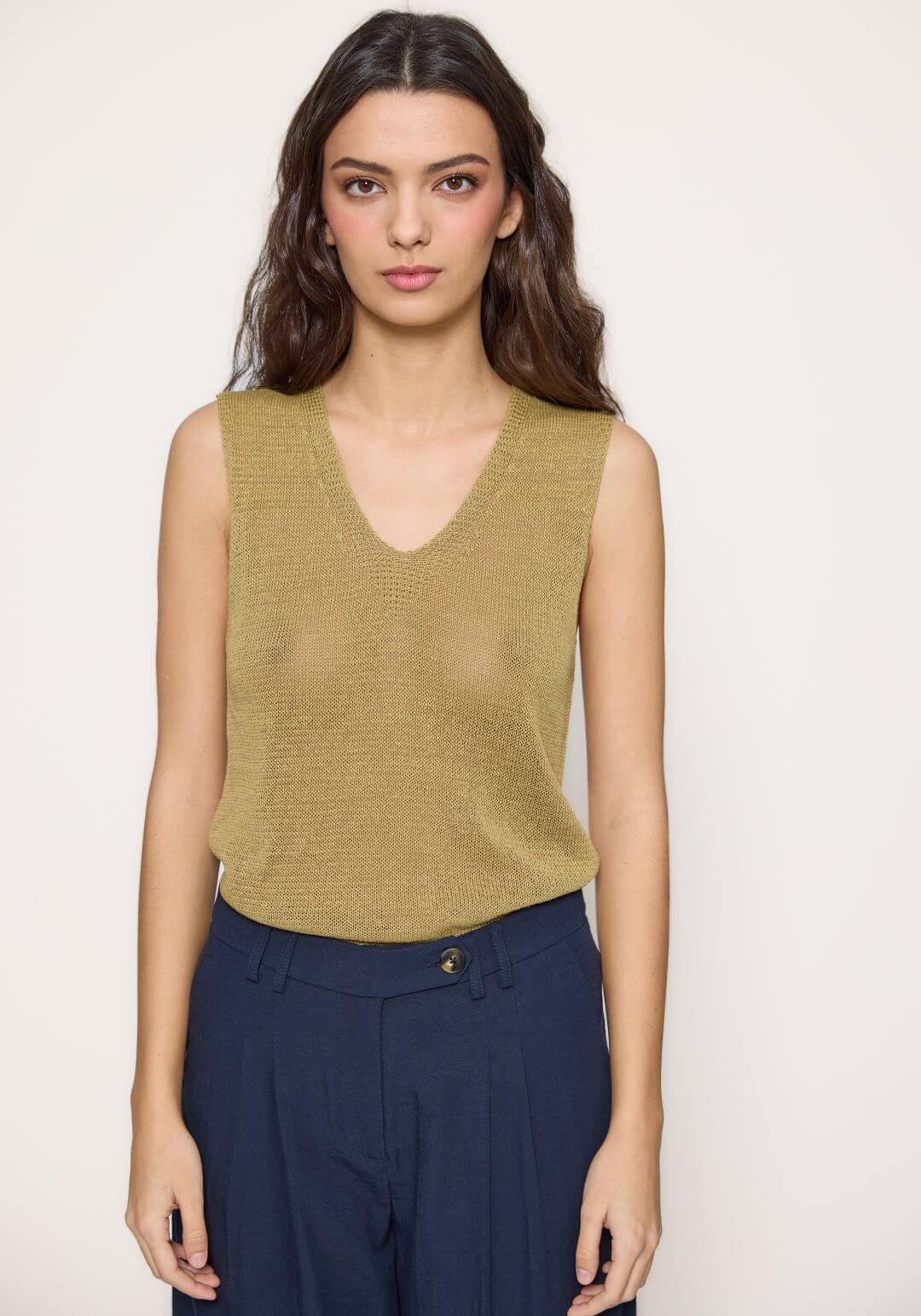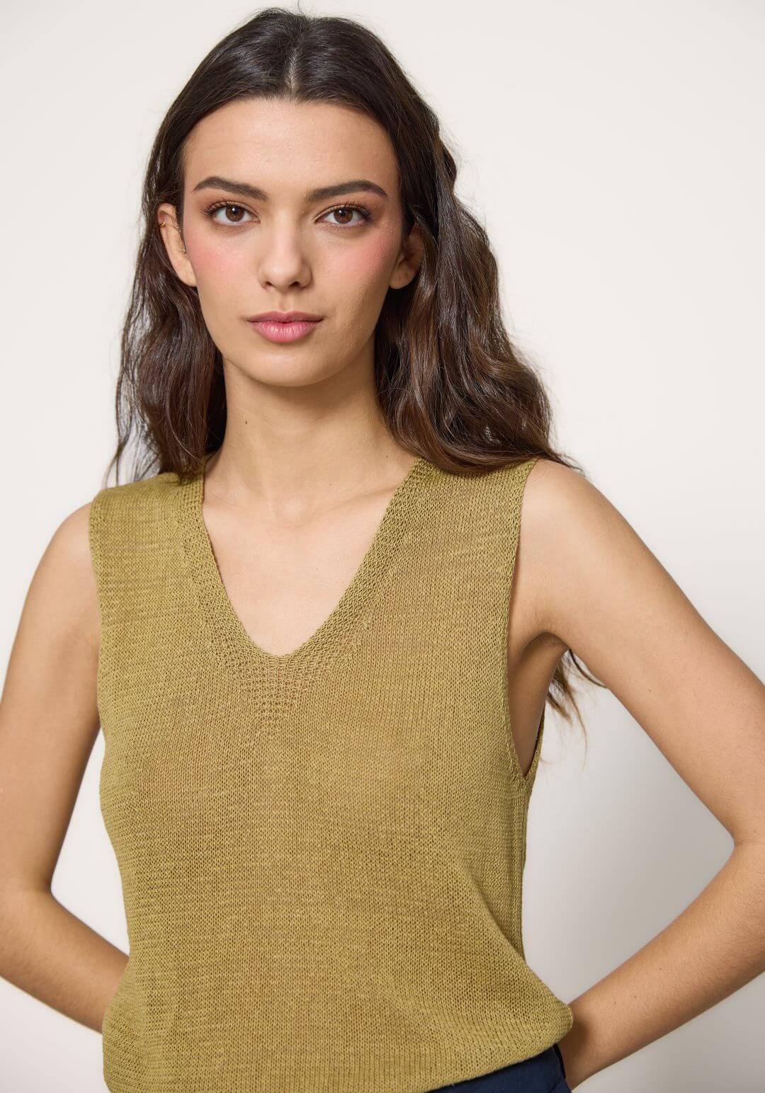 Projetado pela Md`m para mulheres decididas e atraentes, inspira-se nesta coleção em viagens ao redor do mundo. Pense em roupas brilhantes e bonitas, com prints únicos. Bordados inconfundíveis, que a levarão bela até ao final da jornada de trabalho. Assim é este tope de malha verde da Md`m. Apresenta decote redondo e mangas à cava. Pode ser usado com calça para baixo, além disso, pode combinar com sapato alto. A modelo está a vestir o tamanho S.