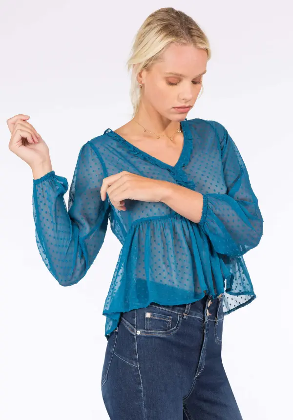 CConhecida por seu estilo urbano e design incomum, a Tiffosi incorpora detalhes inovadores. Combinados com silhuetas inspiradas em streetwear e uma estética jovial. Assim é esta túnica azul c/folho no decote da Tiffosi. Tem manga comprida com elástico no punho e decote em bico. Para parte de baixo combina na perfeição com jeans, mas dentro do mesmo estilo. A modelo está a vestir o S.