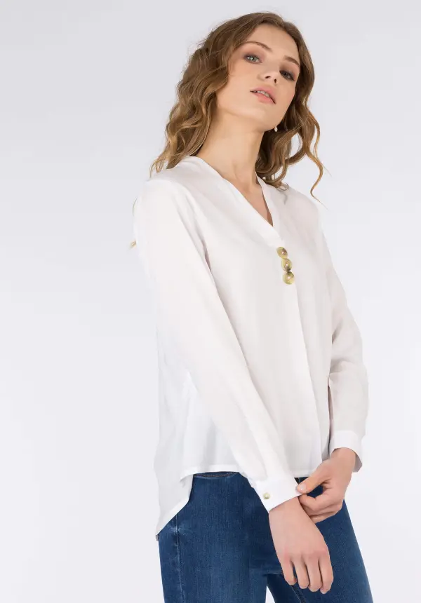Conhecida por seu estilo urbano e design incomum, a Tiffosi incorpora detalhes inovadores. Combinados com silhuetas inspiradas em streetwear e uma estética jovial. A marca foi lançada em 1981 e oferece produtos de qualidade a preços acessíveis, que contam histórias e inspiram um estilo de vida. Assim é esta túnica branca c/ botões da Tiffosi. Apresenta decote em bico, com três botões na frente, mangas a 3/4. Para parte de cima combina na perfeição com casaco ou blusão, mas para parte de baixo pode ser usado com jeans ou calça de sarja. A modelo está a vestir o tamanho S.