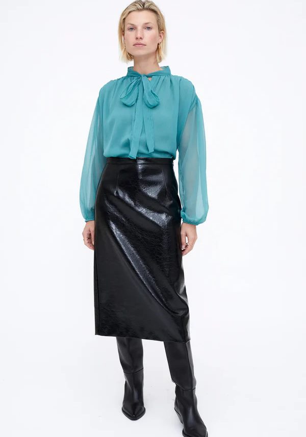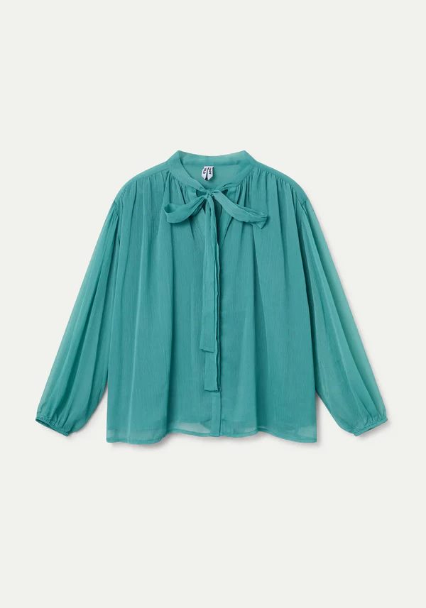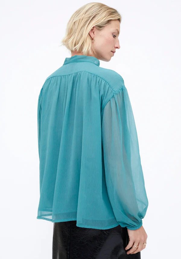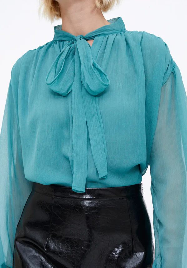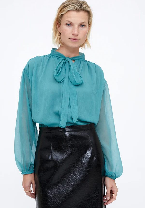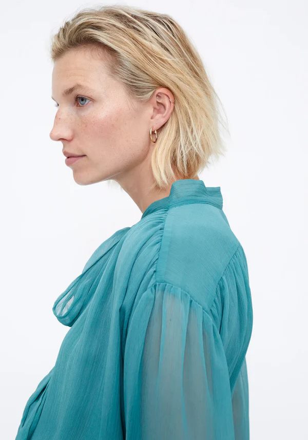 Pense em silhuetas que exalam elegância atemporal, transbordam de funcionalidade, conforto e elegância sutil. Pois bem essa era voltou aos dias de hoje. Assim é esta túnica chiffon light blue da Wild Pony. Apresenta decote redondo com laço e manga comprida. Para parte de baixo combina na perfeição com calça mas a dar com o tom. A manequim está a vestir o tamanho S.