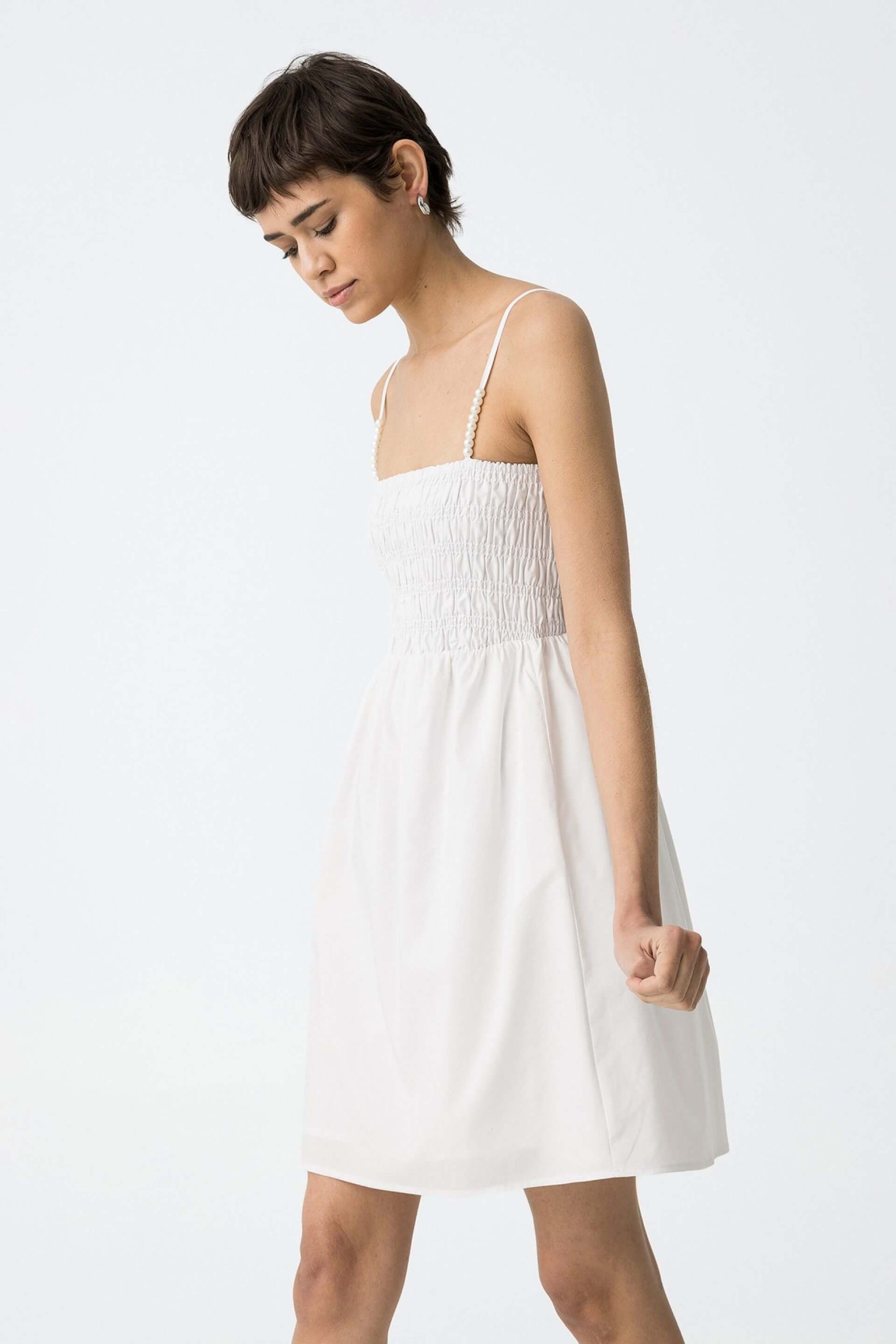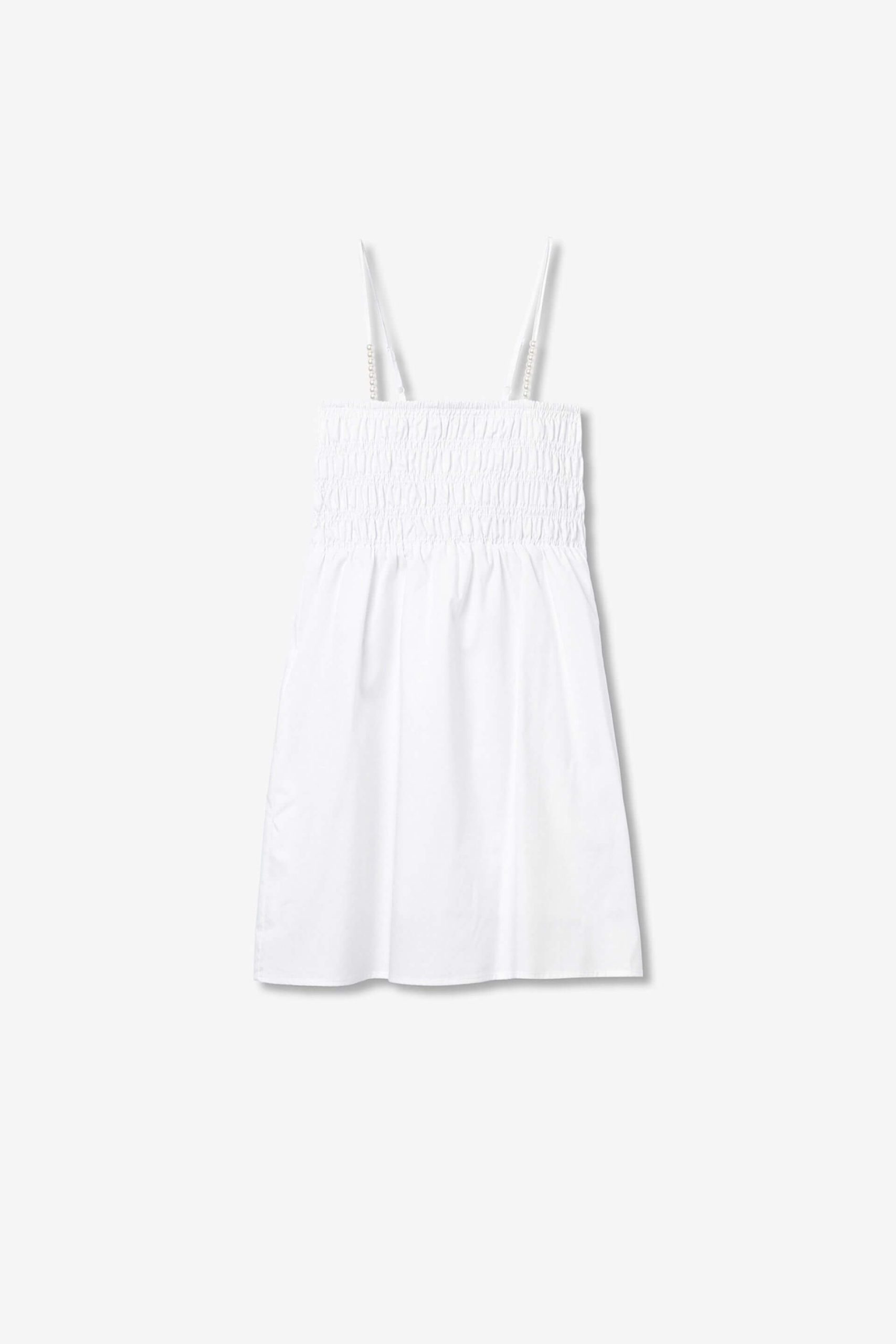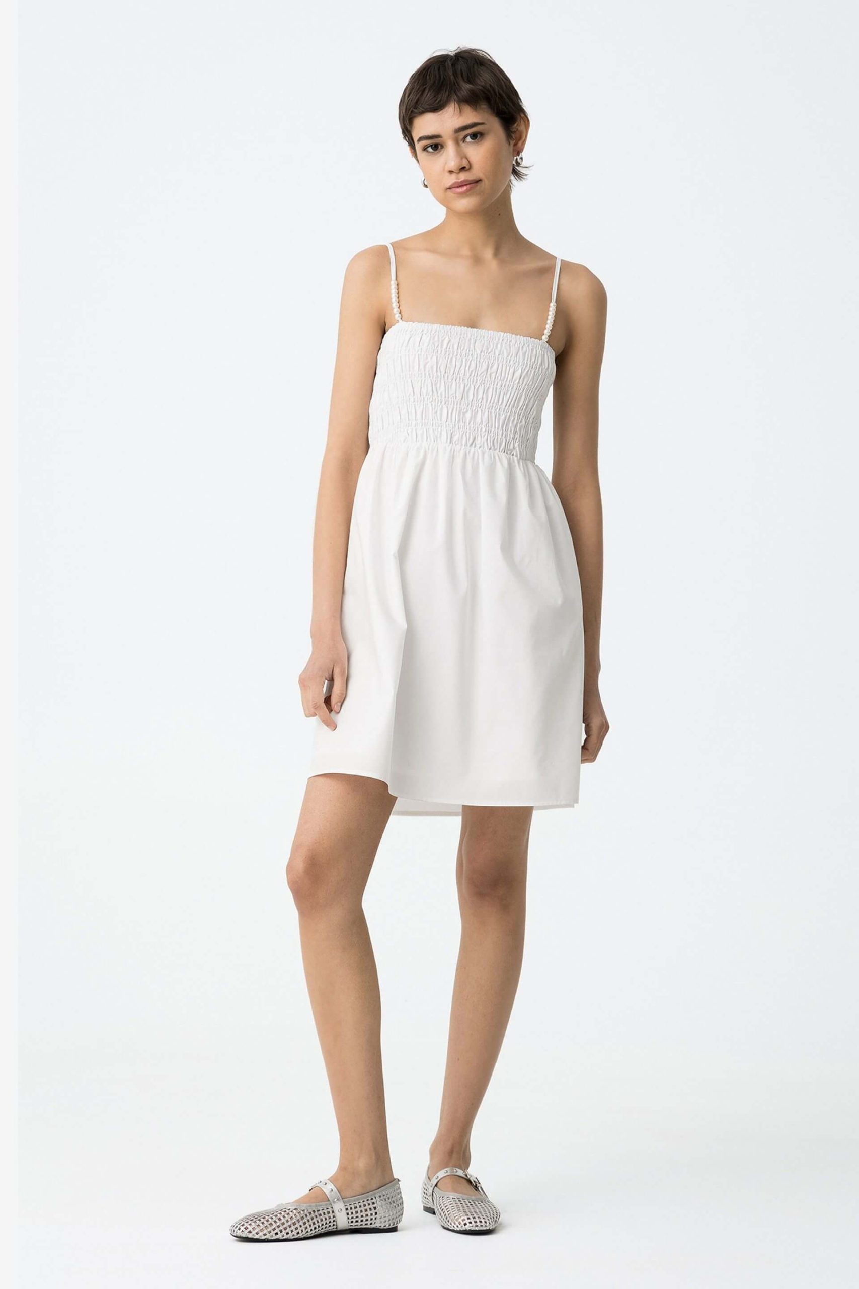 Pense em silhuetas dos anos 80, painéis pesados, denim super skinny e estampas de bandana. Pois bem essa era voltou aos dias de hoje. Assim é este vestido branco de alças da Tiffosi. Apresenta alças, elásticos de canela. Para parte de cima combina na perfeição com casaco de ganga mas a dar com o tom. A manequim está a vestir o tamanho S.