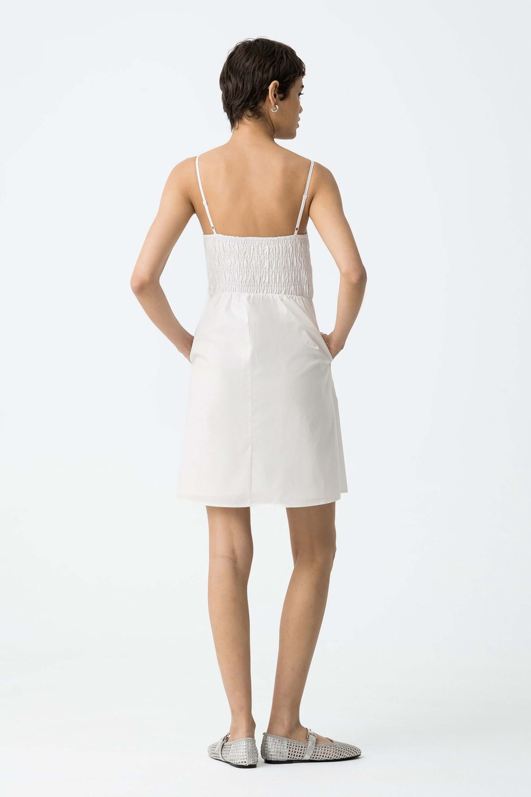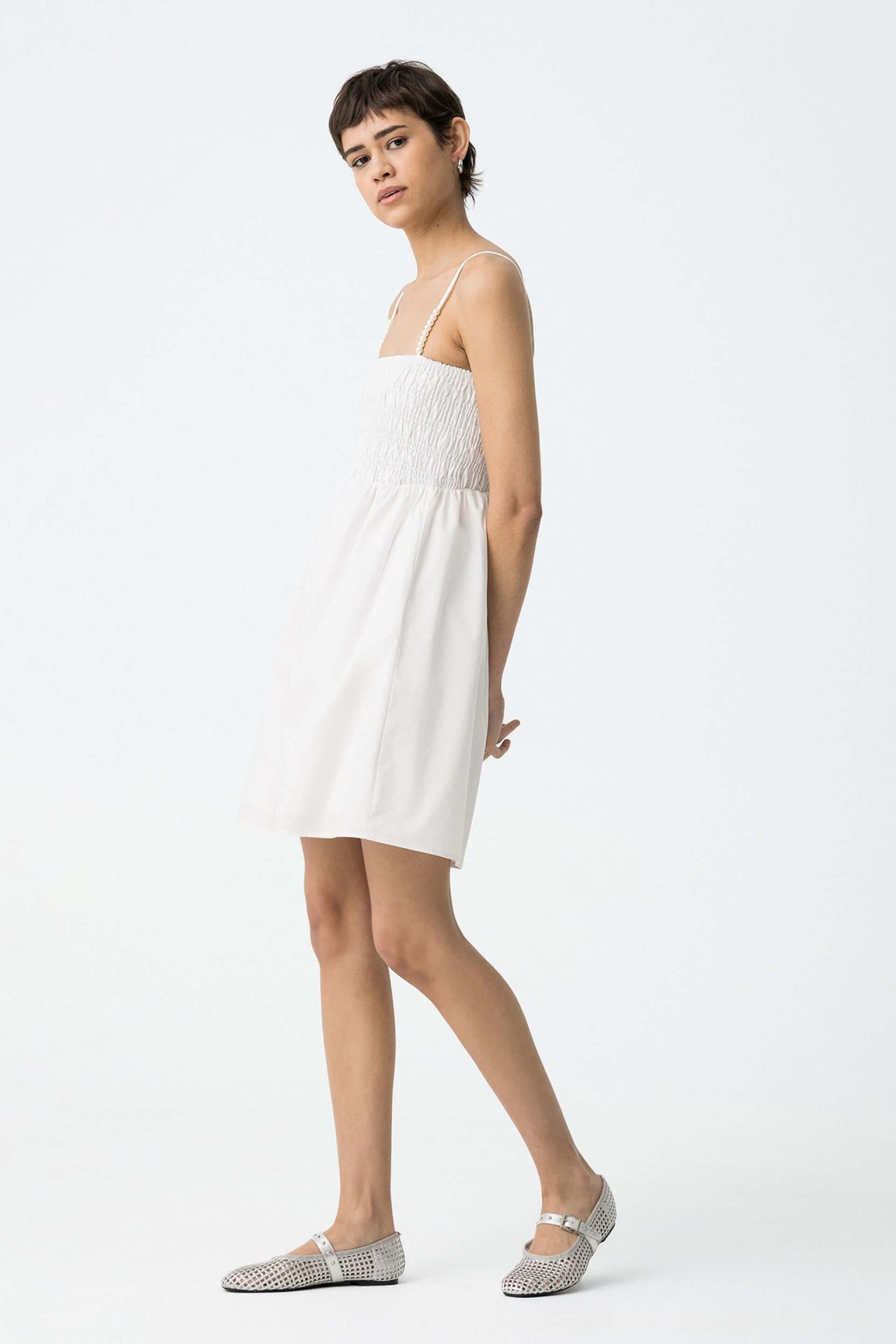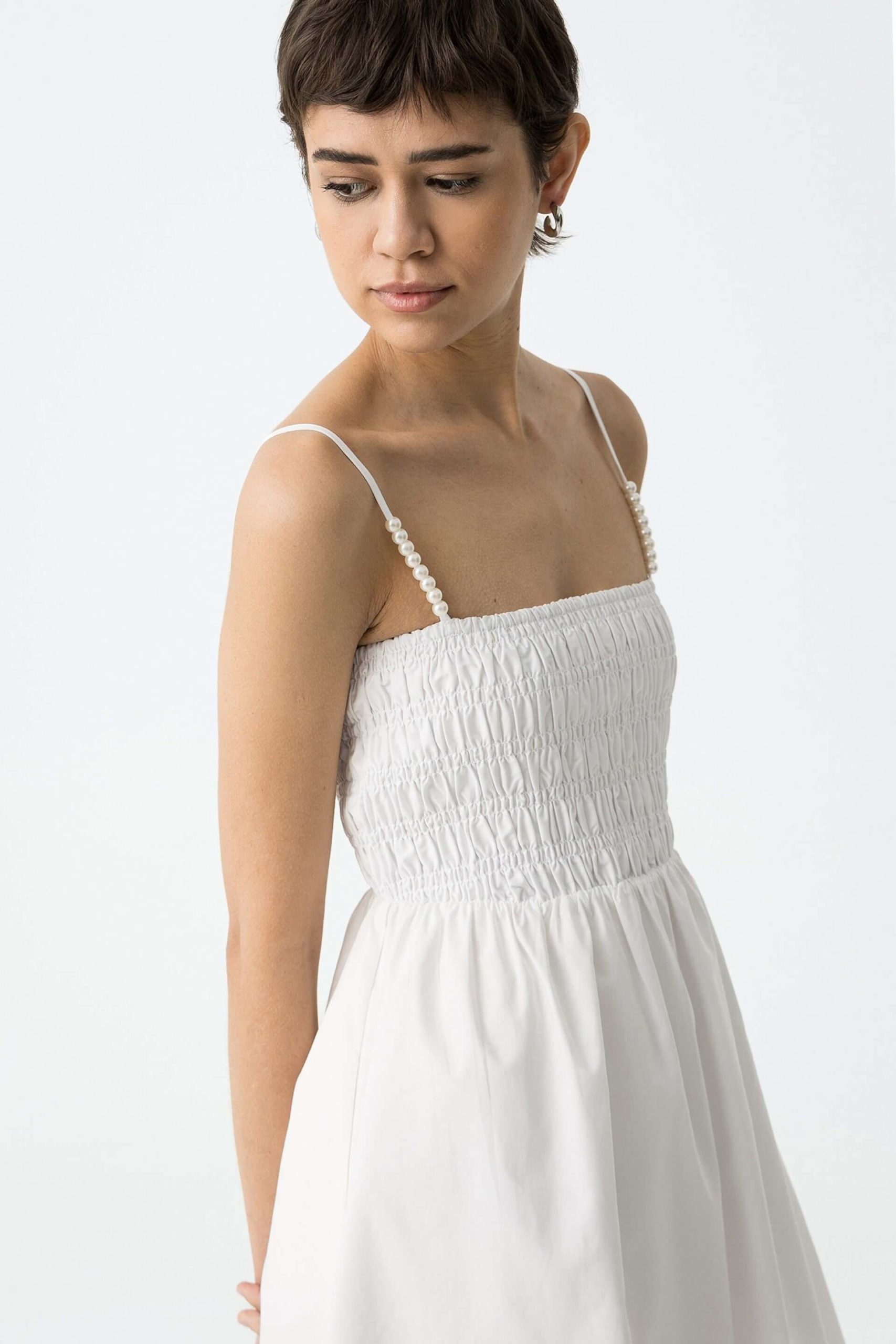 Pense em silhuetas dos anos 80, painéis pesados, denim super skinny e estampas de bandana. Pois bem essa era voltou aos dias de hoje. Assim é este vestido branco de alças da Tiffosi. Apresenta alças, elásticos de canela. Para parte de cima combina na perfeição com casaco de ganga mas a dar com o tom. A manequim está a vestir o tamanho S.