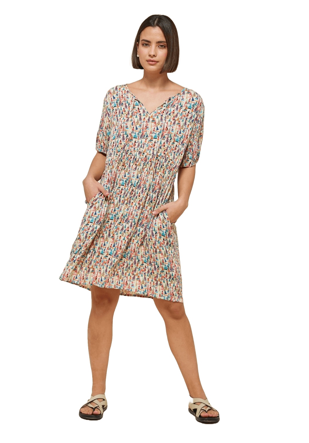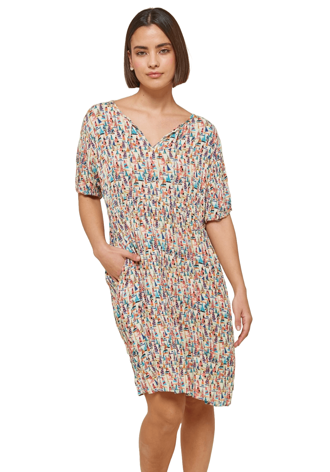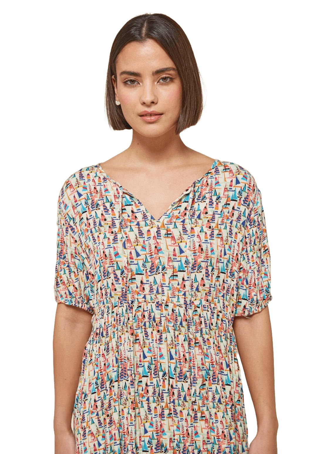 Projetado pela Md`m para mulheres decididas e atraentes, inspira-se nesta coleção em viagens ao redor do mundo. Pense em roupas brilhantes e bonitas, com prints únicos. Bordados inconfundíveis, que a levarão bela até ao final da jornada da trabalho. Assim é este vestido c/ print barcos coloridos da Md`m. Apresenta manga curta, decote em bico e carcela com botões. Pode ser usado com casaco ou blusão por cima. A modelo está a vestir o tamanho 36.