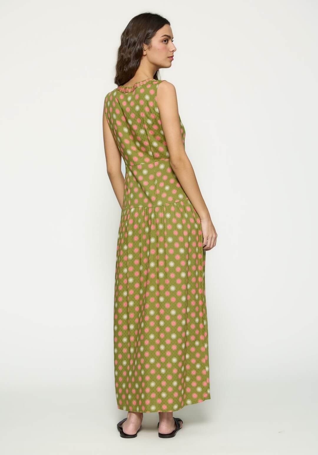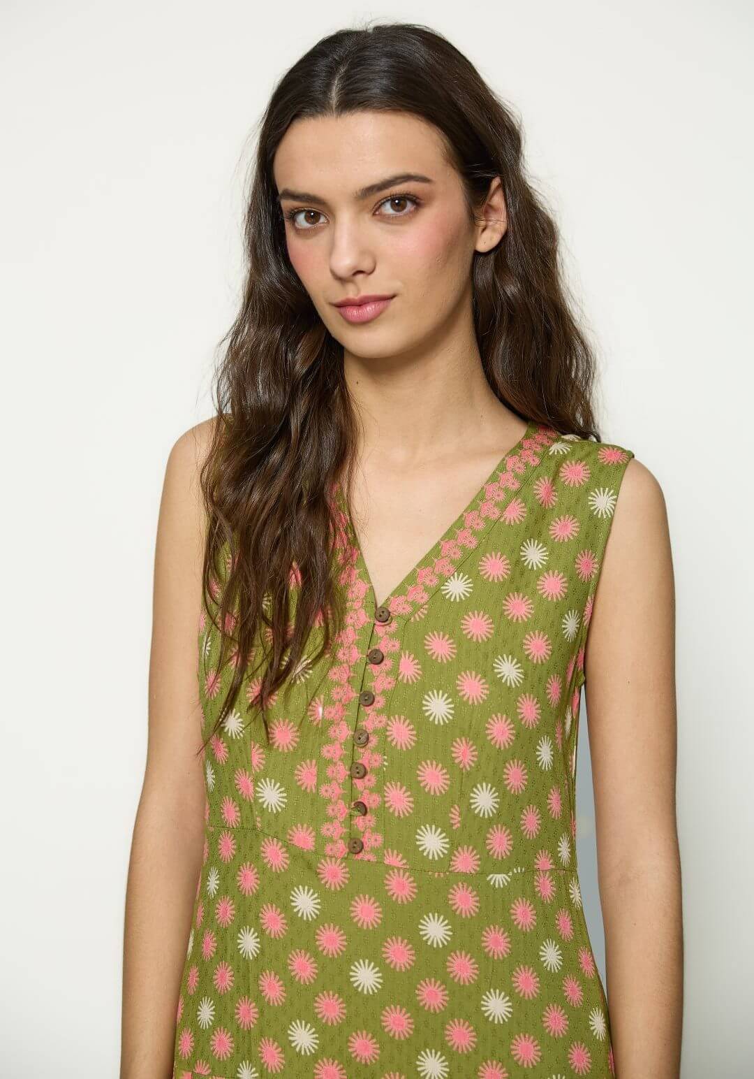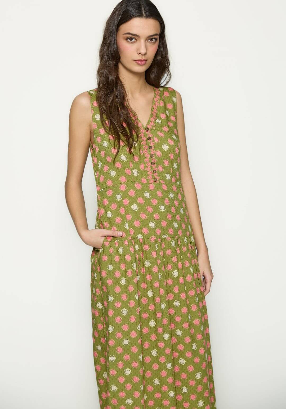 Projetado pela Md`m para mulheres decididas e atraentes, inspira-se nesta coleção em viagens ao redor do mundo. Pense em roupas brilhantes e bonitas, com prints únicos. Bordados inconfundíveis, que a levarão bela até ao final da jornada da trabalho. Assim é este vestido comprido c/ print verde da Md`m. Apresenta decote em bico manga cava e botões. Pode ser usado com casaco ou blusão por cima. A modelo está a vestir o tamanho 36.