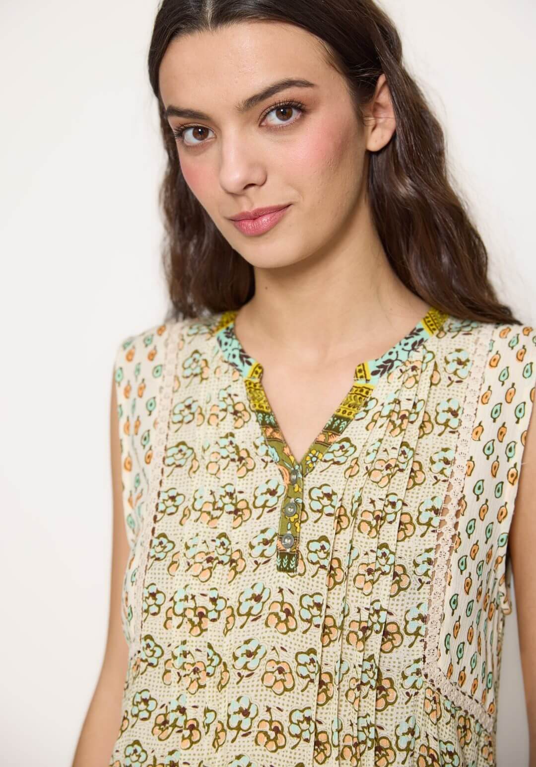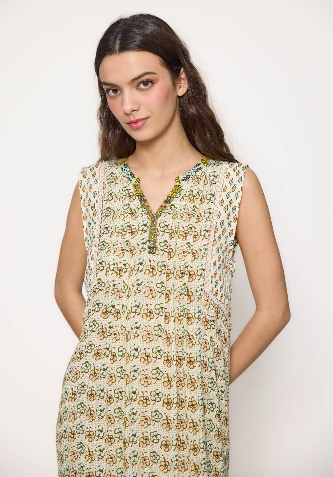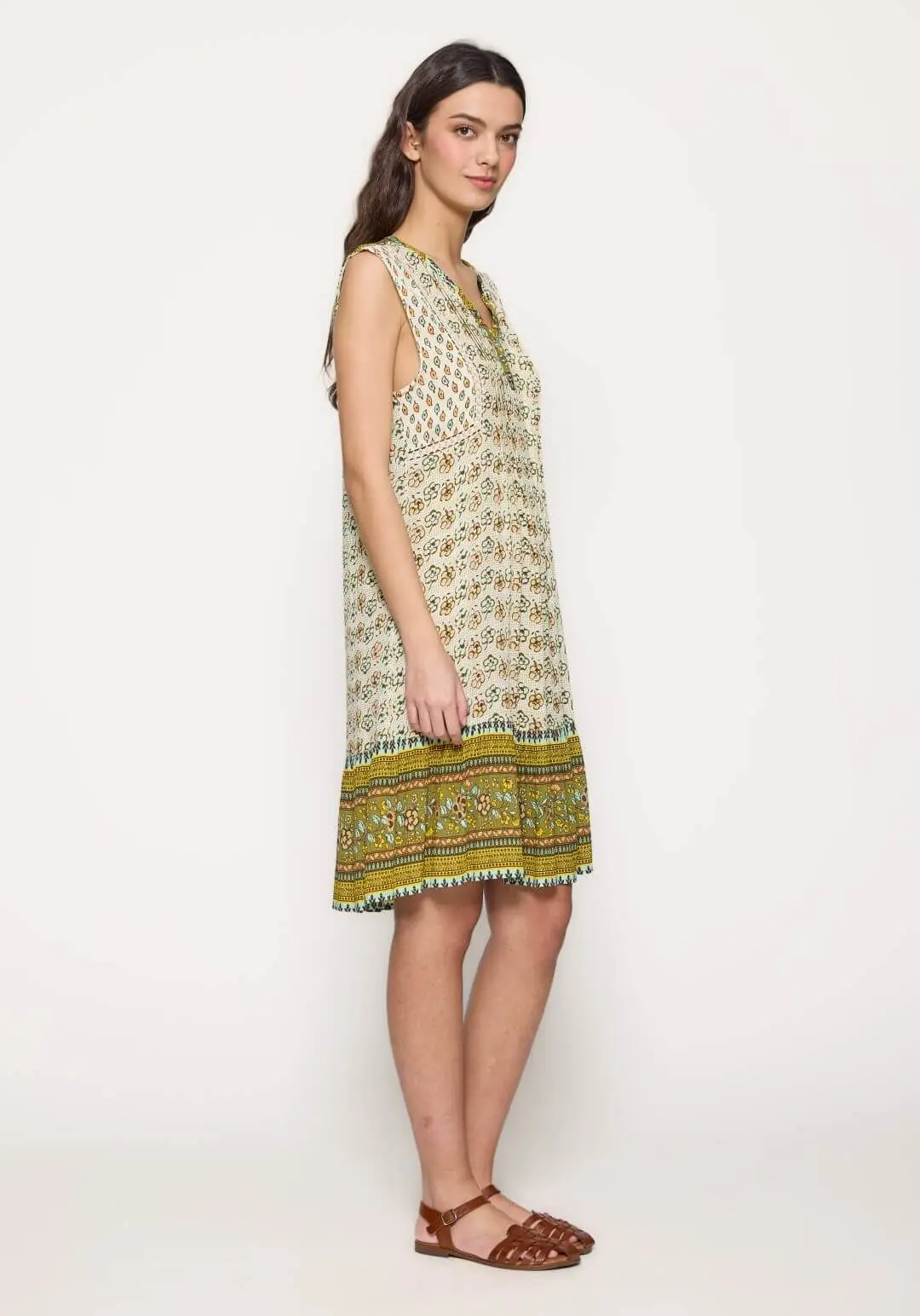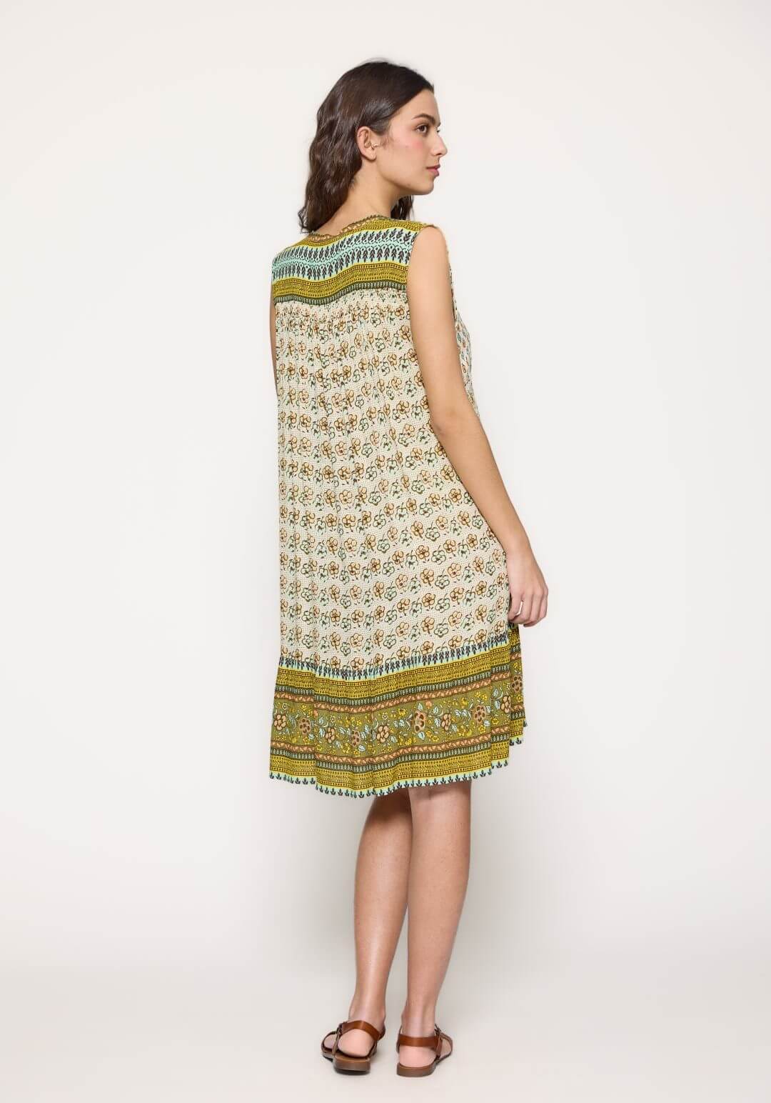 Projetado pela Md`m para mulheres decididas e atraentes, inspira-se nesta coleção em viagens ao redor do mundo. Pense em roupas brilhantes e bonitas, com prints únicos. Bordados inconfundíveis, que a levarão bela até ao final da jornada da trabalho. Assim é este vestido curto verde de cavas da Md`m. Apresenta decote em bico e manga cava. Pode ser usado com casaco ou blusão por cima. A modelo está a vestir o tamanho 36.