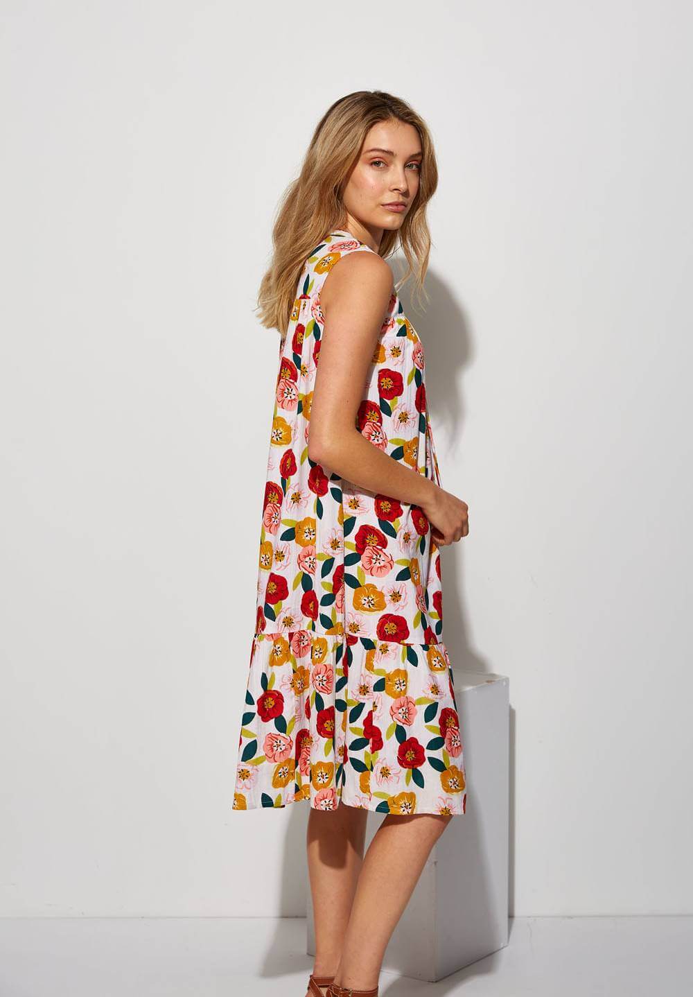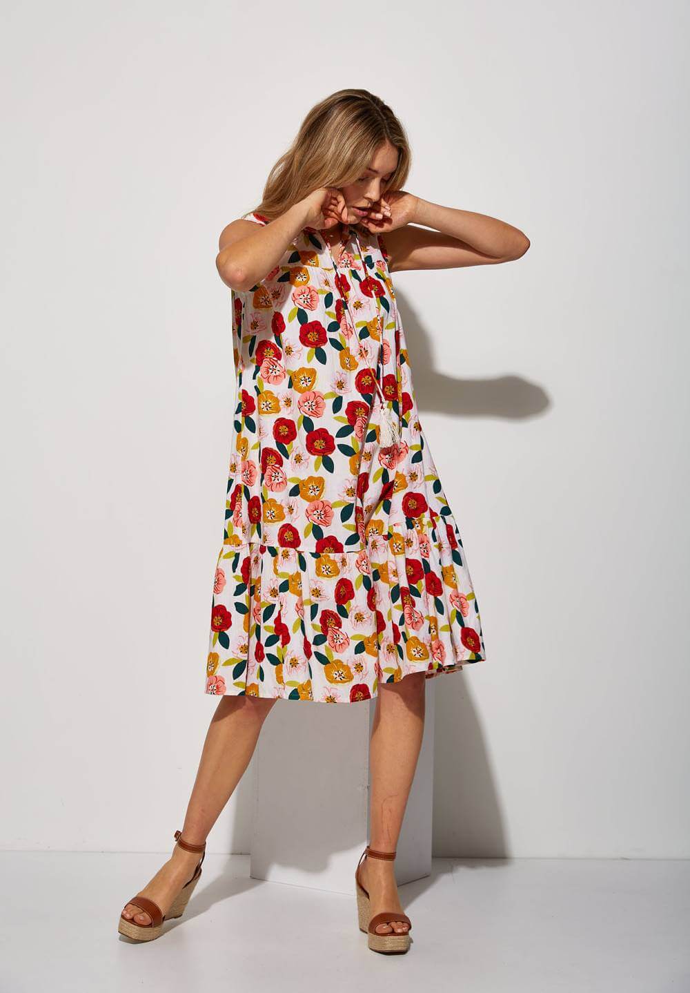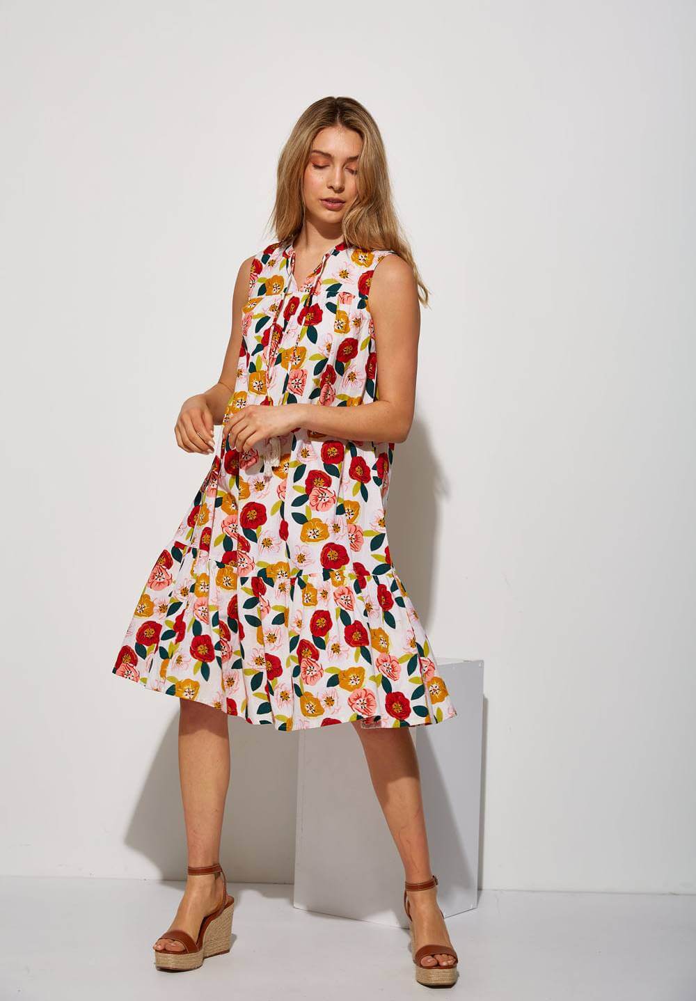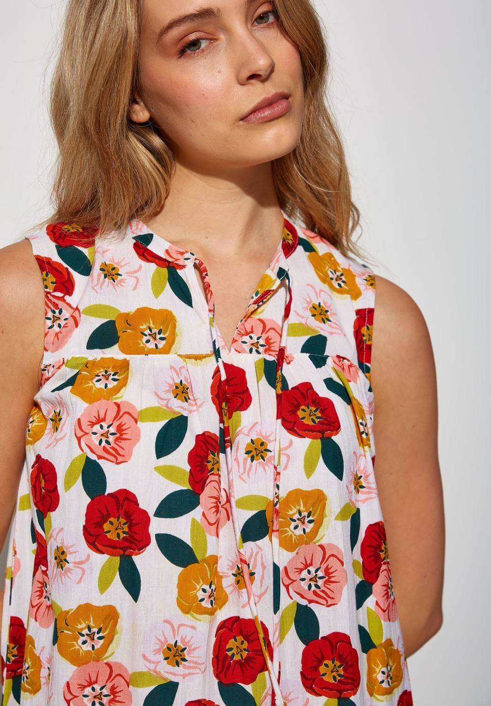 Projetado pela Md`m para mulheres decididas e atraentes, inspira-se nesta coleção em viagens ao redor do mundo. Pense em roupas brilhantes e bonitas, com prints únicos. Bordados inconfundíveis, que a levarão bela até ao final da jornada da trabalho. Assim é este vestido de cavas c/ print floral da Md`m. Apresenta um decote redondo e manga à cava. Pode ser usado com casaco ou blusão por cima. A modelo está a vestir o tamanho 36.