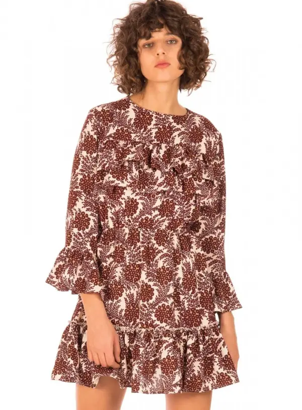 Vestido em print floral com folho