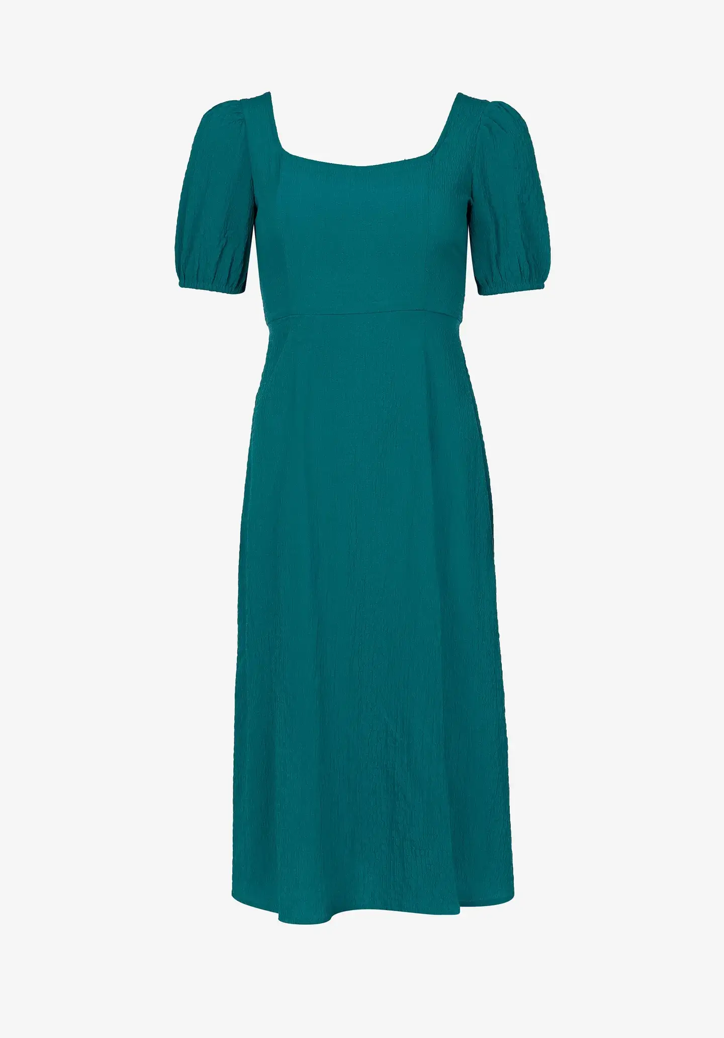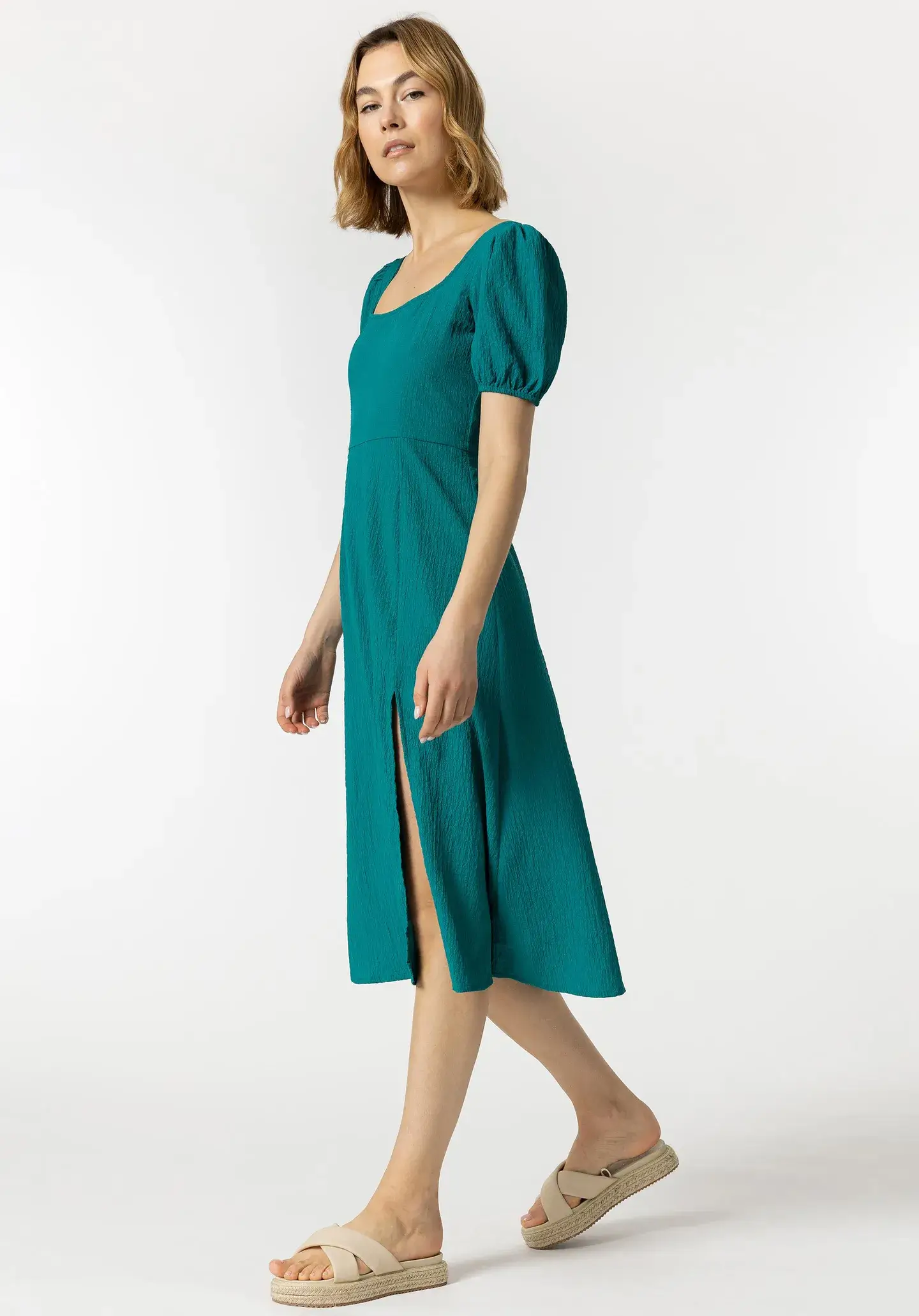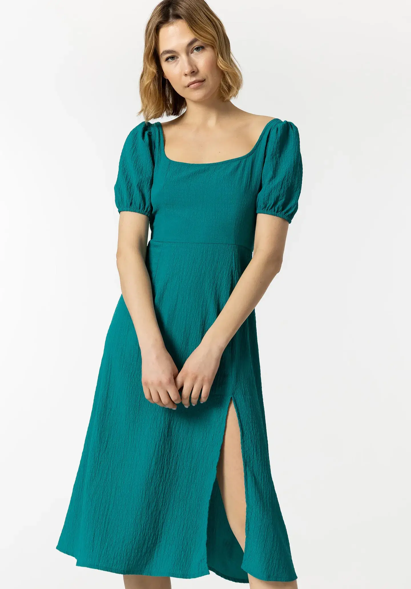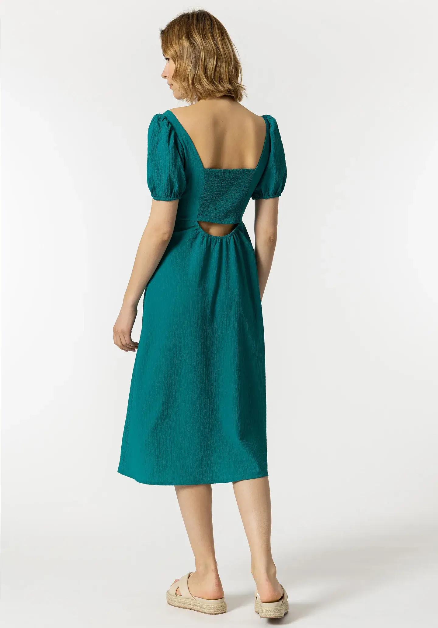Pense em silhuetas dos anos 80, painéis pesados, denim super skinny e estampas de bandana. Pois bem essa era voltou aos dias de hoje. Assim é este vestido midi azul indigno da Tiffosi. Apresenta decote quadrado, manga curta e racha na frente. Para parte de baixo combina na perfeição com sandálias mas a dar com o tom. A manequim está a vestir o tamanho S.