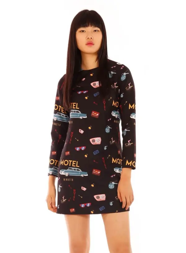 Carregada do espírito alegre dos anos setenta, a casa de moda Minueto combina o romantismo com a feminilidade. Pois prova que a marca vive de telas com formas arrojadas prints únicos e extravagantes. Elaborado em malha de poliéster e elastano, assim é este vestido motel da Minueto. Tem um decote redondo, mangas compridas e um comprimento acima do joelho. A parte de trás é direita. Pode combinar com sapatilhas e casaco de ganga ou pele sintética para pôr por cima. A manequim está a vestir o tamanho S.