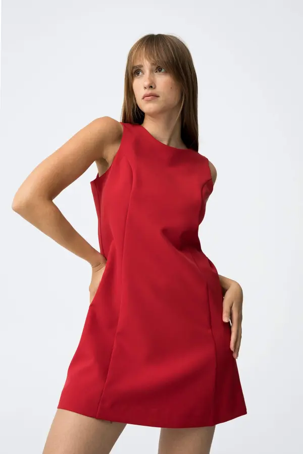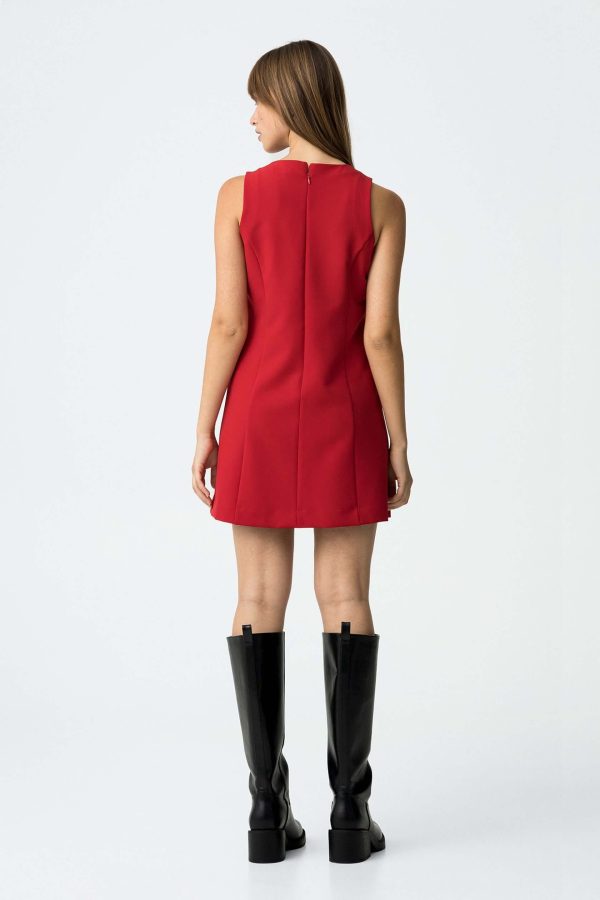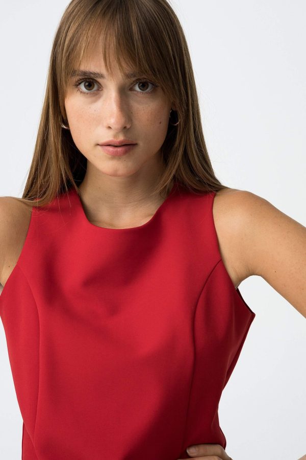 Pense em silhuetas dos anos 80, painéis pesados, denim super skinny e estampas de bandana. Pois bem essa era voltou aos dias de hoje. Assim é este vestido vermelho de cavas da Tiffosi. Apresenta decote redondo e manga à cava. Para parte de cima combina na perfeição com casaco de ganga mas a dar com o tom. A manequim está a vestir o tamanho S.